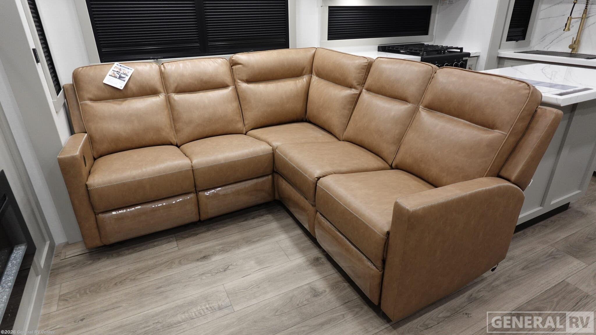 Brinkley Model G toy hauler 4155 highlights: Front Private Bunkroom L-Sofa with 4x Recliners Pull-Out Pantry/Utility Closet Loft/Storage Air Compressor with Retractable Hose Bath and a Half Four Awnings This toy hauler for a large group! The front private bunkroom includes bunk beds with cubbies plus a wardrobe to keep this space tidy. The private bedroom is just off of the bunkroom, which will make it easy to keep an eye on little ones. Once you've made the king-size bed, you can grab your clothes from the dresser with a sliding top, then clean up in the full bathroom. Breakfast can be made on the 24" GE Profile oven with a four-burner range or in the GE Profile convection microwave. The kitchen island includes two stools where you can dine at, or you can sit at the convertible table/L-desk. An L-sofa in the living area sits across an entertainment center with a fireplace, and there is more seating space in the 11' garage. Here, you'll find a loft/storage with a twin bed, a max space half bath with fold-away walls and a sink, plus independent dual sofas with a Fold-N Stow Table and drop-down bed above. With any Model G toy hauler fifth wheel by Brinkley you will enjoy luxurious amenities, tons of storage space, and innovative features that have been developed and tested in the real world. Durable construction includes an industry leading PDI process, an industry best insulation package, and reinforced and walkable slide roofs. Some of the exterior features you'll find are a 3-way pass-through with a multi-functional flip-up bulkhead wall, under I-beam storage, a MAX-Vision reverse lighting system, and a low-maintenance roof to name a few. A Rockford Fosgate audio system comes standard, along with a Full app-based coach control system (iOS & Android) that lets you control your fifth wheel's functions right from your mobile device. You will find the solar system with a designated storage area to be ultra convenient, plus there is a FlexPower 5500 with a dual fuel inverter generator for all your power needs. Head inside to find a residential interior with Brinkley's CraftSense wood trim construction, floating entrance steps, integrated window screens and insulated blackout blinds, and residential solid surface countertops plus backsplash. You will also enjoy the neon shower lighting and recessed medicine cabinets in the bath, plus motion activated LED bed lights and dual bedside outlets in the bedroom. Choose a Model G toy hauler fifth wheel to experience all the luxury it has to offer!