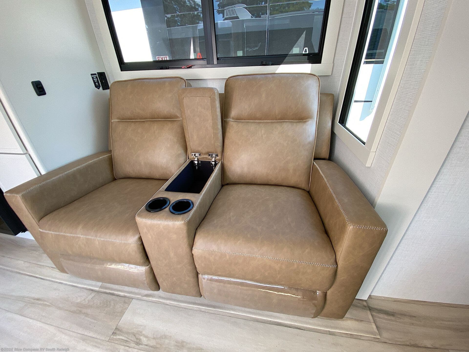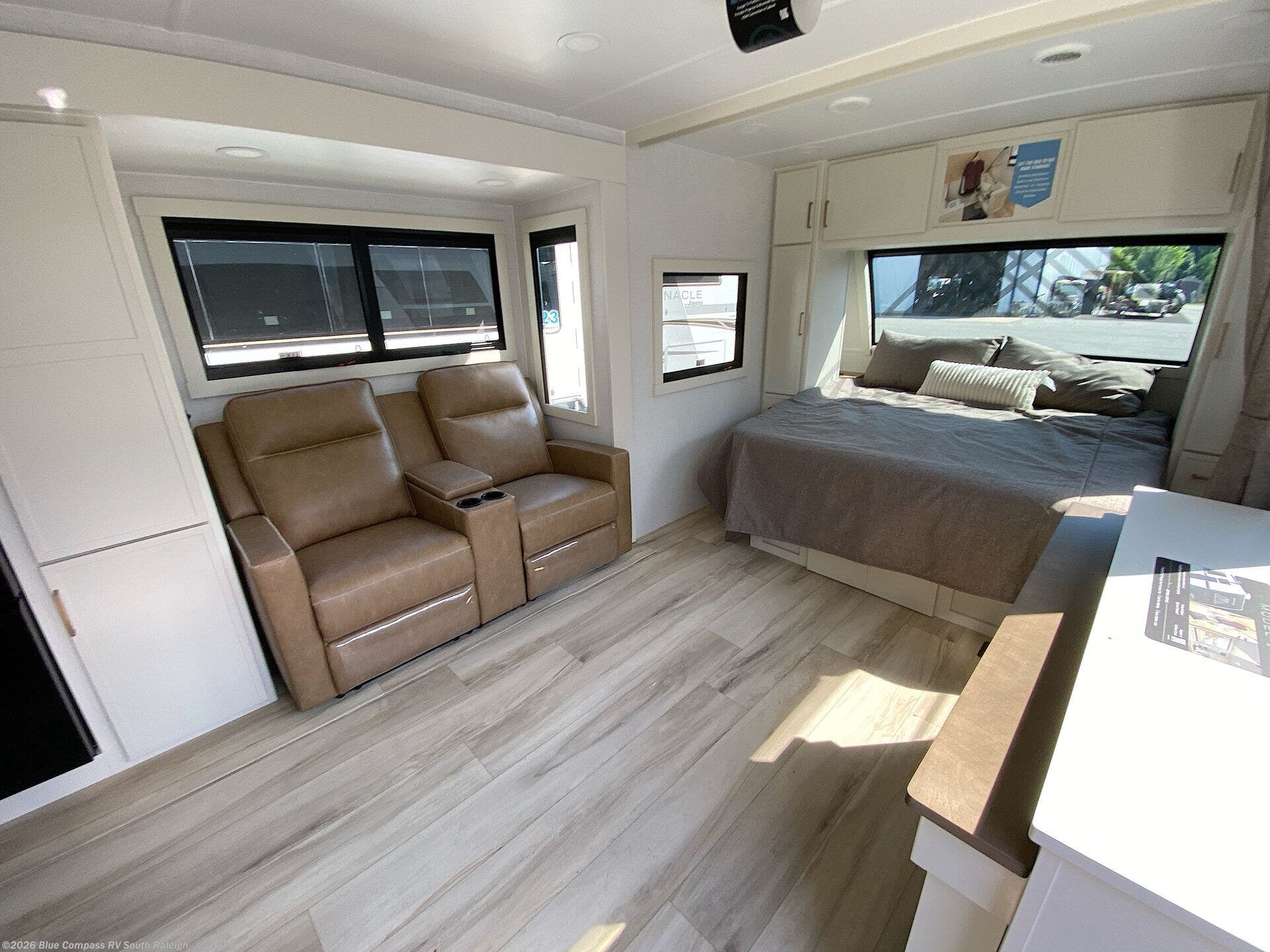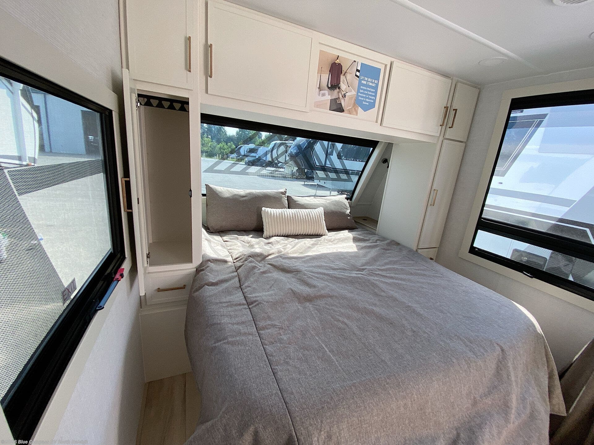 You'll love the amount of space you have in this travel trailer thanks to the large slide out in the main living area. There is comfy theater seating here, along with the kitchen appliances plus a pantry with drawers and an outlet. And a tri-fold sofa option can be chosen in place of theater seating if you're needing sleeping space for guests. You can dine at the pull-out dining table with a drawer, which is right in front of the pull-down interior/exterior screen. A full bath with a 36" x 30" shower will let you freshen up each day, and the king bed in the front bedroom includes a room divider in front for added privacy!