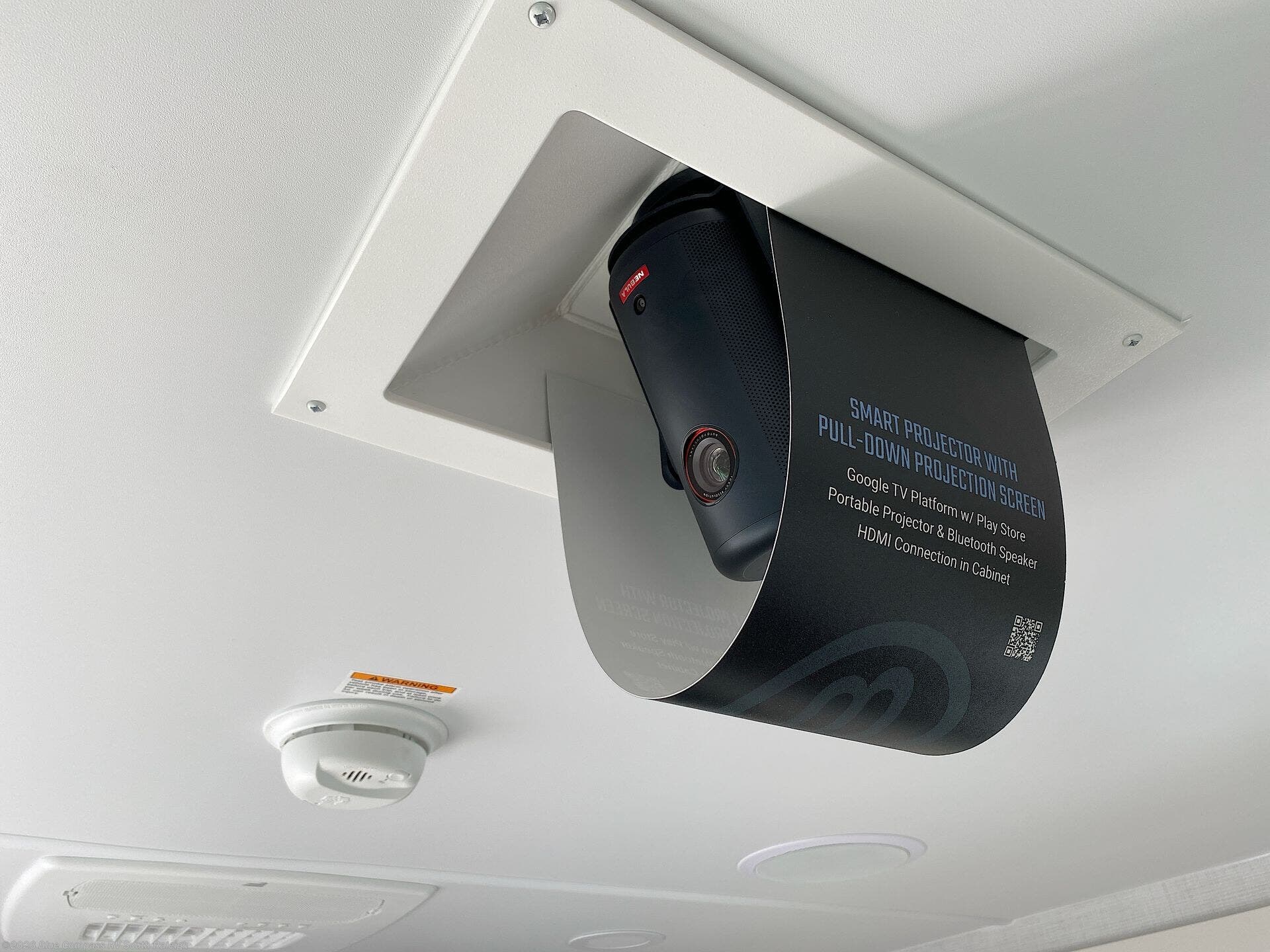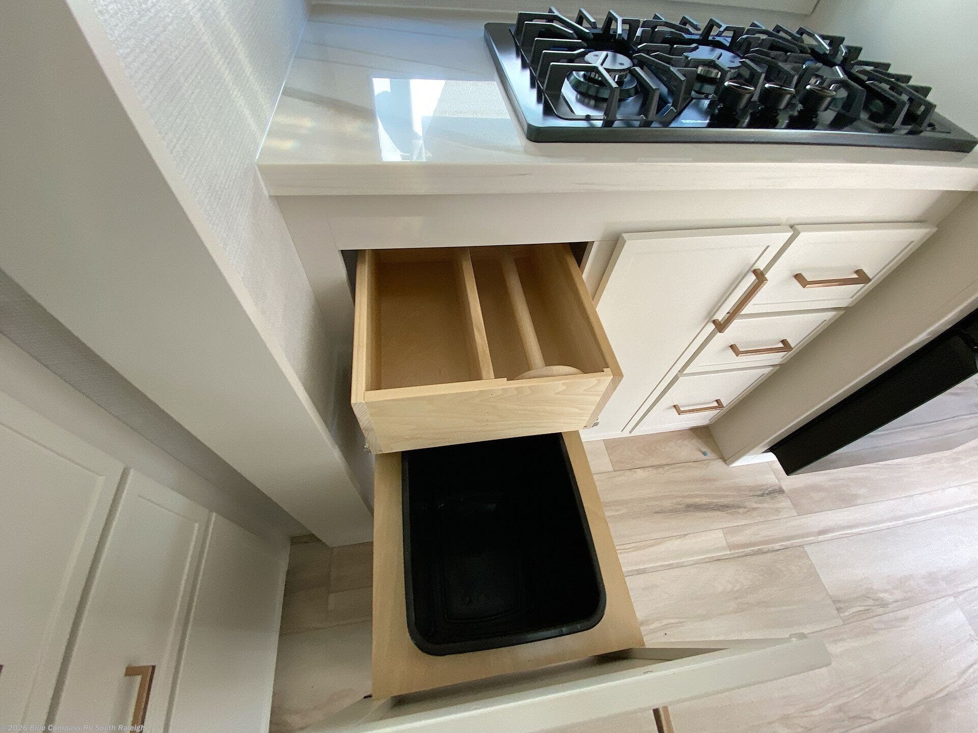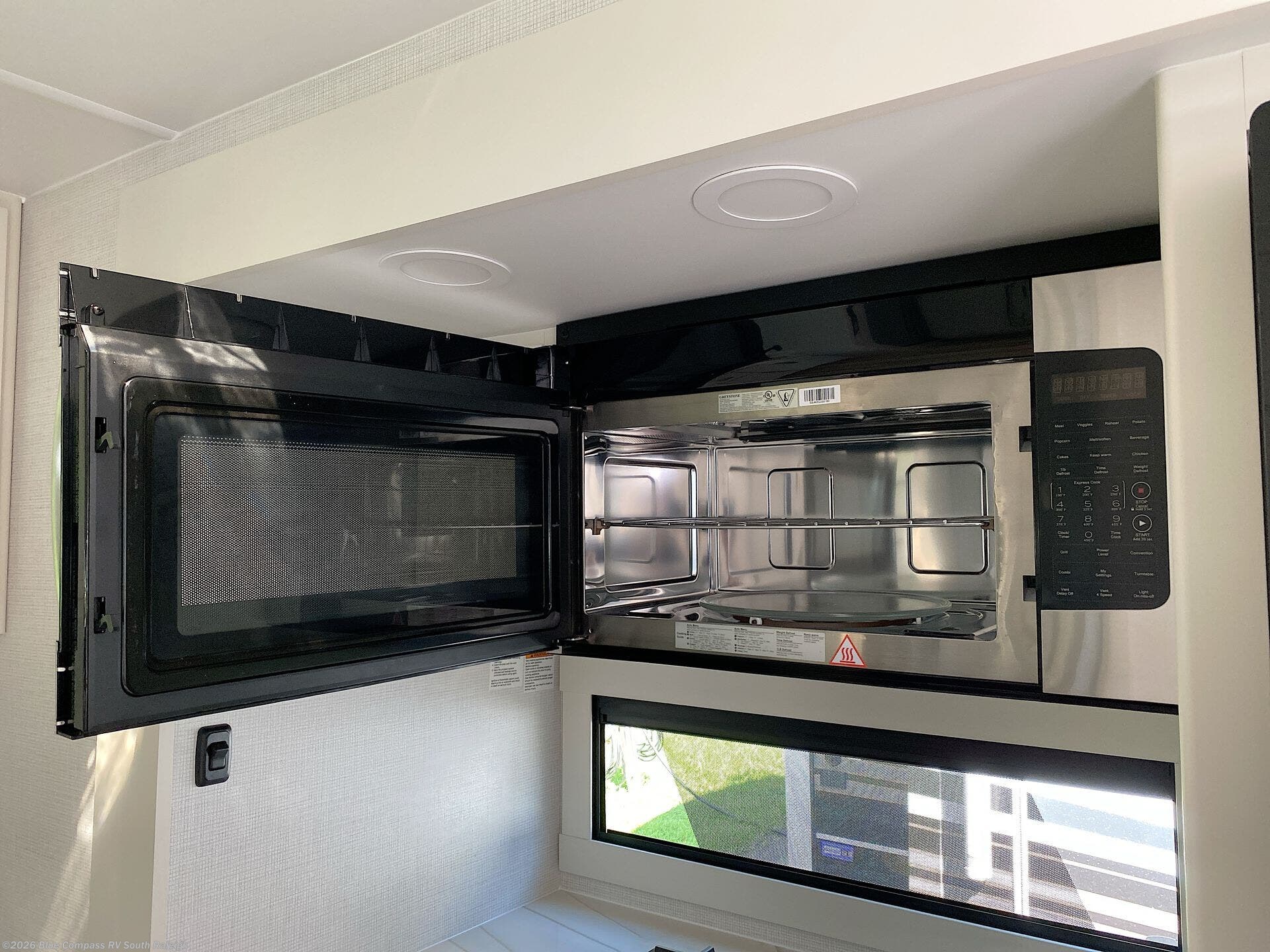 You'll love the amount of space you have in this travel trailer thanks to the large slide out in the main living area. There is comfy theater seating here, along with the kitchen appliances plus a pantry with drawers and an outlet. And a tri-fold sofa option can be chosen in place of theater seating if you're needing sleeping space for guests. You can dine at the pull-out dining table with a drawer, which is right in front of the pull-down interior/exterior screen. A full bath with a 36" x 30" shower will let you freshen up each day, and the king bed in the front bedroom includes a room divider in front for added privacy!