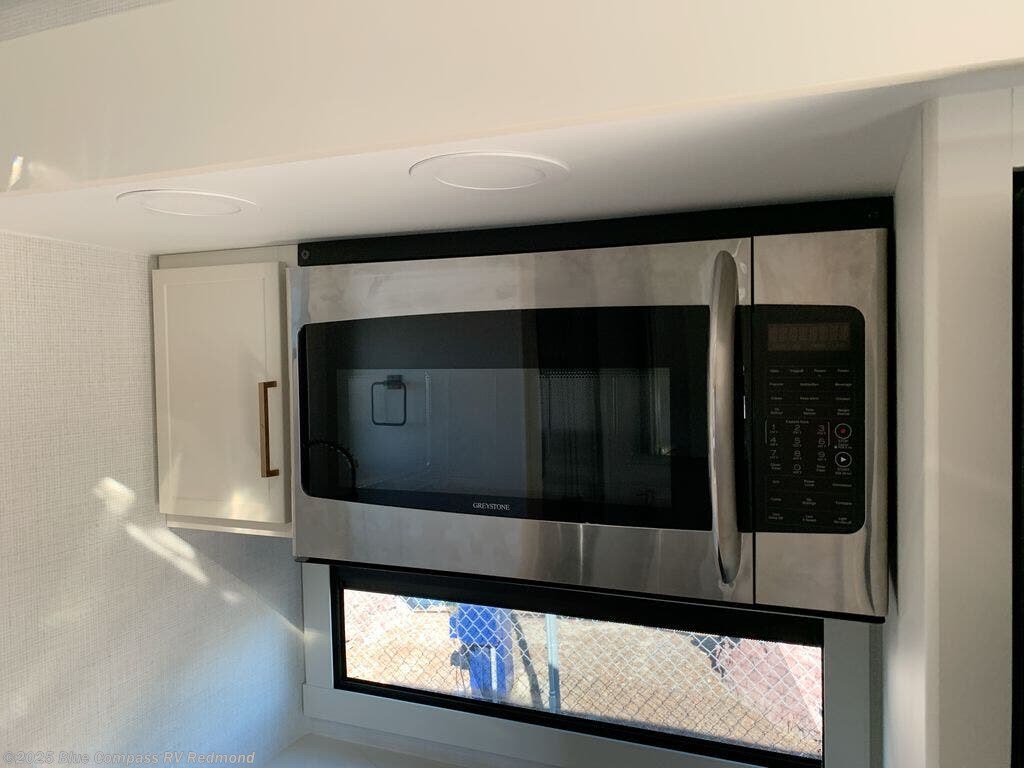 You'll love the amount of space you have in this travel trailer thanks to the large slide out in the main living area. There is comfy theater seating here, along with the kitchen appliances plus a pantry with drawers and an outlet. And a tri-fold sofa option can be chosen in place of theater seating if you're needing sleeping space for guests. You can dine at the pull-out dining table with a drawer, which is right in front of the pull-down interior/exterior screen. A full bath with a 36" x 30" shower will let you freshen up each day, and the king bed in the front bedroom includes a room divider in front for added privacy!