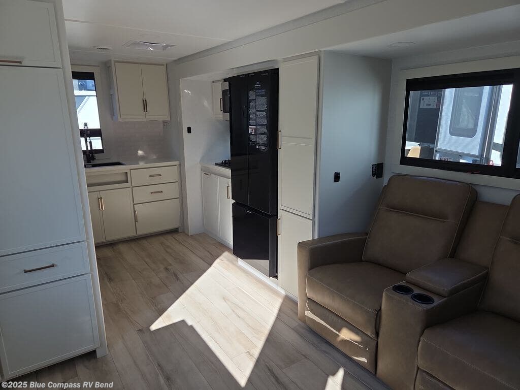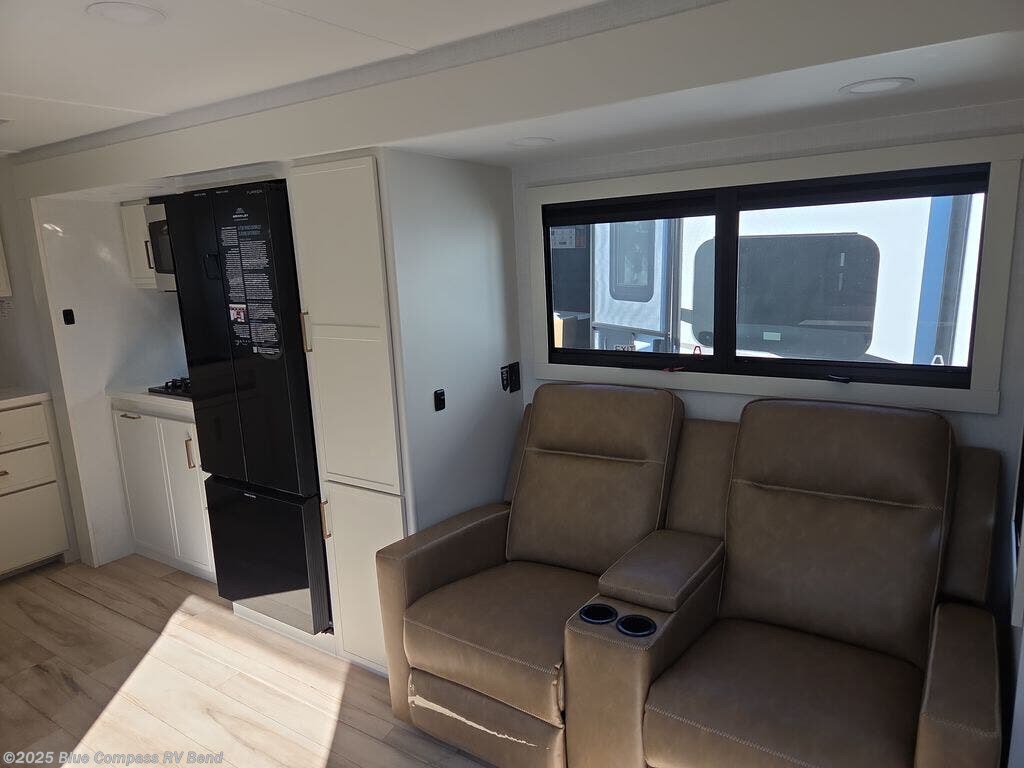You'll love the amount of space you have in this travel trailer thanks to the large slide out in the main living area. There is comfy theater seating here, along with the kitchen appliances plus a pantry with drawers and an outlet. And a tri-fold sofa option can be chosen in place of theater seating if you're needing sleeping space for guests. You can dine at the pull-out dining table with a drawer, which is right in front of the pull-down interior/exterior screen. A full bath with a 36" x 30" shower will let you freshen up each day, and the king bed in the front bedroom includes a room divider in front for added privacy!