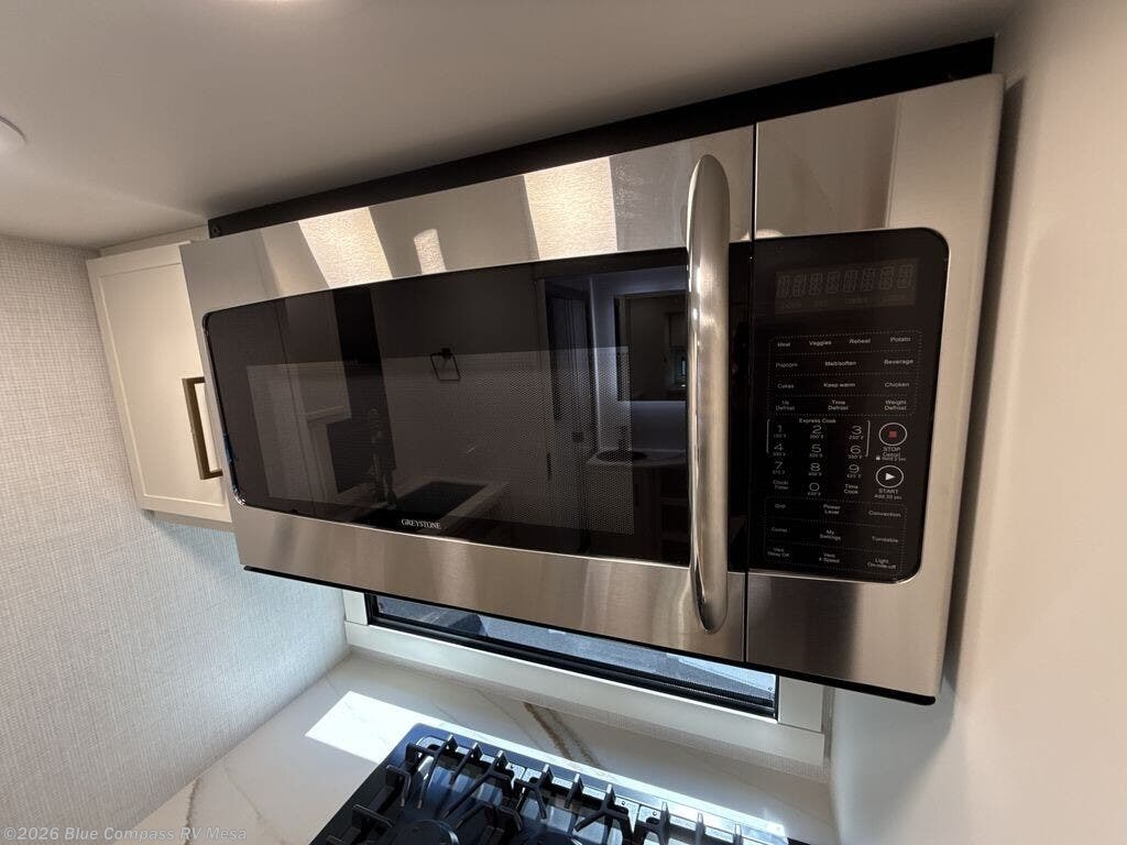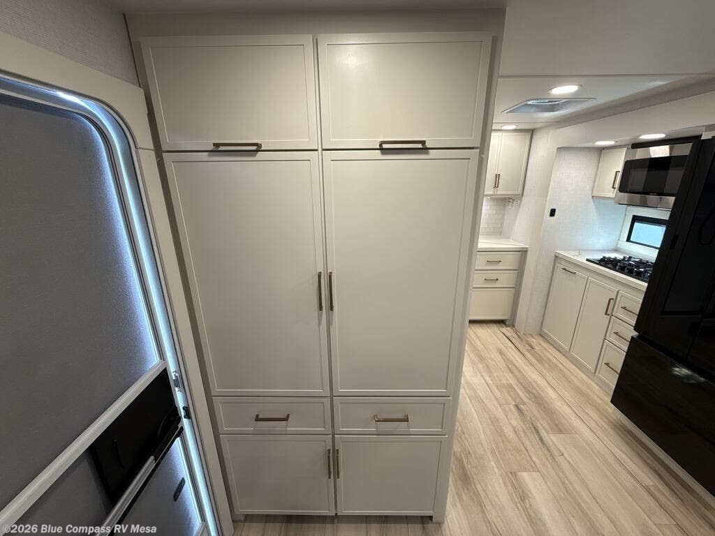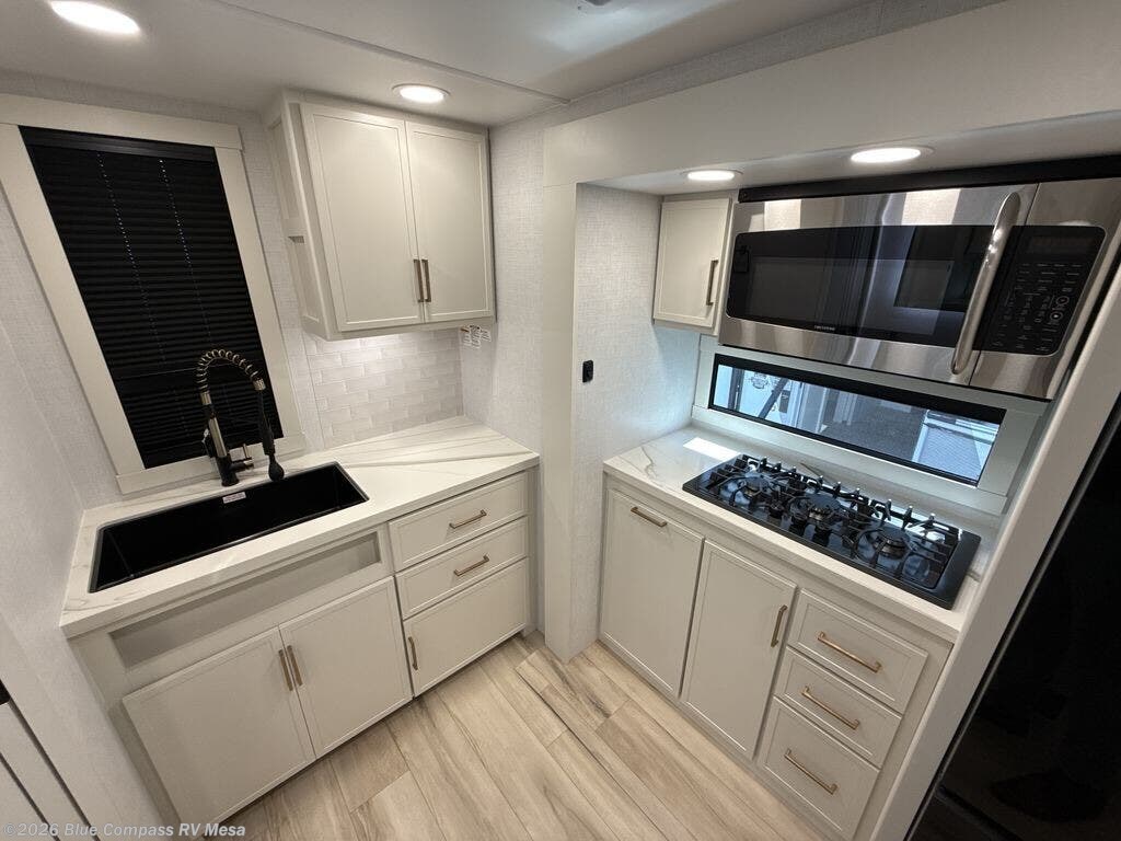 You'll love the amount of space you have in this travel trailer thanks to the large slide out in the main living area. There is comfy theater seating here, along with the kitchen appliances plus a pantry with drawers and an outlet. And a tri-fold sofa option can be chosen in place of theater seating if you're needing sleeping space for guests. You can dine at the pull-out dining table with a drawer, which is right in front of the pull-down interior/exterior screen. A full bath with a 36" x 30" shower will let you freshen up each day, and the king bed in the front bedroom includes a room divider in front for added privacy!