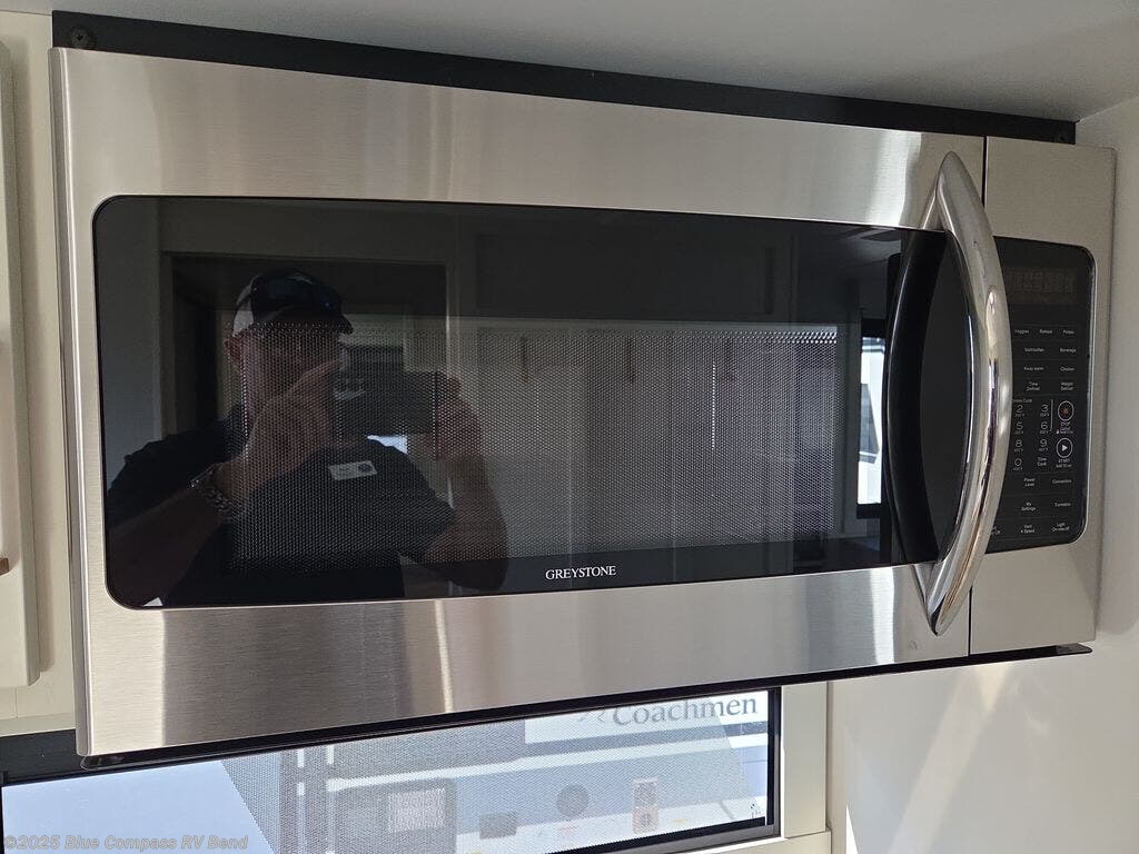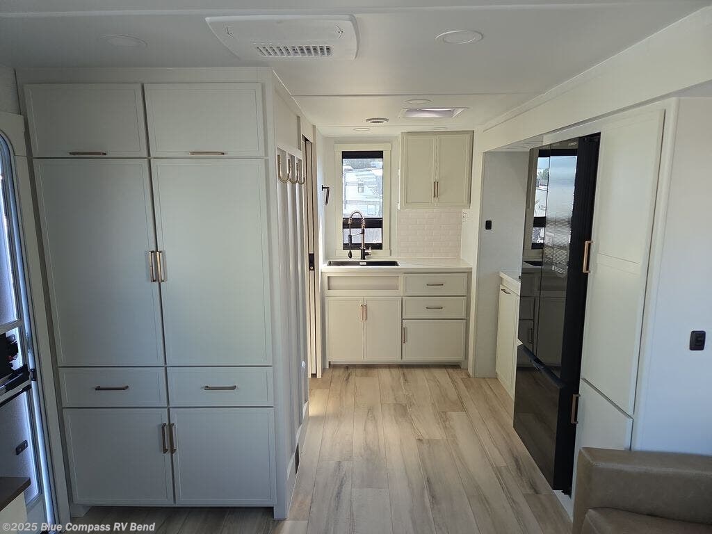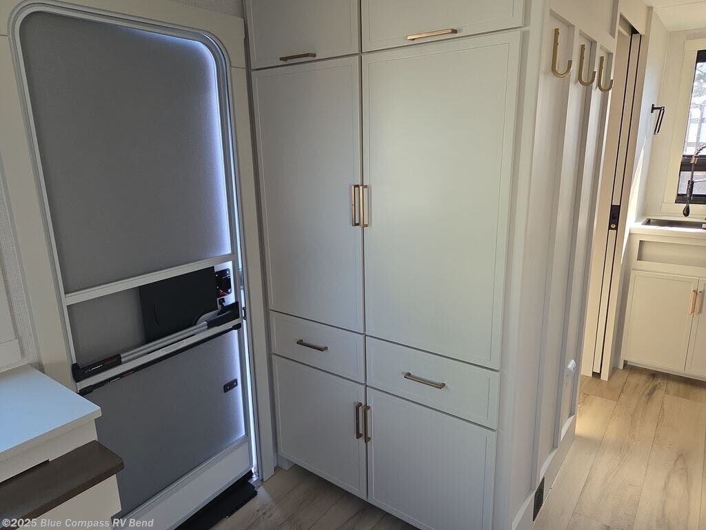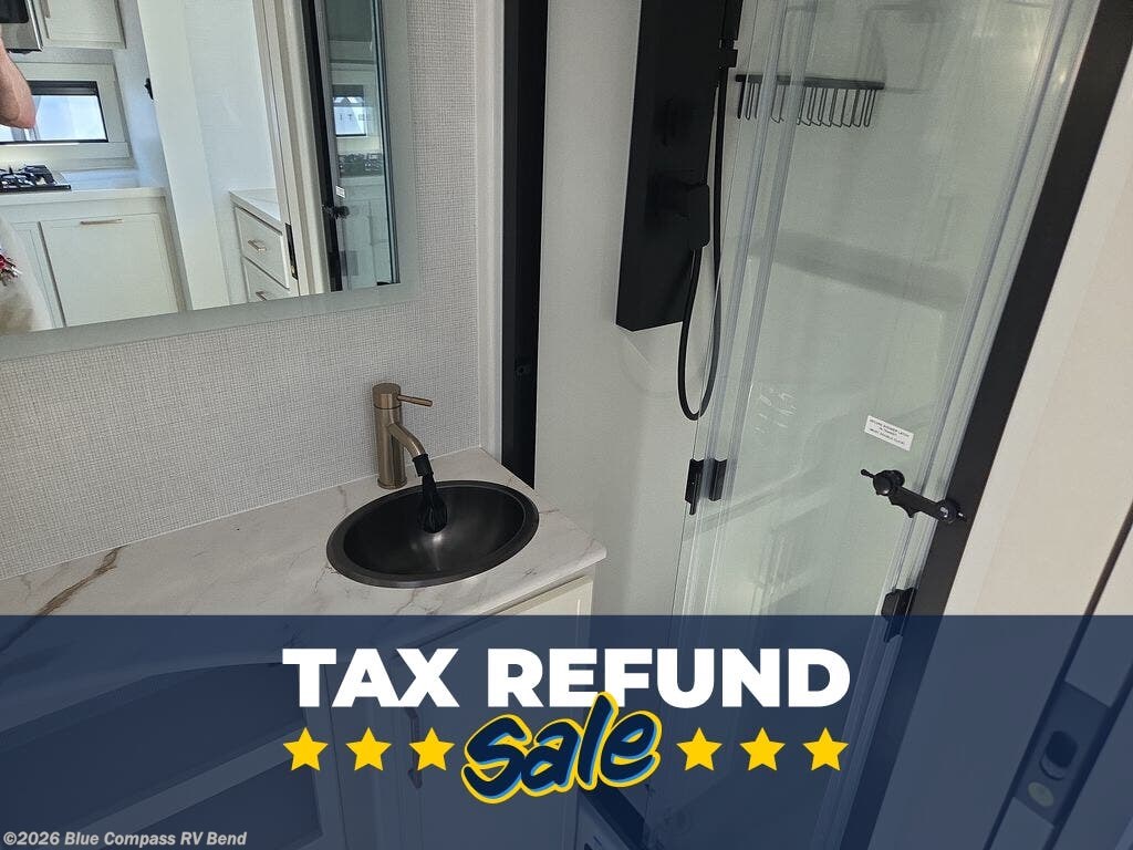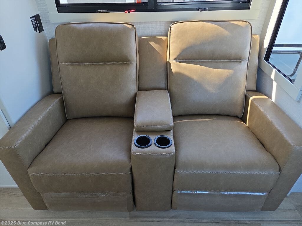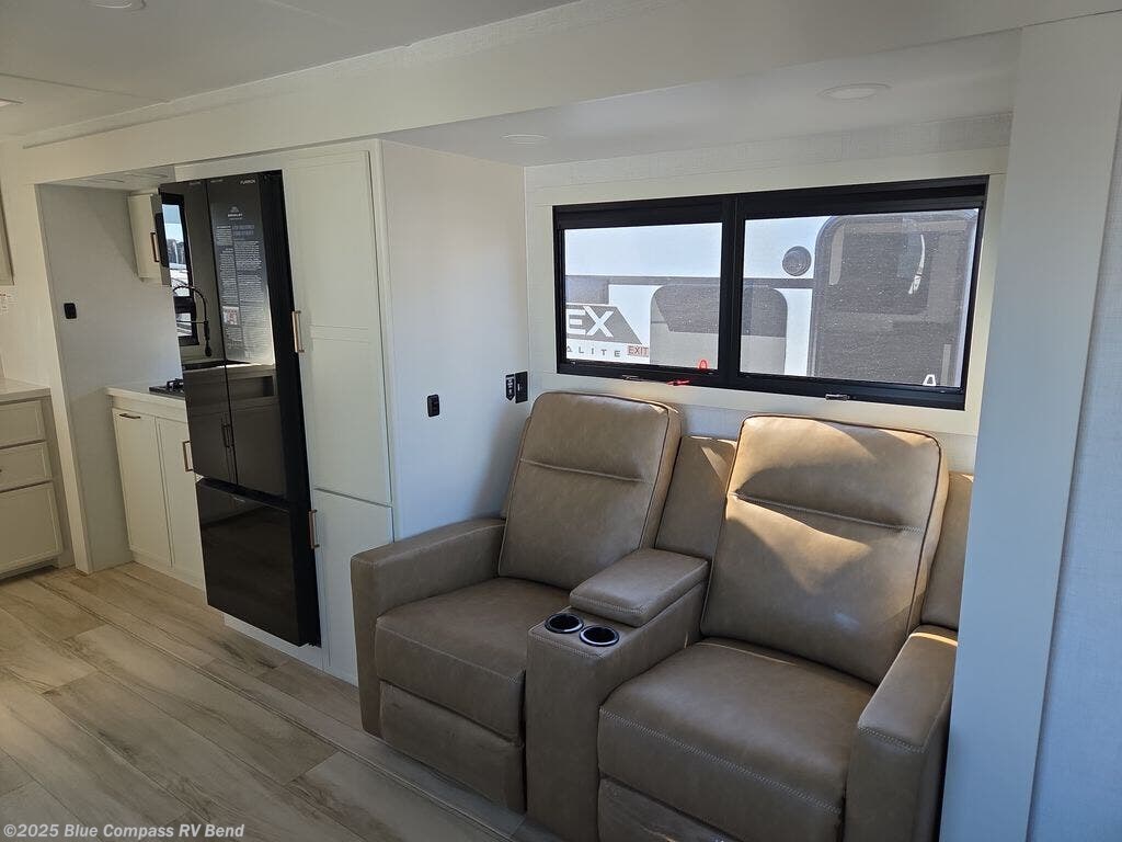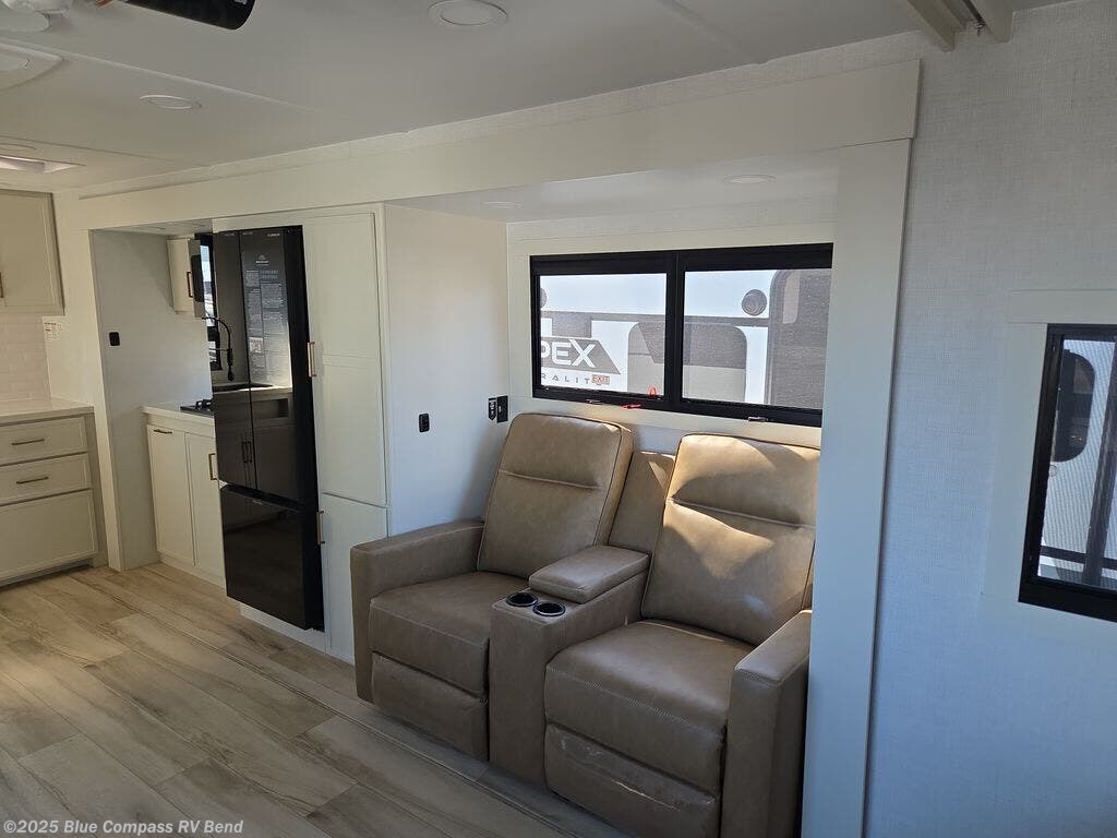 You'll love the amount of space you have in this travel trailer thanks to the large slide out in the main living area. There is comfy theater seating here, along with the kitchen appliances plus a pantry with drawers and an outlet. And a tri-fold sofa option can be chosen in place of theater seating if you're needing sleeping space for guests. You can dine at the pull-out dining table with a drawer, which is right in front of the pull-down interior/exterior screen. A full bath with a 36" x 30" shower will let you freshen up each day, and the king bed in the front bedroom includes a room divider in front for added privacy!