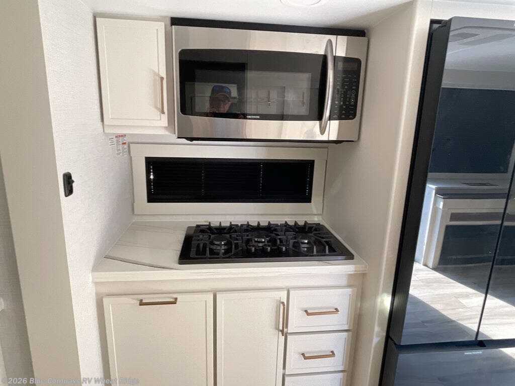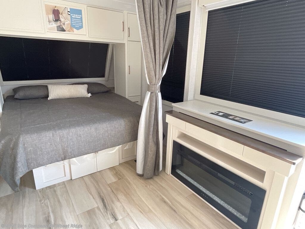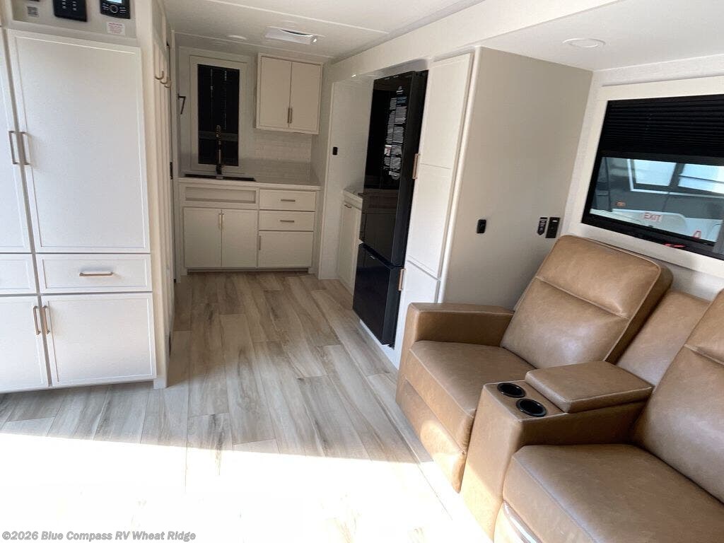 You'll love the amount of space you have in this travel trailer thanks to the large slide out in the main living area. There is comfy theater seating here, along with the kitchen appliances plus a pantry with drawers and an outlet. And a tri-fold sofa option can be chosen in place of theater seating if you're needing sleeping space for guests. You can dine at the pull-out dining table with a drawer, which is right in front of the pull-down interior/exterior screen. A full bath with a 36" x 30" shower will let you freshen up each day, and the king bed in the front bedroom includes a room divider in front for added privacy!
