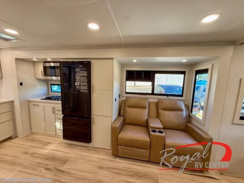 You'll love the amount of space you have in this travel trailer thanks to the large slide out in the main living area. There is comfy theater seating here, along with the kitchen appliances plus a pantry with drawers and an outlet. And a tri-fold sofa option can be chosen in place of theater seating if you're needing sleeping space for guests. You can dine at the pull-out dining table with a drawer, which is right in front of the pull-down interior/exterior screen. A full bath with a 36" x 30" shower will let you freshen up each day, and the king bed in the front bedroom includes a room divider in front for added privacy!