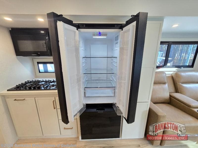 You'll love the amount of space you have in this travel trailer thanks to the large slide out in the main living area. There is comfy theater seating here, along with the kitchen appliances plus a pantry with drawers and an outlet. And a tri-fold sofa option can be chosen in place of theater seating if you're needing sleeping space for guests. You can dine at the pull-out dining table with a drawer, which is right in front of the pull-down interior/exterior screen. A full bath with a 36" x 30" shower will let you freshen up each day, and the king bed in the front bedroom includes a room divider in front for added privacy!