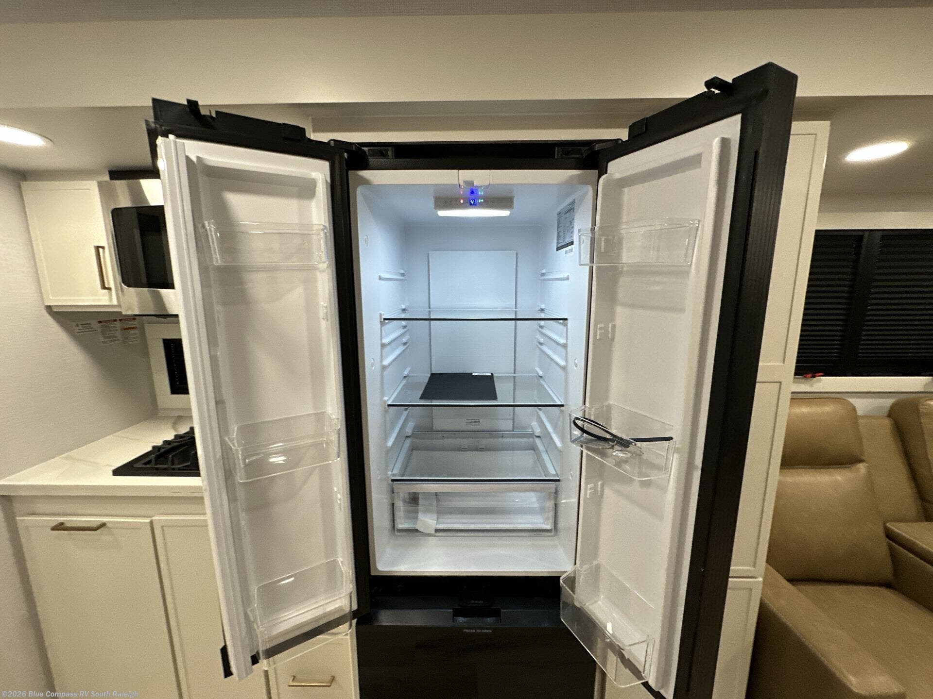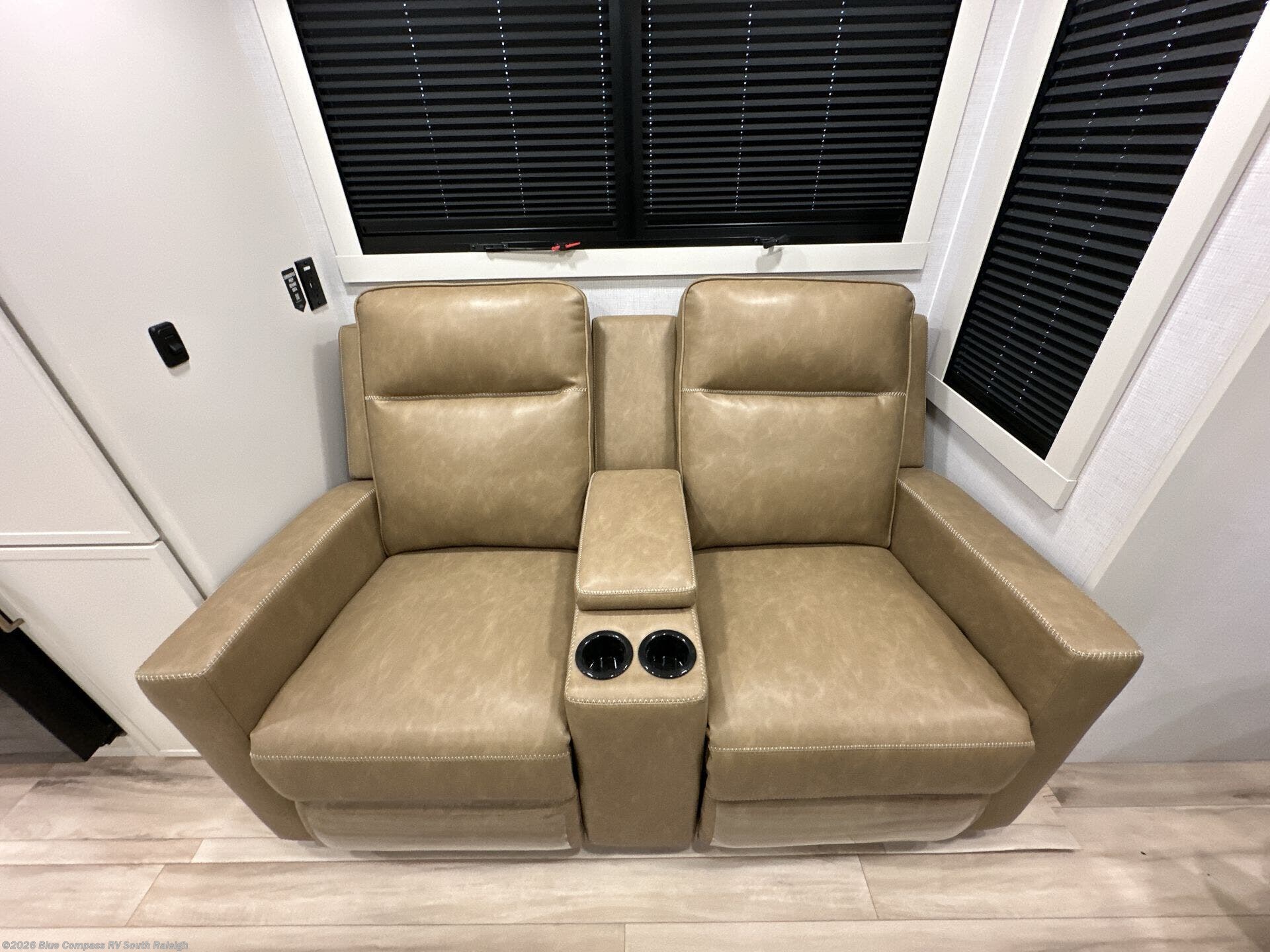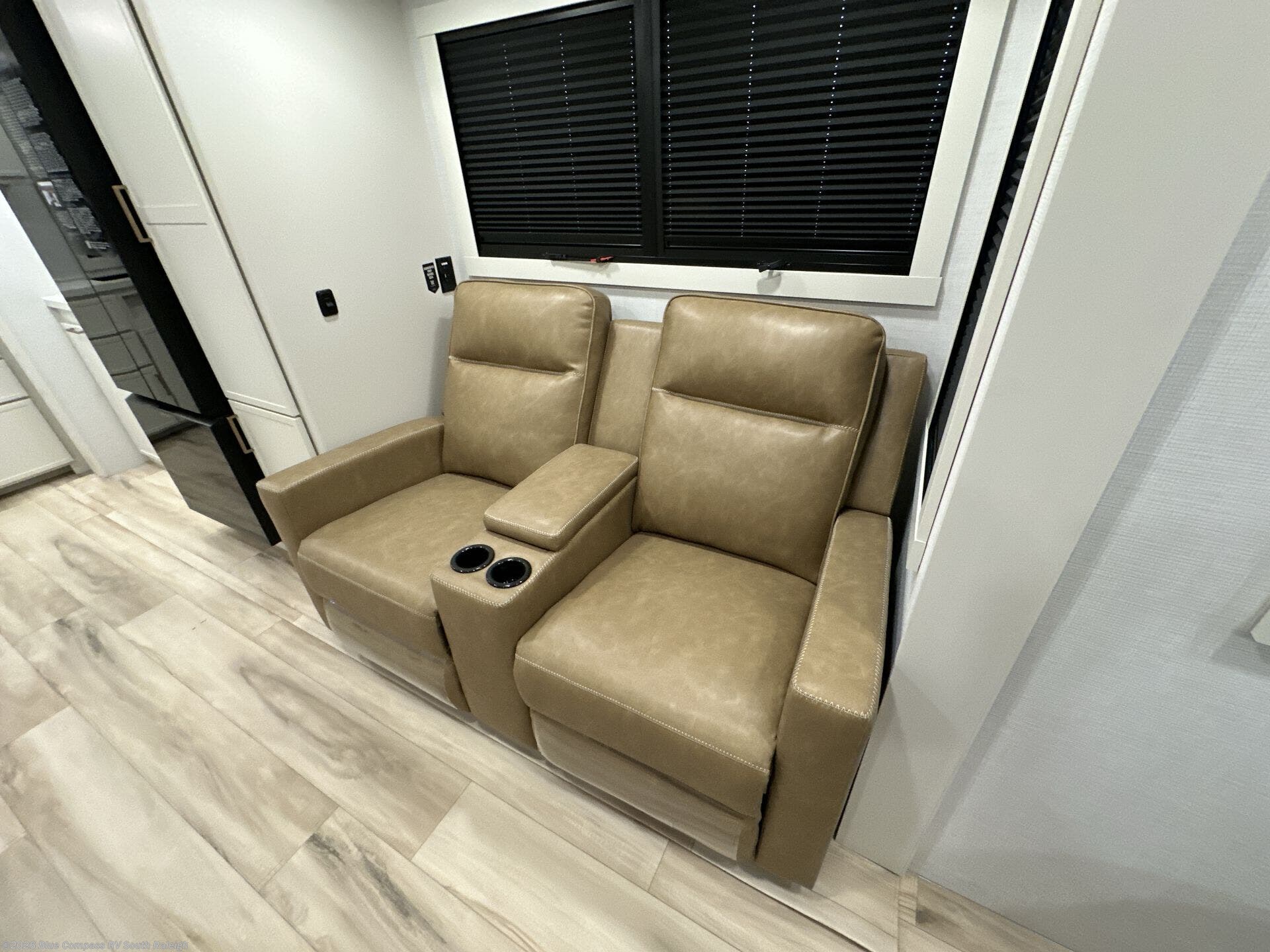 You'll love the amount of space you have in this travel trailer thanks to the large slide out in the main living area. There is comfy theater seating here, along with the kitchen appliances plus a pantry with drawers and an outlet. And a tri-fold sofa option can be chosen in place of theater seating if you're needing sleeping space for guests. You can dine at the pull-out dining table with a drawer, which is right in front of the pull-down interior/exterior screen. A full bath with a 36" x 30" shower will let you freshen up each day, and the king bed in the front bedroom includes a room divider in front for added privacy!