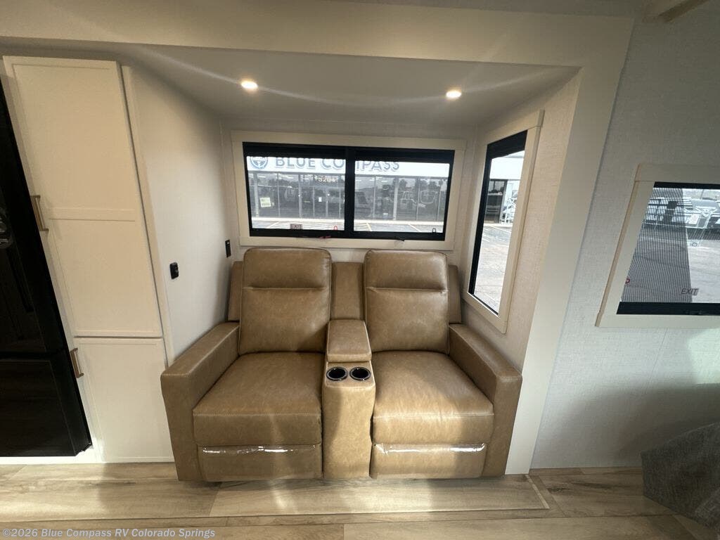 You'll love the amount of space you have in this travel trailer thanks to the large slide out in the main living area. There is comfy theater seating here, along with the kitchen appliances plus a pantry with drawers and an outlet. And a tri-fold sofa option can be chosen in place of theater seating if you're needing sleeping space for guests. You can dine at the pull-out dining table with a drawer, which is right in front of the pull-down interior/exterior screen. A full bath with a 36" x 30" shower will let you freshen up each day, and the king bed in the front bedroom includes a room divider in front for added privacy!