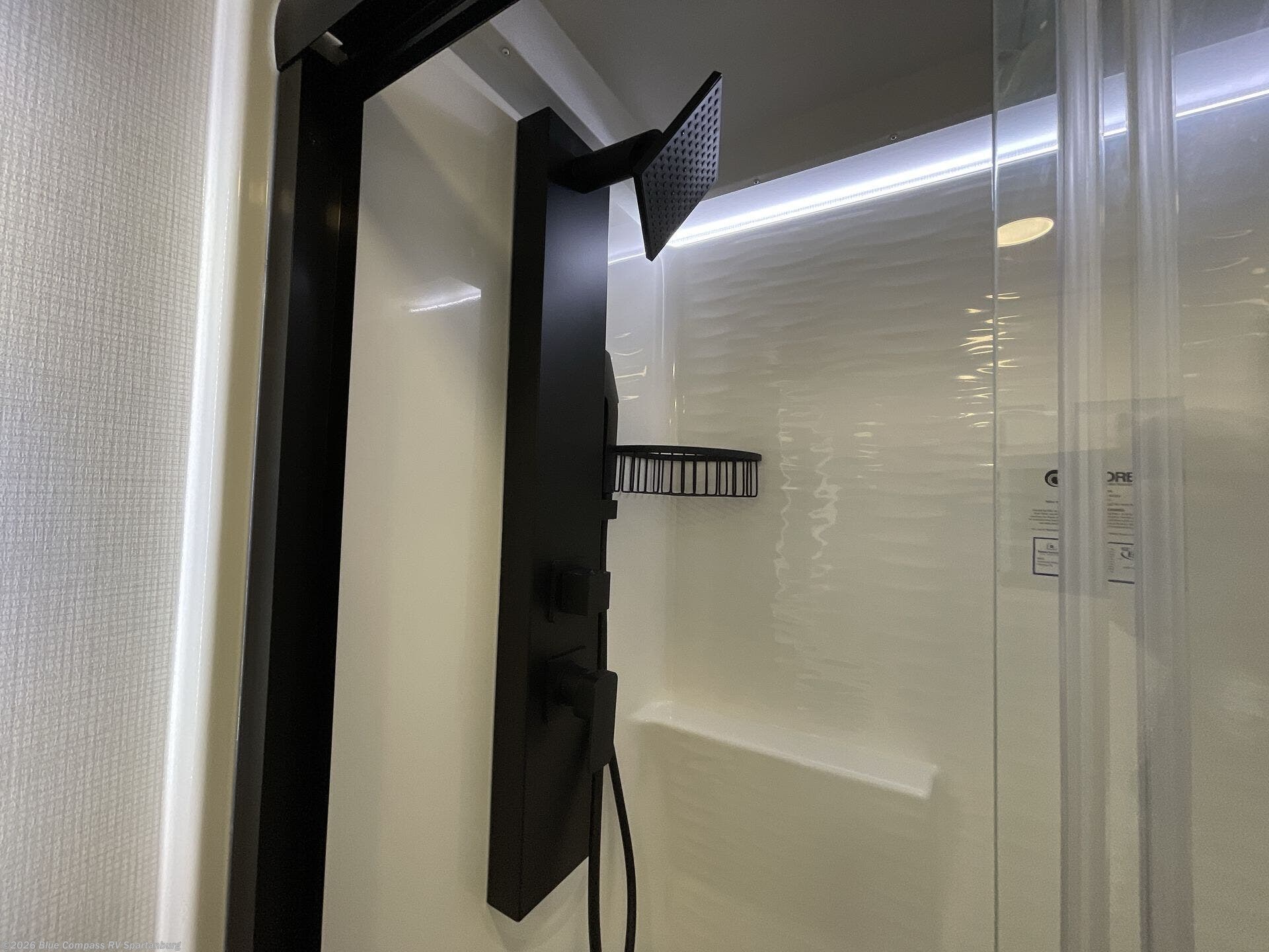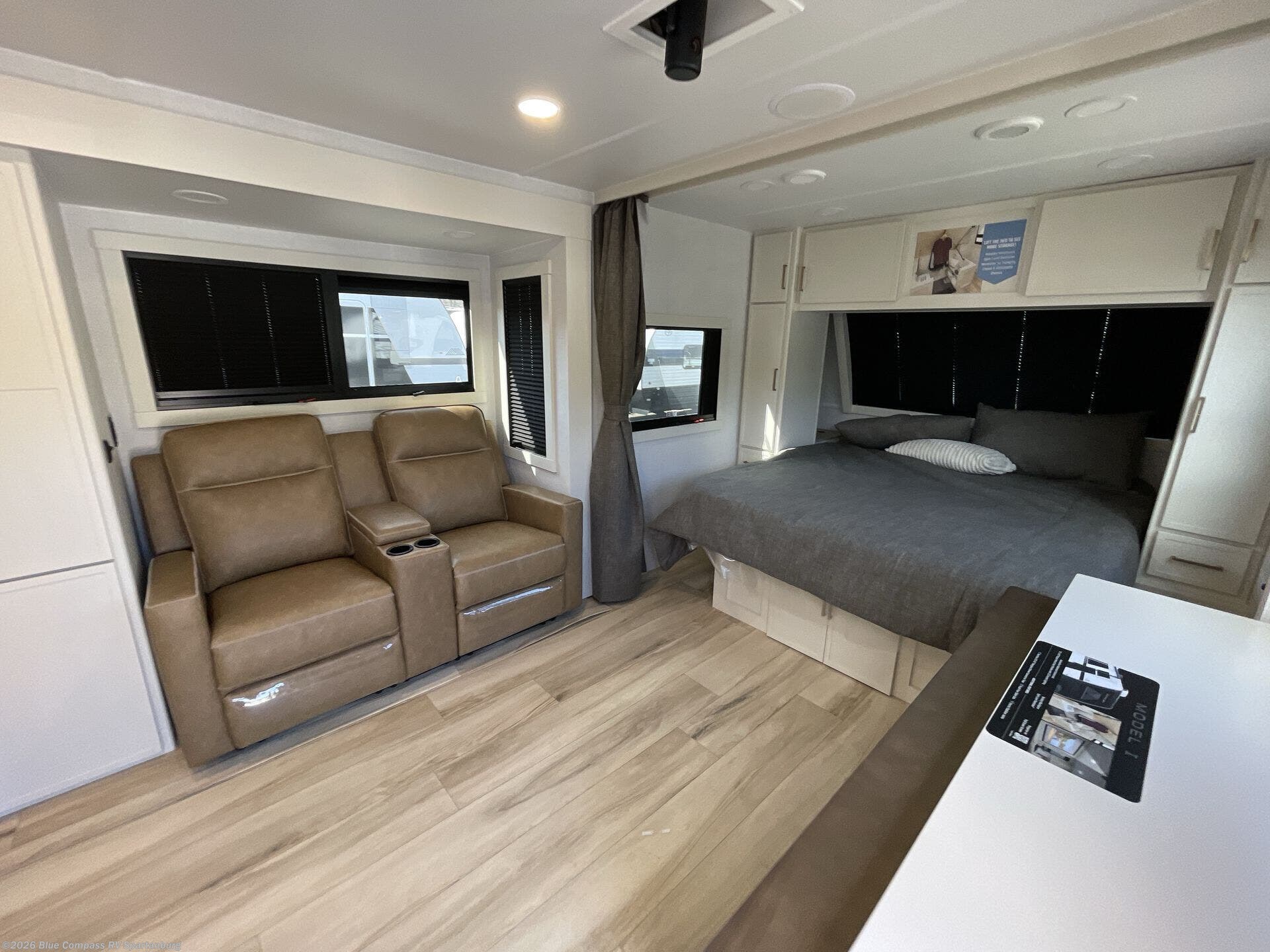 You'll love the amount of space you have in this travel trailer thanks to the large slide out in the main living area. There is comfy theater seating here, along with the kitchen appliances plus a pantry with drawers and an outlet. And a tri-fold sofa option can be chosen in place of theater seating if you're needing sleeping space for guests. You can dine at the pull-out dining table with a drawer, which is right in front of the pull-down interior/exterior screen. A full bath with a 36" x 30" shower will let you freshen up each day, and the king bed in the front bedroom includes a room divider in front for added privacy!