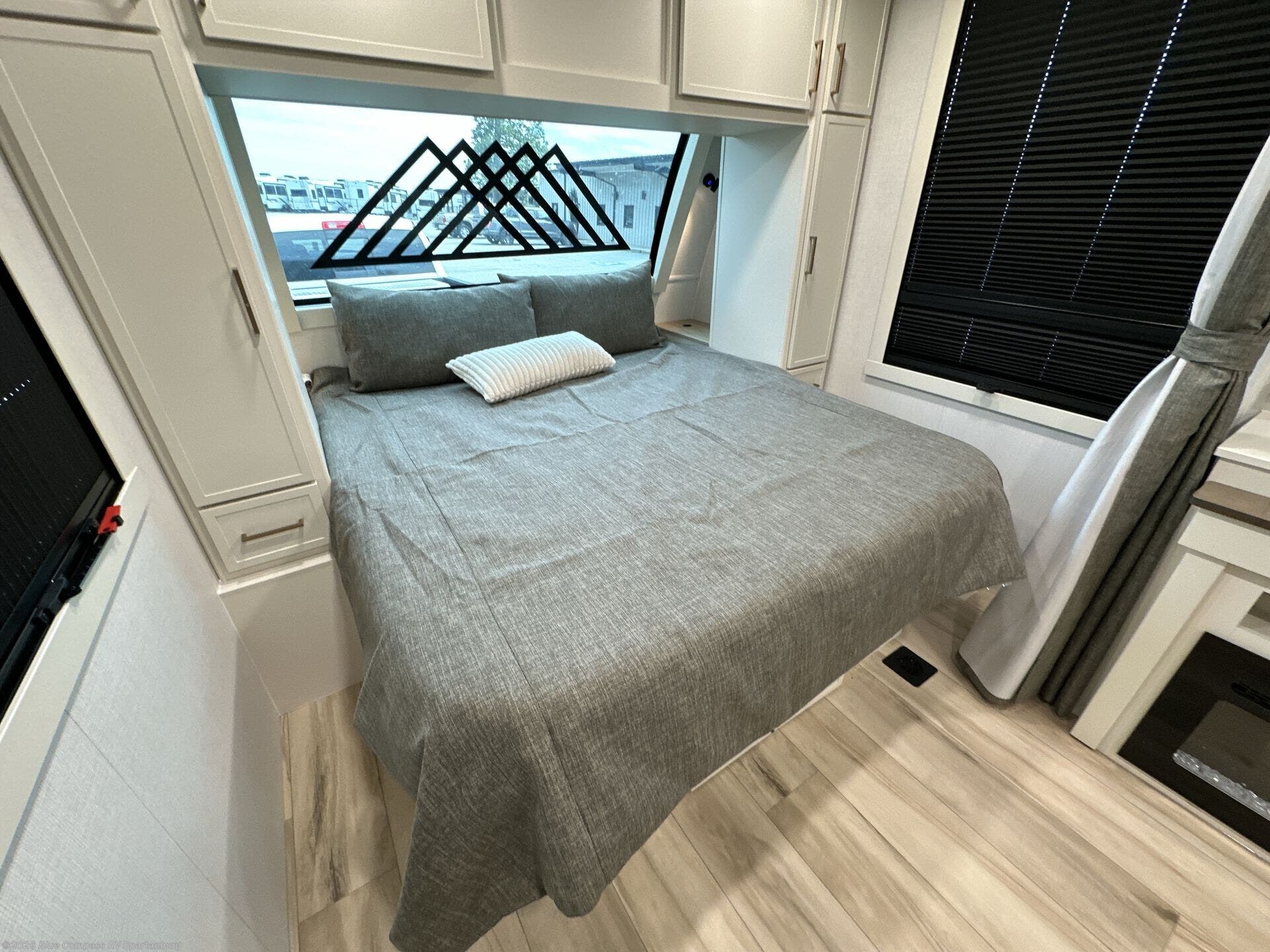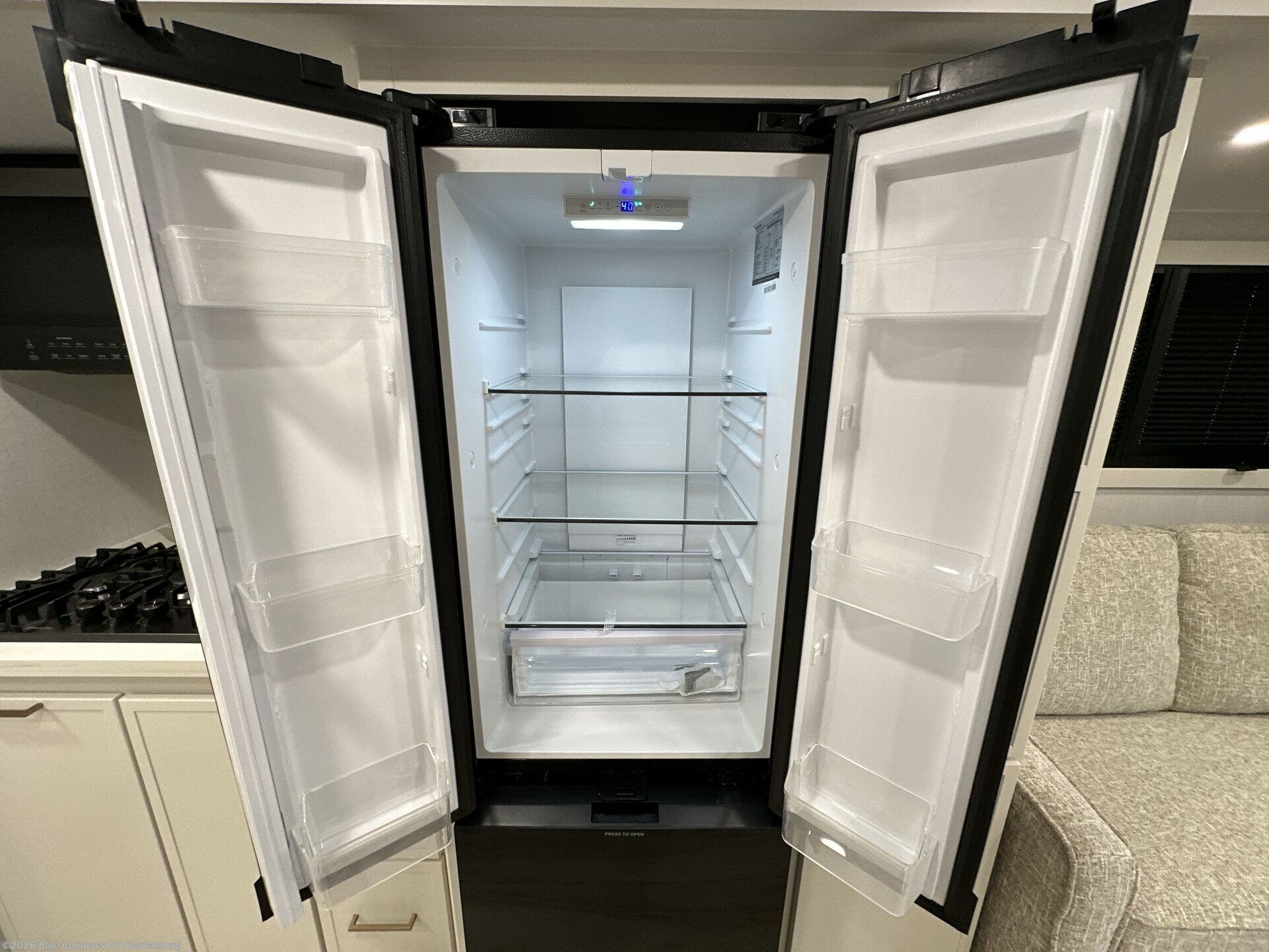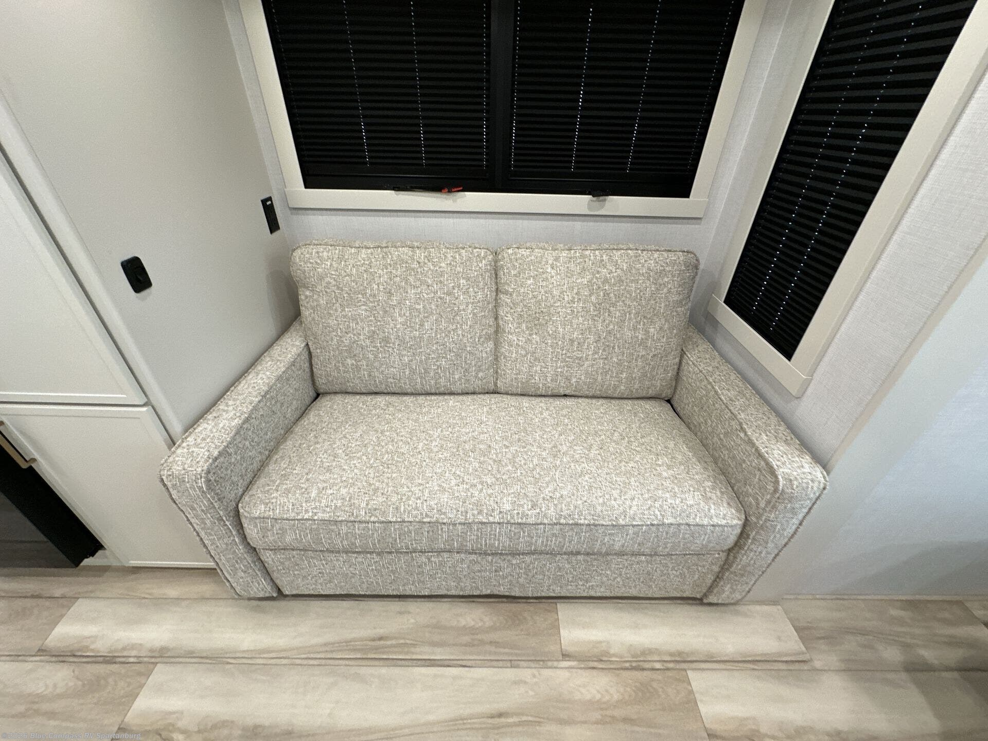 You'll love the amount of space you have in this travel trailer thanks to the large slide out in the main living area. There is comfy theater seating here, along with the kitchen appliances plus a pantry with drawers and an outlet. And a tri-fold sofa option can be chosen in place of theater seating if you're needing sleeping space for guests. You can dine at the pull-out dining table with a drawer, which is right in front of the pull-down interior/exterior screen. A full bath with a 36" x 30" shower will let you freshen up each day, and the king bed in the front bedroom includes a room divider in front for added privacy!