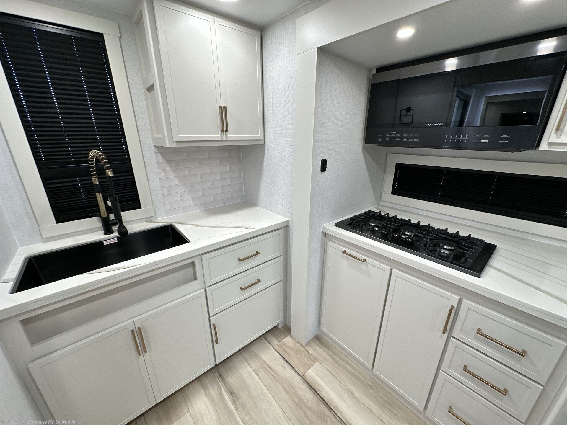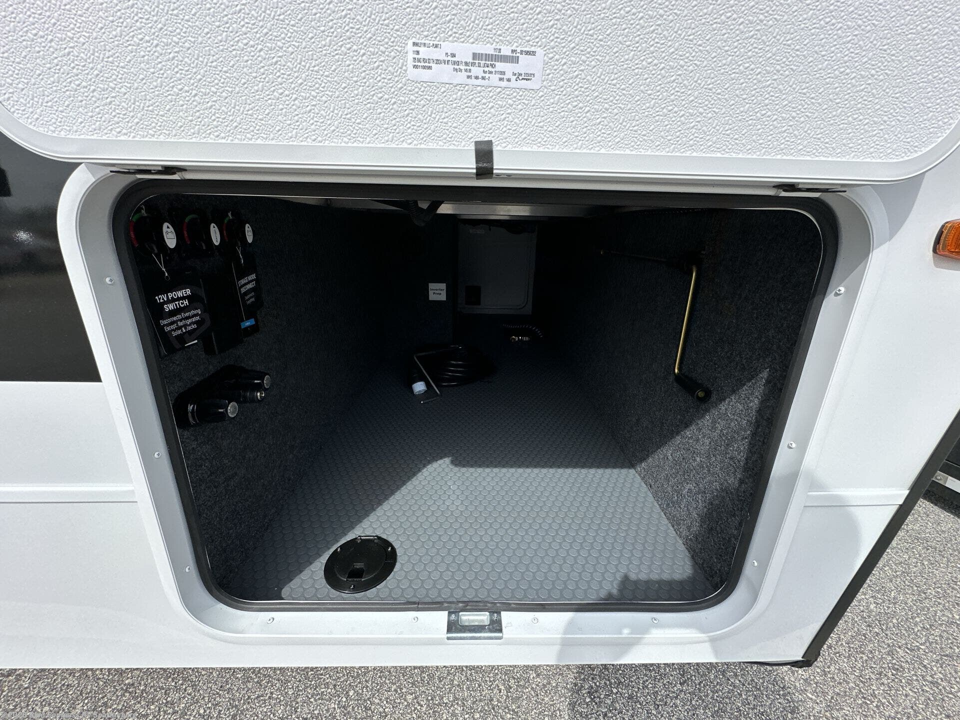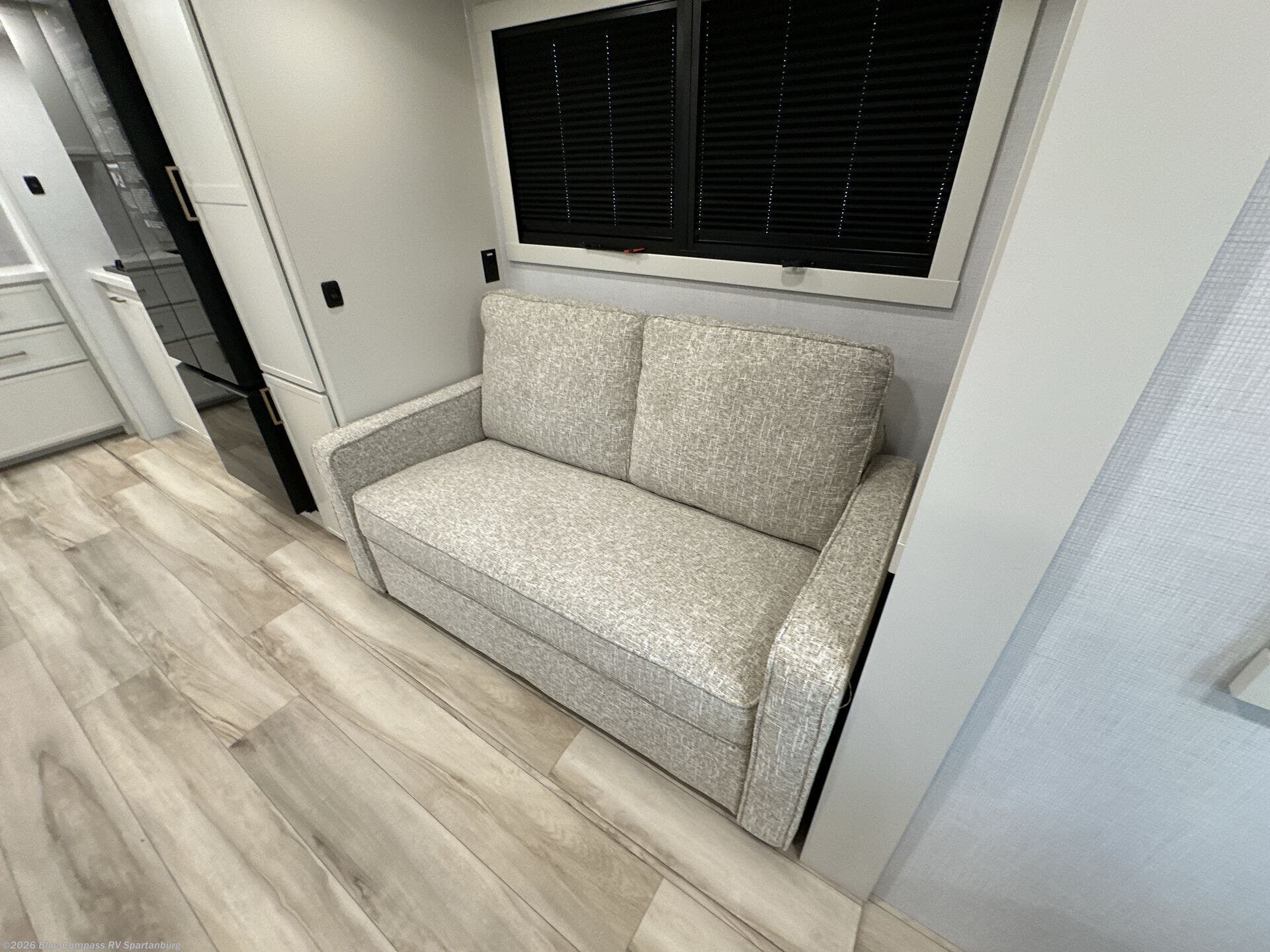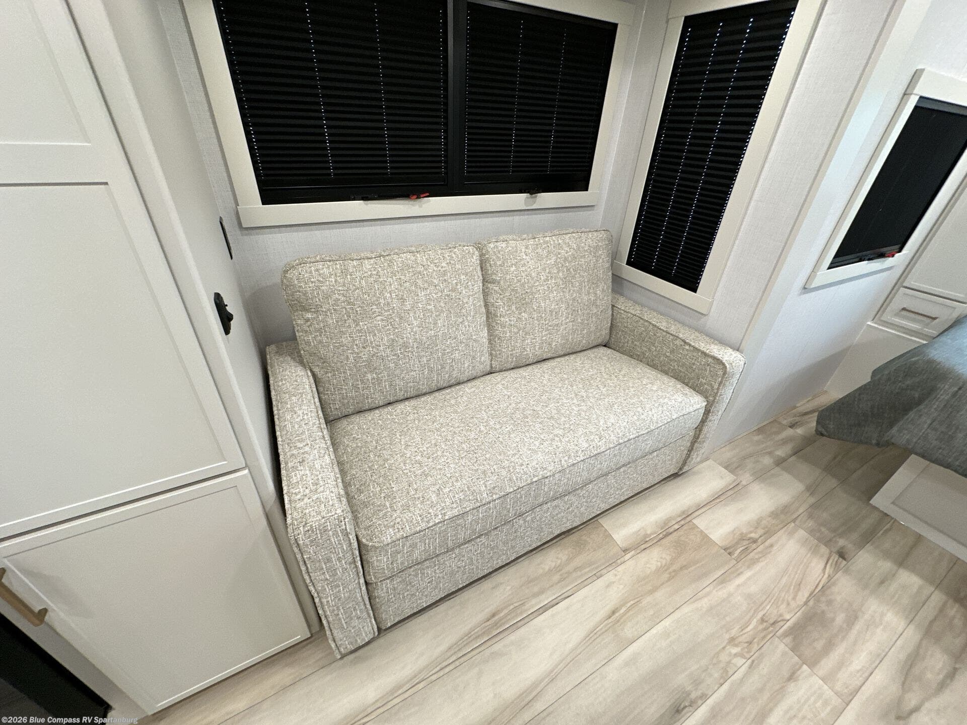 You'll love the amount of space you have in this travel trailer thanks to the large slide out in the main living area. There is comfy theater seating here, along with the kitchen appliances plus a pantry with drawers and an outlet. And a tri-fold sofa option can be chosen in place of theater seating if you're needing sleeping space for guests. You can dine at the pull-out dining table with a drawer, which is right in front of the pull-down interior/exterior screen. A full bath with a 36" x 30" shower will let you freshen up each day, and the king bed in the front bedroom includes a room divider in front for added privacy!