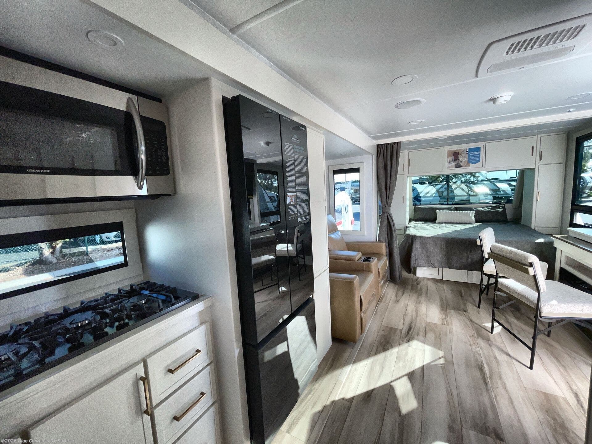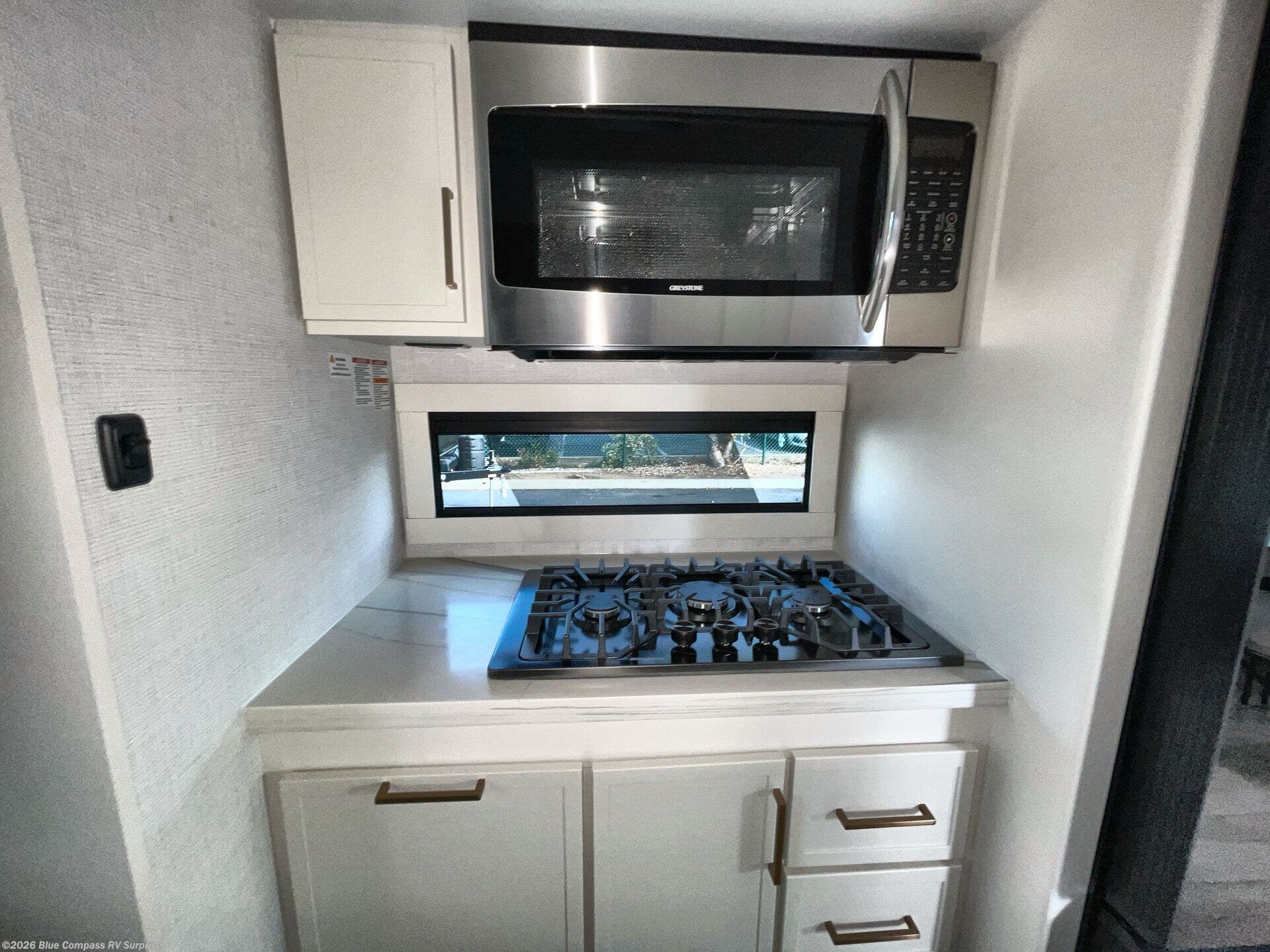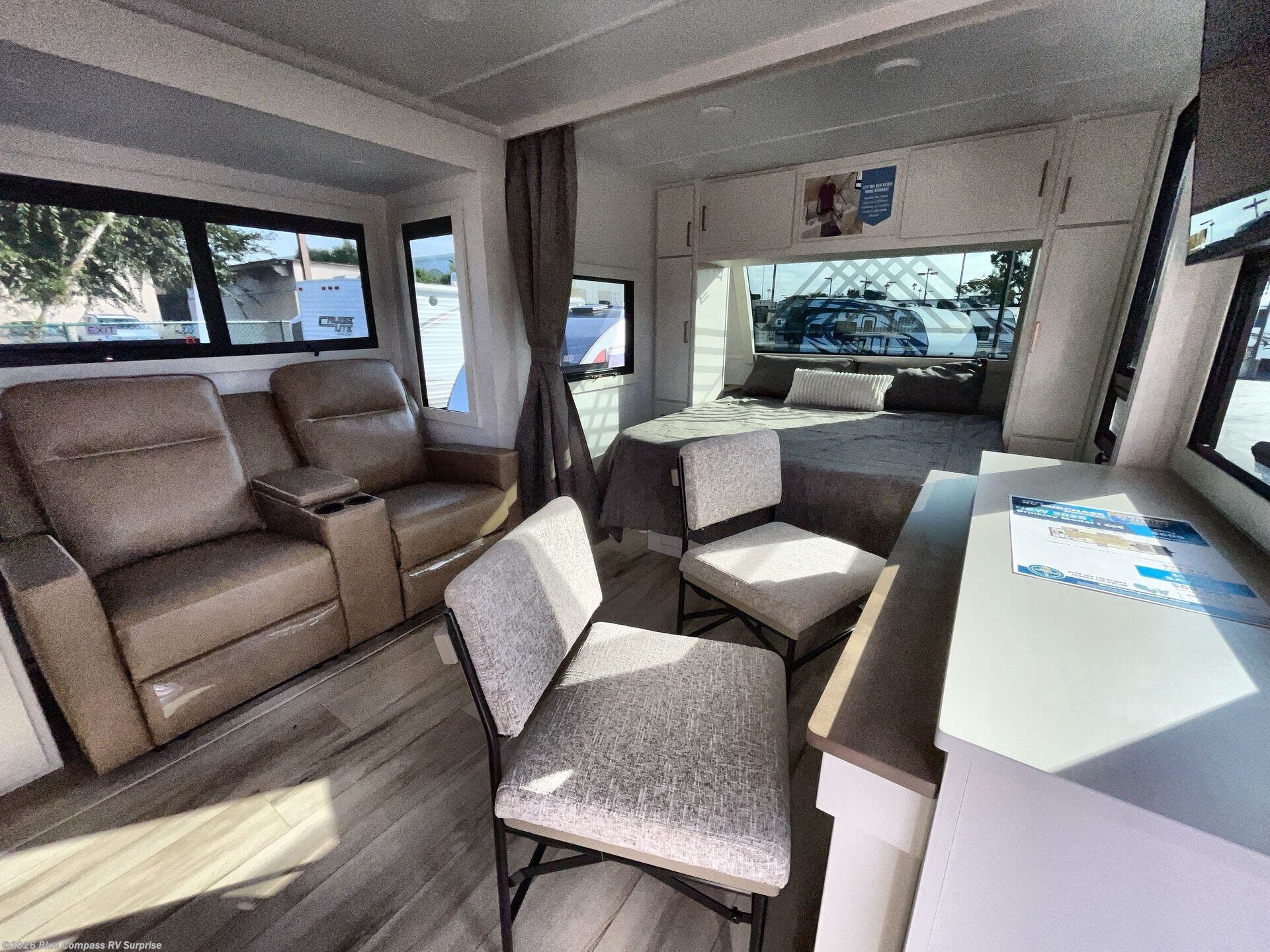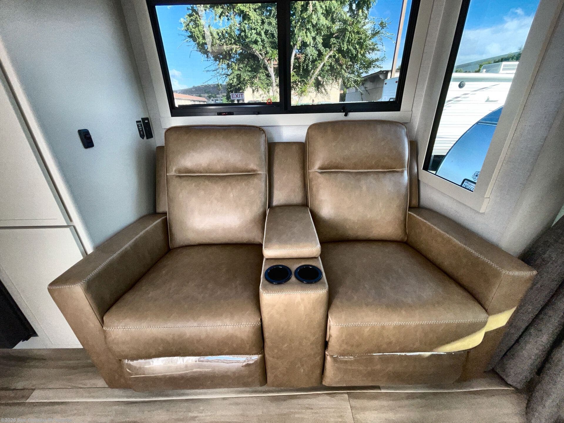 You'll love the amount of space you have in this travel trailer thanks to the large slide out in the main living area. There is comfy theater seating here, along with the kitchen appliances plus a pantry with drawers and an outlet. And a tri-fold sofa option can be chosen in place of theater seating if you're needing sleeping space for guests. You can dine at the pull-out dining table with a drawer, which is right in front of the pull-down interior/exterior screen. A full bath with a 36" x 30" shower will let you freshen up each day, and the king bed in the front bedroom includes a room divider in front for added privacy!
