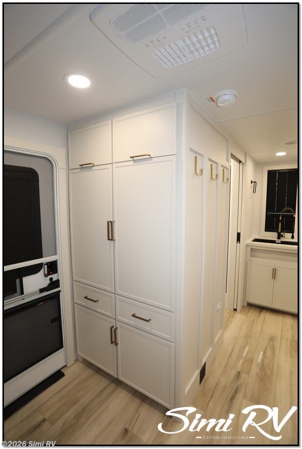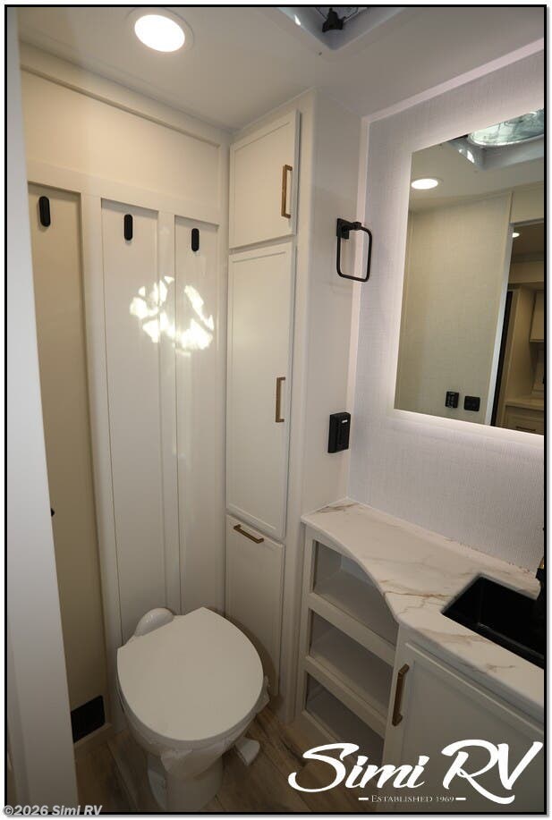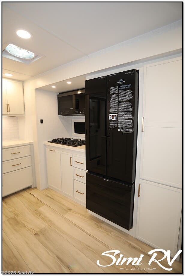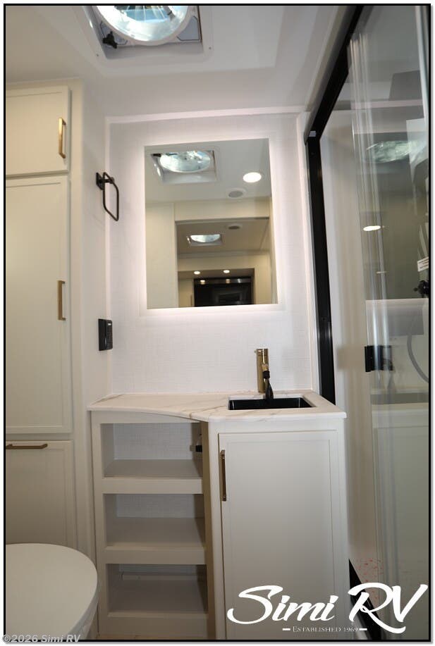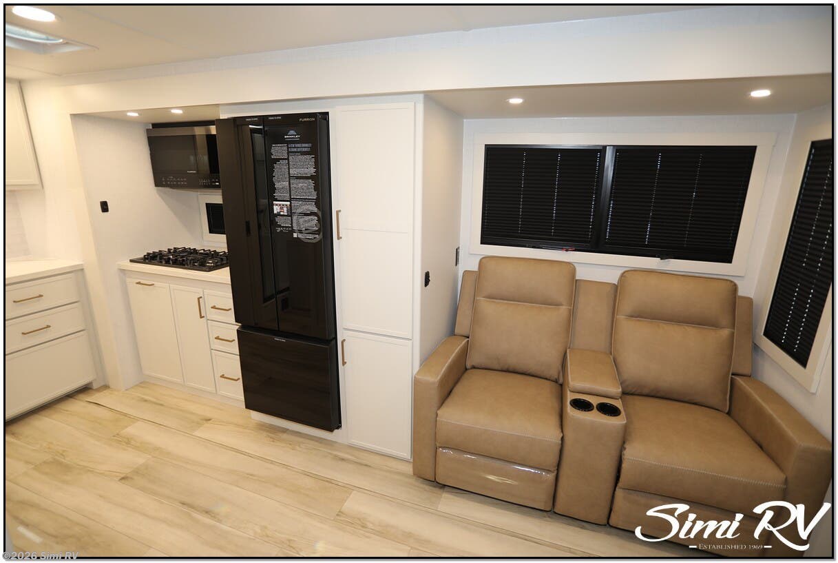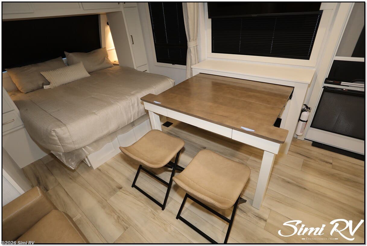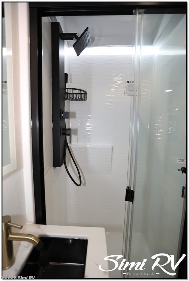 The Model I is packed with features that set it apart: Brinkleys signature premium residential features & construction include Brinkleys signature CraftSense wood trim, dovetail drawers, solid surface countertops, and the iconic pull-out trash and paper towel caddy Seamless Laminated Aluminum Exterior with automotive grade fully body paint and modern graphics offers clean modern styling and lasting beauty Ceiling-mounted digital smart projector provides a big-screen theater experience Rockford Fosgate Audio System for big audio inside and campside w/ app control Slide-Out Dining Table with utensil drawer comfortably seats up to 4 Dishwasher Prep MaxSpace Split-Level Wardrobe with a hanging closet and adjustable shelves under the bed, and a full floor-to-ceiling wardrobe with drawers, maximizing flexibility and storage space Spacious Bathrooms with ample counter space, a porcelain toilet, and a large 30 x 42 one-piece molded fiberglass shower with an integrated seat
