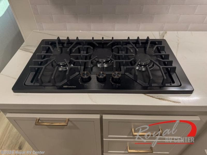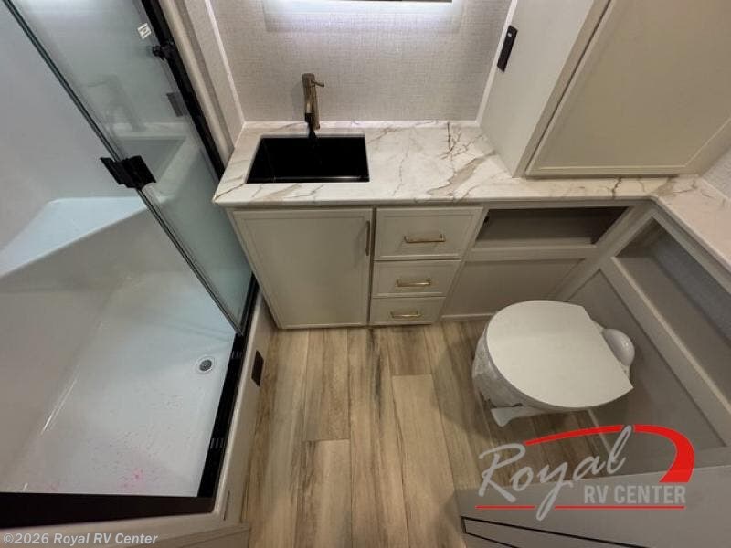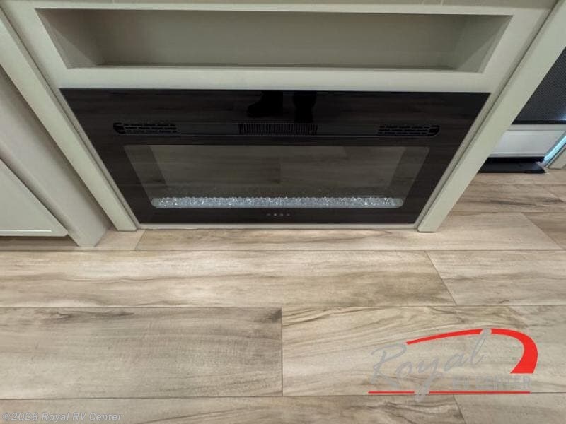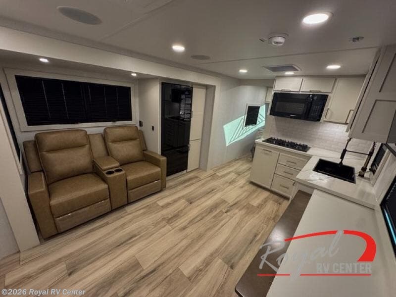 One look at this travel trailer and you'll be sold! The full rear bath features a spacious 42" x 30" shower with a built-in seat and Maxxair fan to name a few comforts. The front private bedroom features a 66" x 80" king bed with a MaxSpace Split-Level Wardrobe underneath to store shoes, clothes, and more! A slide out in the combined living area and kitchen makes your space more open, and you'll enjoy relaxing on the theater seating here in the evenings. The full kitchen includes a three burner stovetop, residential 30" convection microwave, 12 cu. ft. 12V refrigerator, plus a trash bin and Stow N' Go paper towel holder for added convenience. You can choose to eat outdoors under the 19' electric awning with LED lights or stay inside to dine at the pull-out dining table with a drawer for added storage! And if you're needing more sleeping space, just choose the optional tri-fold sofa in place of the theater seating!