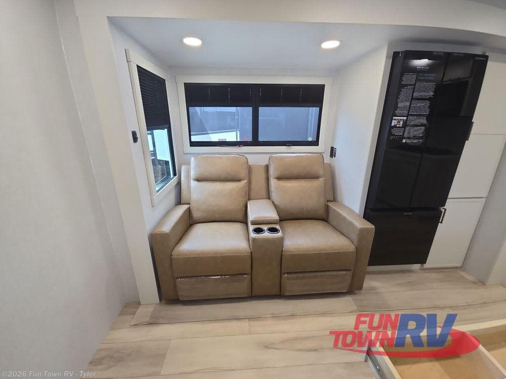 One look at this travel trailer and you'll be sold! The full rear bath features a spacious 42" x 30" shower with a built-in seat and Maxxair fan to name a few comforts. The front private bedroom features a 66" x 80" king bed with a MaxSpace Split-Level Wardrobe underneath to store shoes, clothes, and more! A slide out in the combined living area and kitchen makes your space more open, and you'll enjoy relaxing on the theater seating here in the evenings. The full kitchen includes a three burner stovetop, residential 30" convection microwave, 12 cu. ft. 12V refrigerator, plus a trash bin and Stow N' Go paper towel holder for added convenience. You can choose to eat outdoors under the 19' electric awning with LED lights or stay inside to dine at the pull-out dining table with a drawer for added storage! And if you're needing more sleeping space, just choose the optional tri-fold sofa in place of the theater seating!