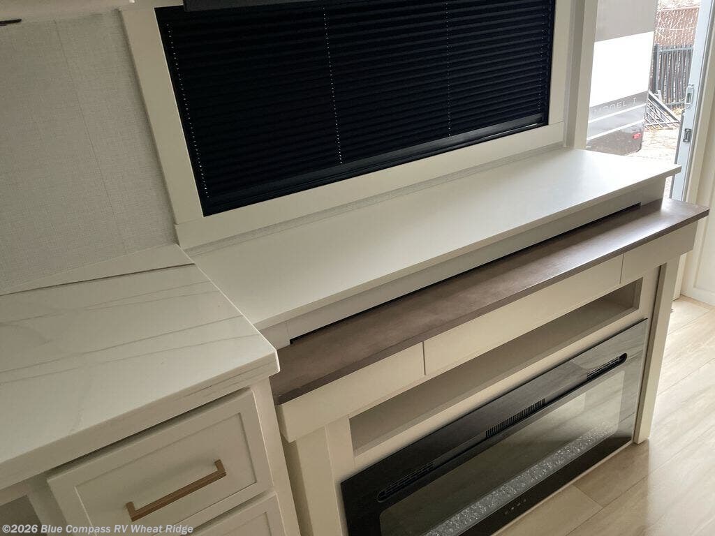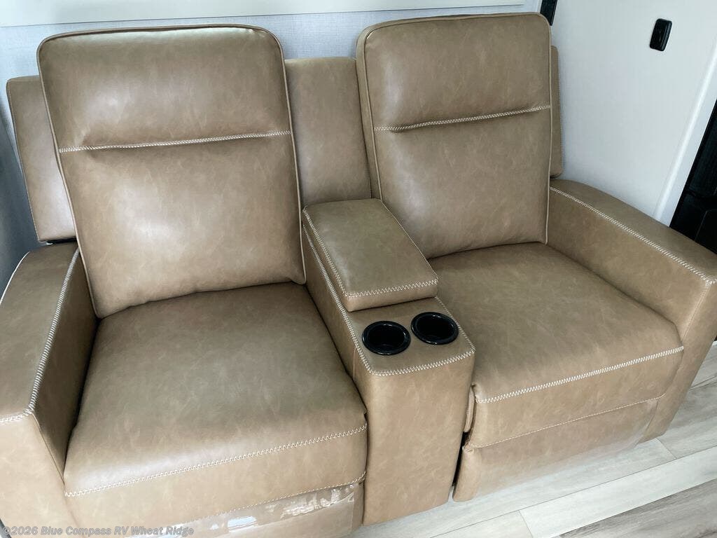 One look at this travel trailer and you'll be sold! The full rear bath features a spacious 42" x 30" shower with a built-in seat and Maxxair fan to name a few comforts. The front private bedroom features a 66" x 80" king bed with a MaxSpace Split-Level Wardrobe underneath to store shoes, clothes, and more! A slide out in the combined living area and kitchen makes your space more open, and you'll enjoy relaxing on the theater seating here in the evenings. The full kitchen includes a three burner stovetop, residential 30" convection microwave, 12 cu. ft. 12V refrigerator, plus a trash bin and Stow N' Go paper towel holder for added convenience. You can choose to eat outdoors under the 18' electric awning with LED lights or stay inside to dine at the pull-out dining table with a drawer for added storage! And if you're needing more sleeping space, just choose the optional tri-fold sofa in place of the theater seating!