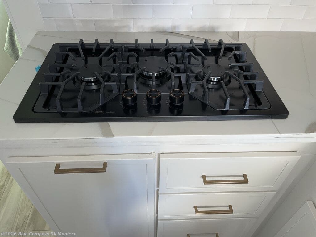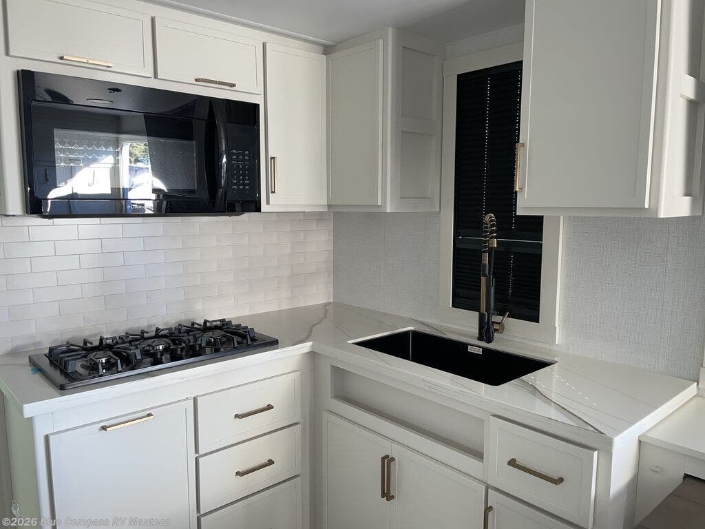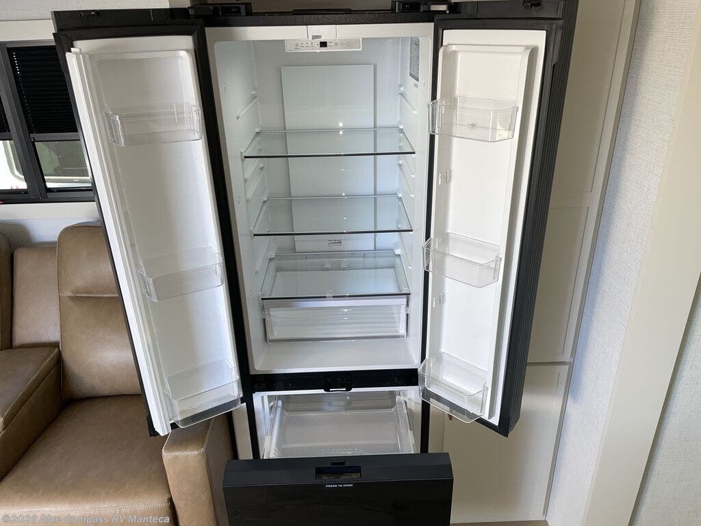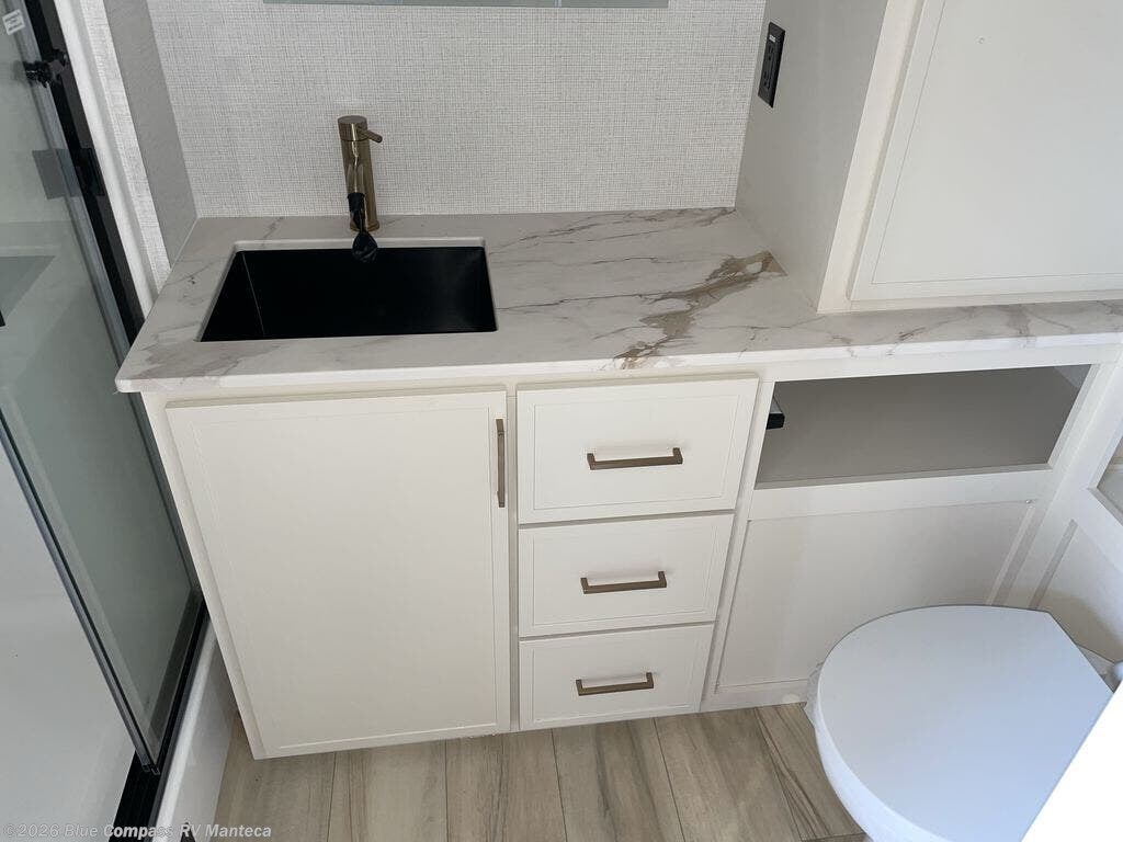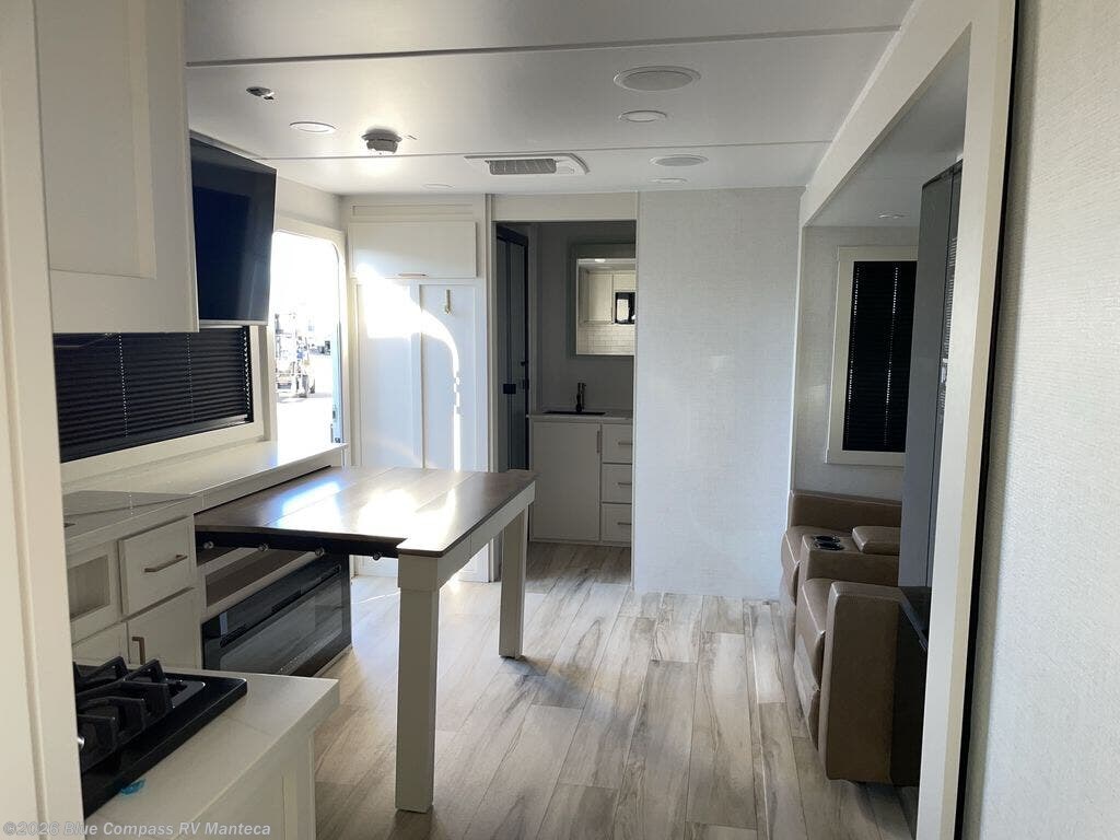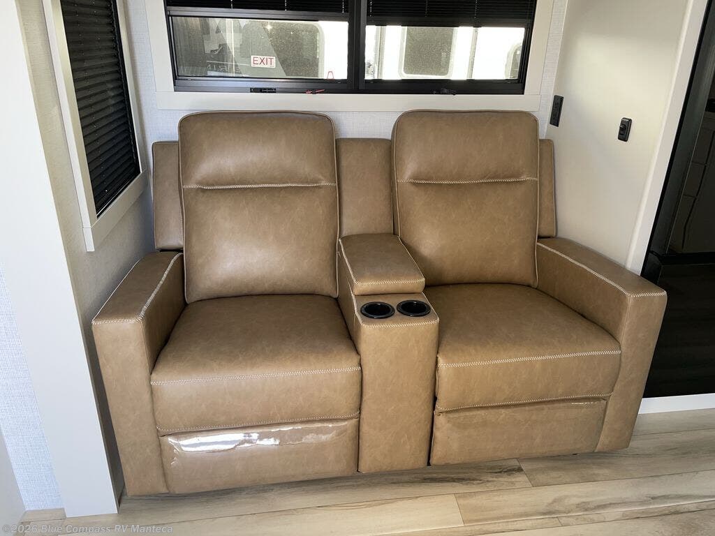 One look at this travel trailer and you'll be sold! The full rear bath features a spacious 42" x 30" shower with a built-in seat and Maxxair fan to name a few comforts. The front private bedroom features a 66" x 80" king bed with a MaxSpace Split-Level Wardrobe underneath to store shoes, clothes, and more! A slide out in the combined living area and kitchen makes your space more open, and you'll enjoy relaxing on the theater seating here in the evenings. The full kitchen includes a three burner stovetop, residential 30" convection microwave, 12 cu. ft. 12V refrigerator, plus a trash bin and Stow N' Go paper towel holder for added convenience. You can choose to eat outdoors under the 18' electric awning with LED lights or stay inside to dine at the pull-out dining table with a drawer for added storage! And if you're needing more sleeping space, just choose the optional tri-fold sofa in place of the theater seating!