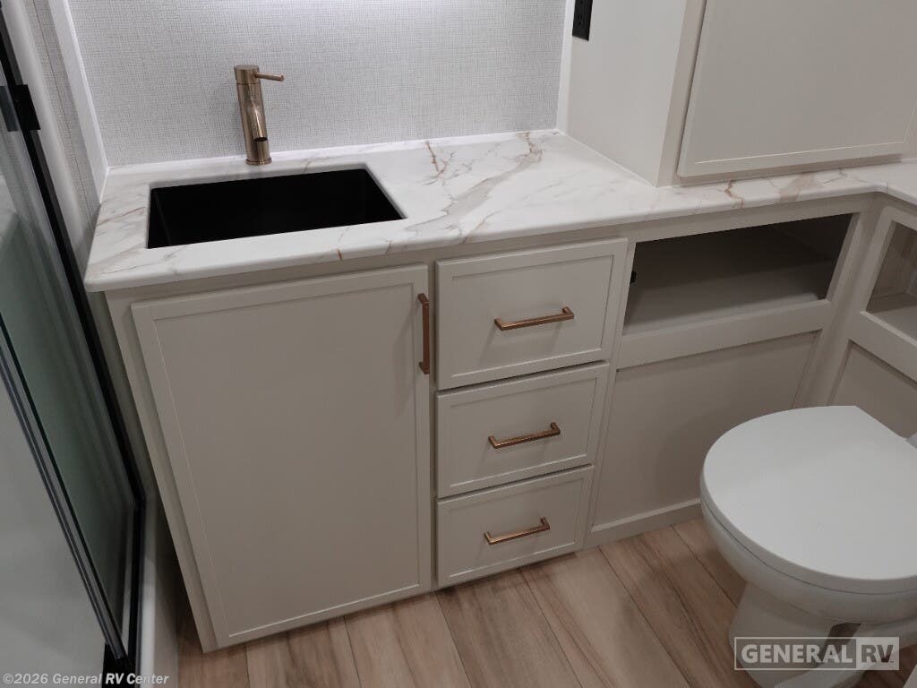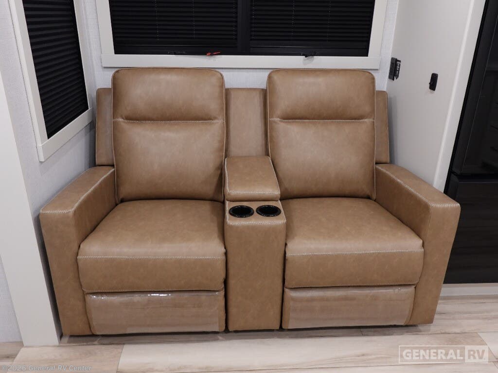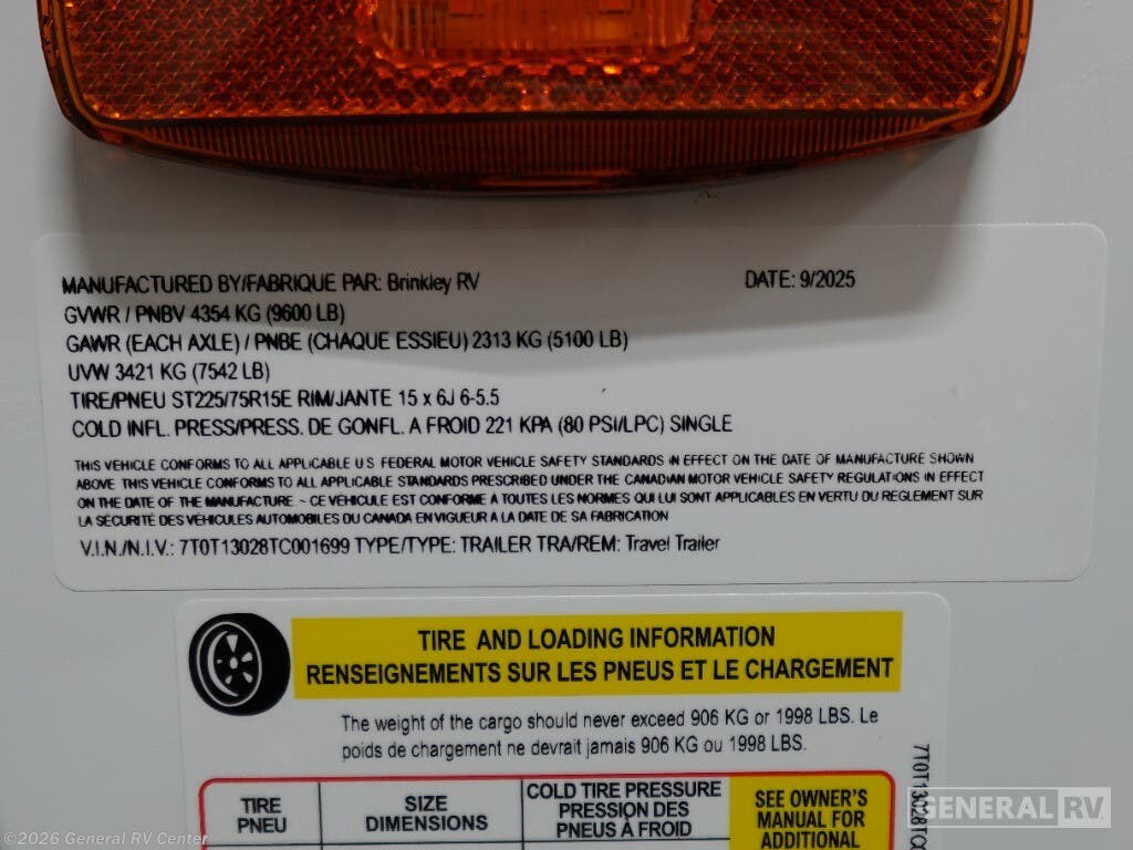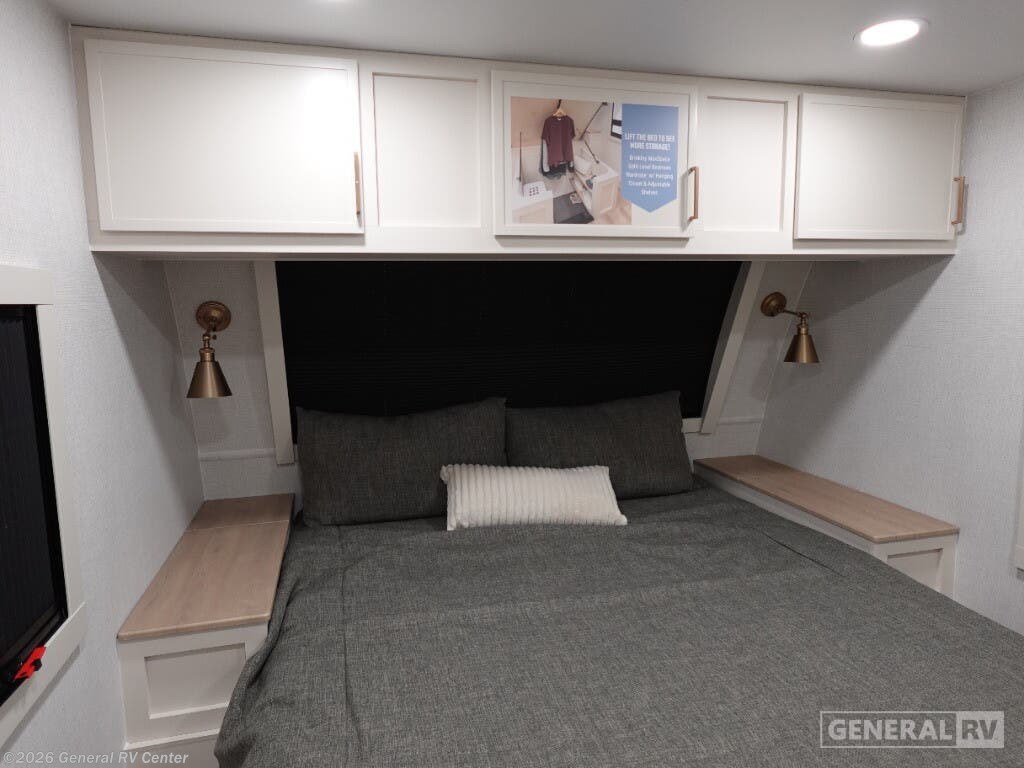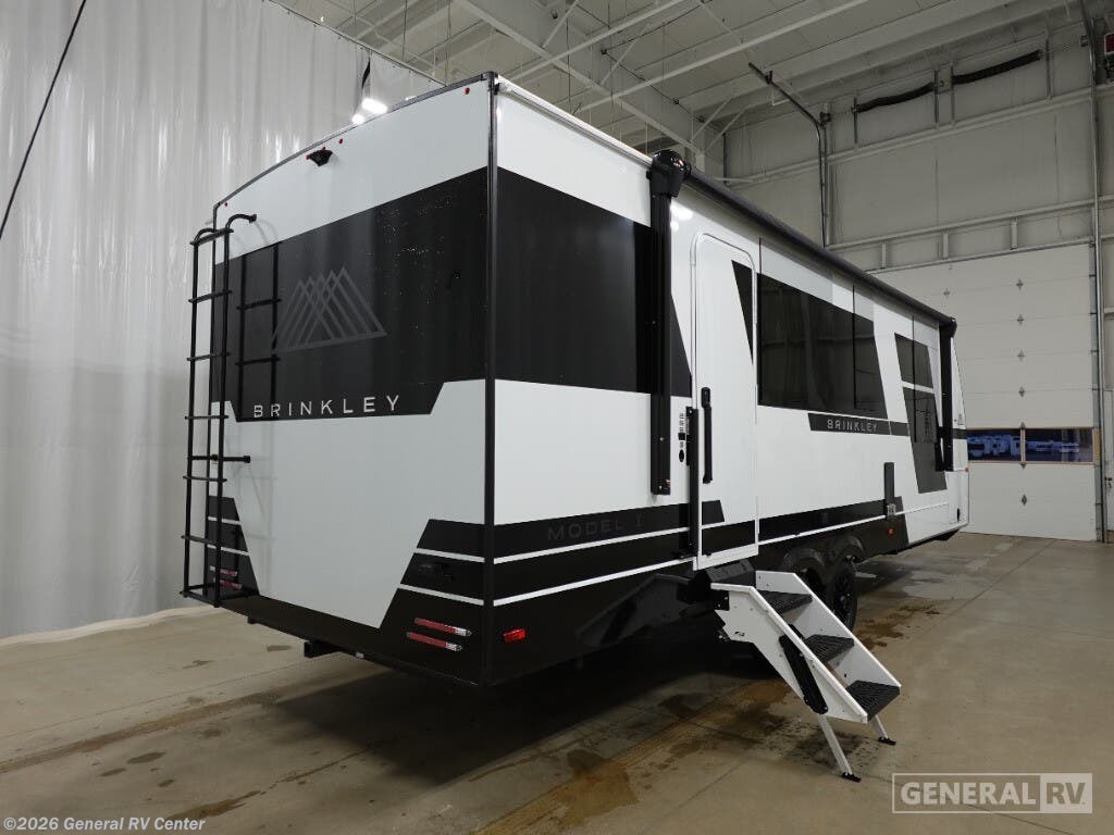 Step into the future of RV living with the 2026 Brinkley RV Model I, Floorplan 265. This thoughtfully designed travel trailer is perfect for those who crave luxury and comfort on the road. With a spacious 29.92 feet in length, this RV offers a harmonious blend of style and functionality. The centerpiece of your adventure is the king-sized bed in the front bedroom, ensuring restful nights under the stars. The center kitchen is equipped with a full-size electric refrigerator, three-burner cooktop, and convection cooking, making meal prep a breeze. The convertible seating in the living area offers additional sleeping space, perfect for hosting friends or family. The rear bath, featuring a sleek plastic and glass shower, adds a touch of elegance to your daily routine. Enjoy the convenience of a powered retractable 19-foot awning, creating the perfect outdoor oasis wherever you park. With ample storage options, including a MaxSpace split-level wardrobe and pantry with drawers, you'll have plenty of room for all your essentials. The RV's smart design includes a pull-out dining table, theater seating, and a 48 x 30 smart window/screen, allowing you to enjoy the great outdoors from the comfort of your RV. Experience the ultimate in mobile living with the Brinkley RV Model I. For more information, visit your nearest General RV dealership.