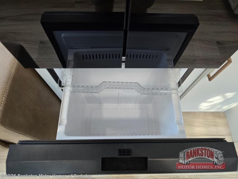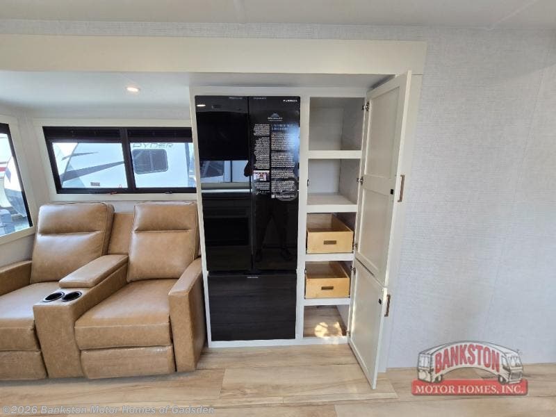 One look at this travel trailer and you'll be sold! The full rear bath features a spacious 42" x 30" shower with a built-in seat and Maxxair fan to name a few comforts. The front private bedroom features a 66" x 80" king bed with a MaxSpace Split-Level Wardrobe underneath to store shoes, clothes, and more! A slide out in the combined living area and kitchen makes your space more open, and you'll enjoy relaxing on the theater seating here in the evenings. The full kitchen includes a three burner stovetop, residential 30" convection microwave, 12 cu. ft. 12V refrigerator, plus a trash bin and Stow N' Go paper towel holder for added convenience. You can choose to eat outdoors under the 19' electric awning with LED lights or stay inside to dine at the pull-out dining table with a drawer for added storage! And if you're needing more sleeping space, just choose the optional tri-fold sofa in place of the theater seating!