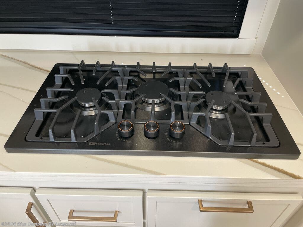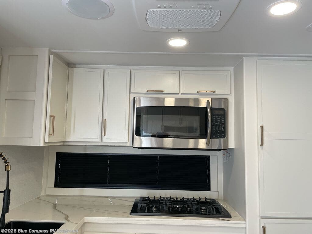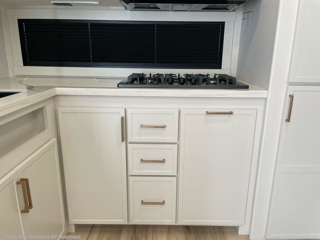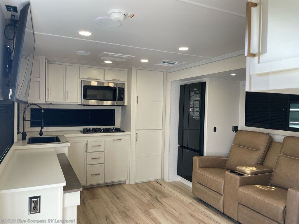 This travel trailer can comfortably sleep four with the king bed in the private bedroom and the tri-fold sofa in the main living area! The full bath features a spacious 42" x 30" shower with a built-in seat and Maxxair fan to name a few comforts. The front private bedroom features a 66" x 80" king bed with a MaxSpace Split-Level Wardrobe underneath to store shoes, clothes, and more! A slide out in the combined living area and rear kitchen makes your space more open, and you'll enjoy relaxing on the theater seating here in the evenings. The full kitchen includes a three burner stovetop, residential 30" convection microwave, 12 cu. ft. 12V refrigerator, plus a trash bin and Stow N' Go paper towel holder for added convenience. You can choose to eat outdoors under the 19' electric awning with LED lights or stay inside to dine at the pull-out dining table with a drawer for added storage!