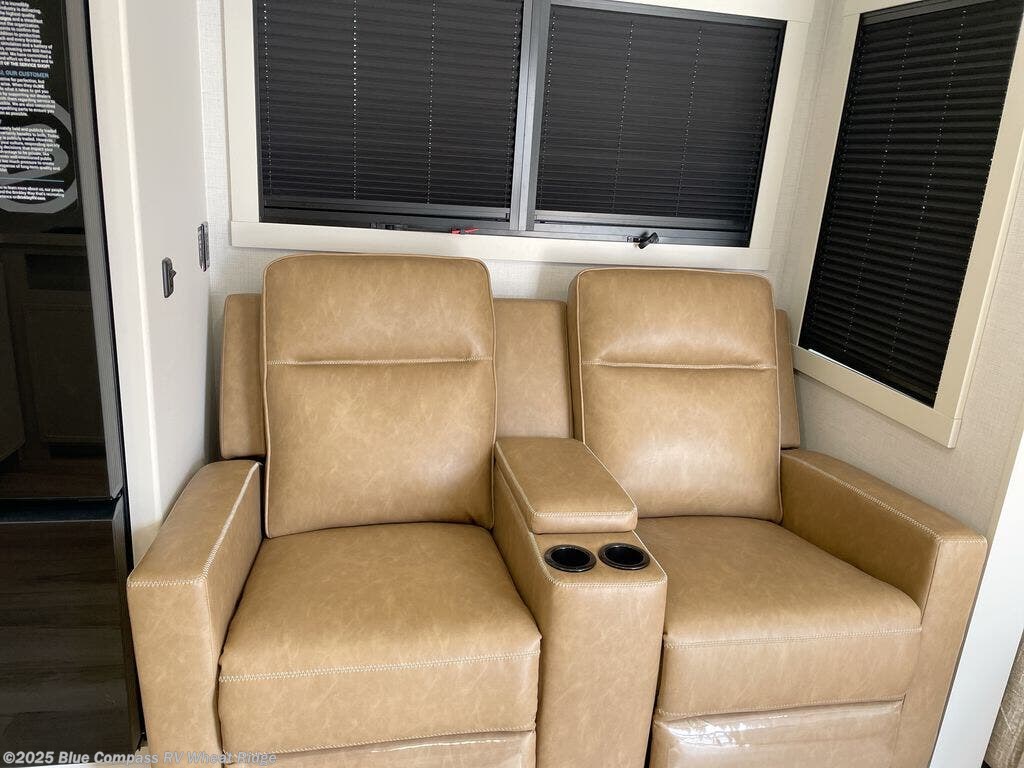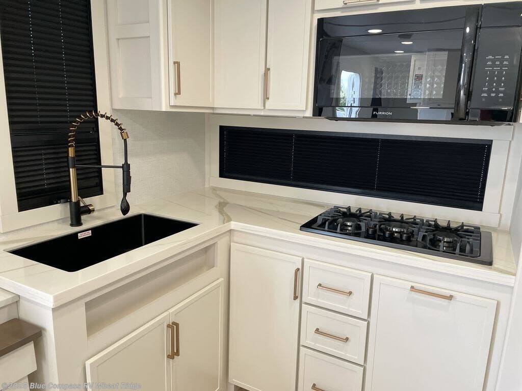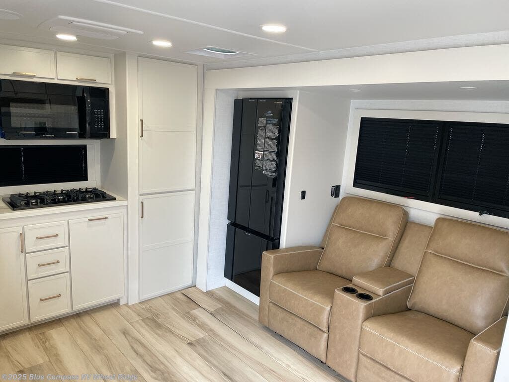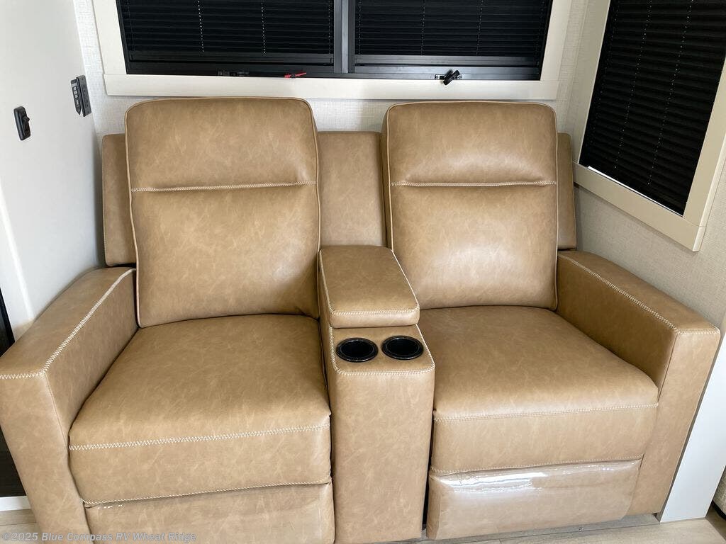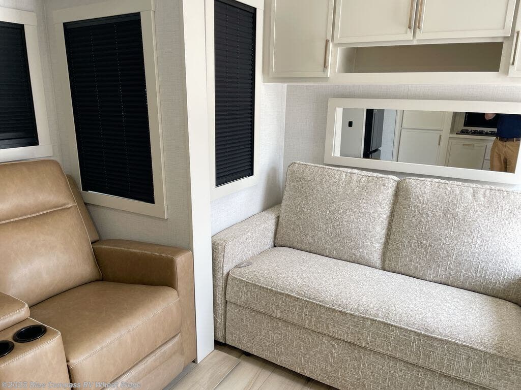 This travel trailer can comfortably sleep four with the king bed in the private bedroom and the tri-fold sofa in the main living area! The full bath features a spacious 42" x 30" shower with a built-in seat and Maxxair fan to name a few comforts. The front private bedroom features a 66" x 80" king bed with a MaxSpace Split-Level Wardrobe underneath to store shoes, clothes, and more! A slide out in the combined living area and rear kitchen makes your space more open, and you'll enjoy relaxing on the theater seating here in the evenings. The full kitchen includes a three burner stovetop, residential 30" convection microwave, 12 cu. ft. 12V refrigerator, plus a trash bin and Stow N' Go paper towel holder for added convenience. You can choose to eat outdoors under the 19' electric awning with LED lights or stay inside to dine at the pull-out dining table with a drawer for added storage!