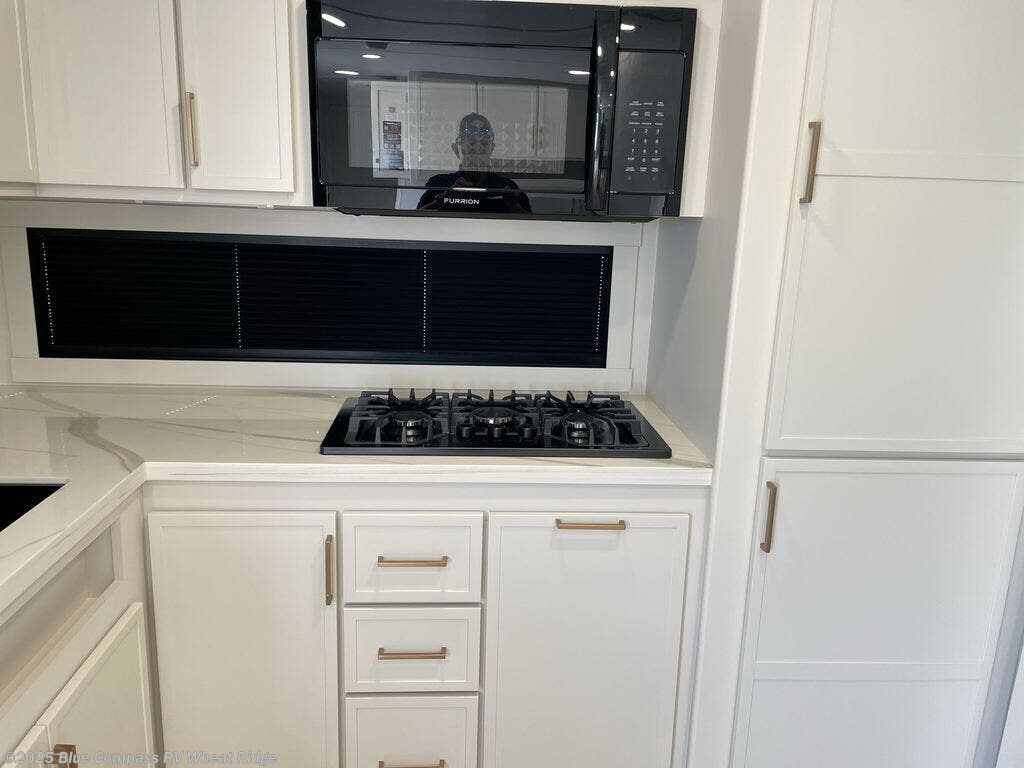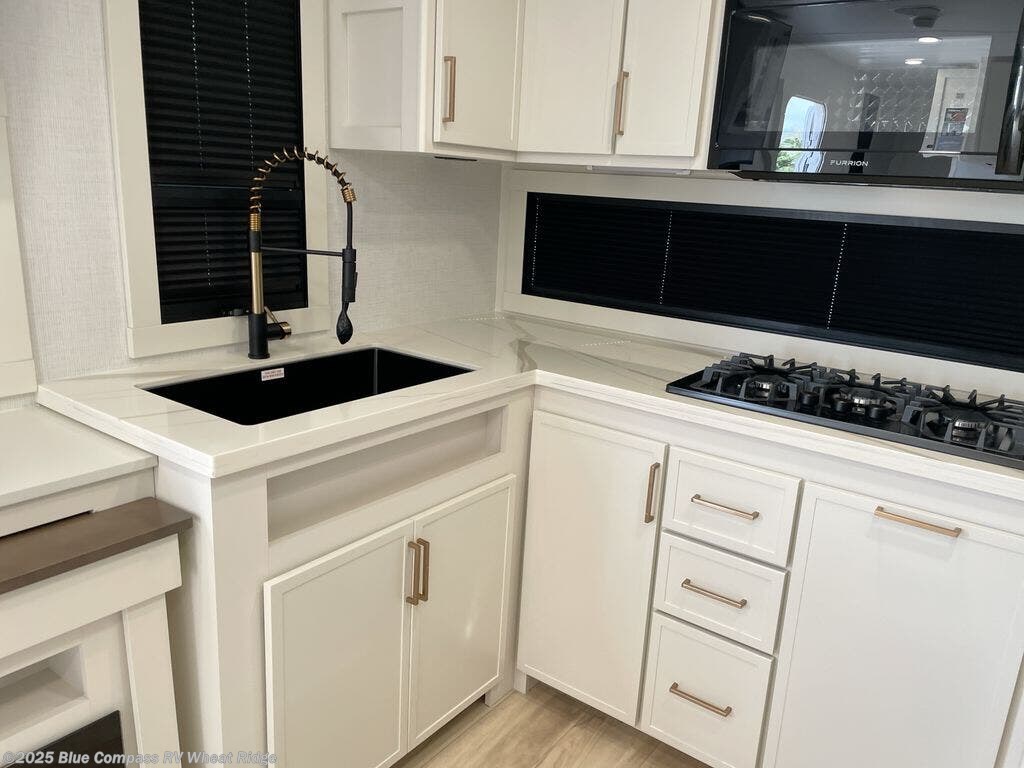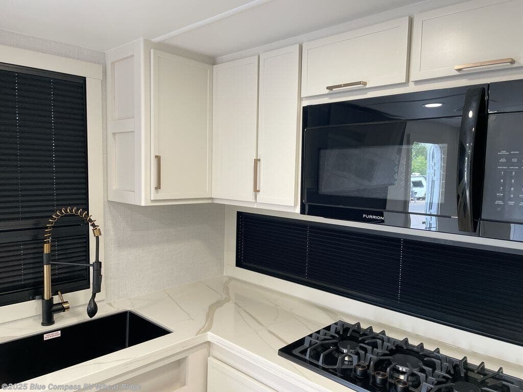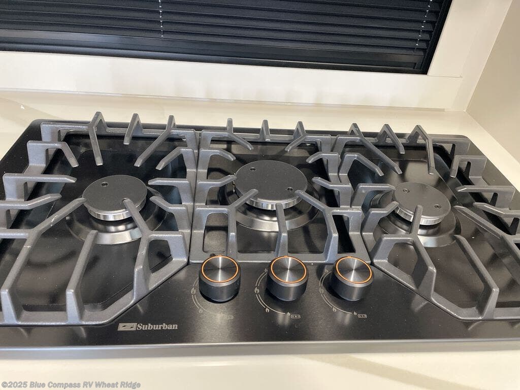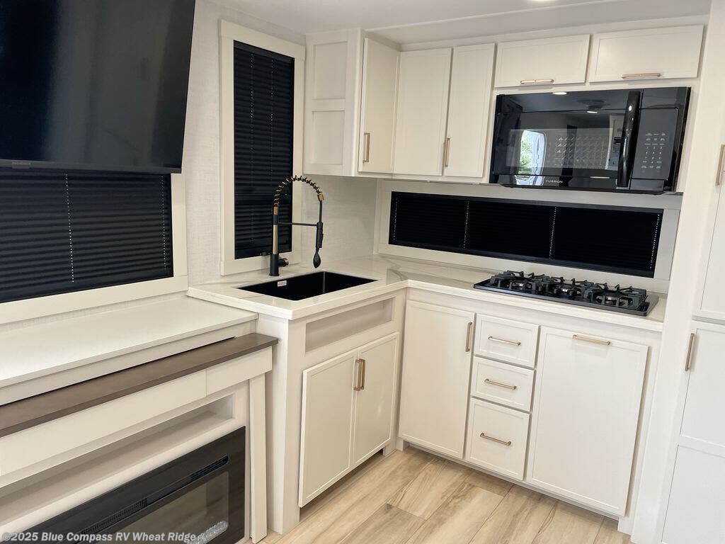 This travel trailer can comfortably sleep four with the king bed in the private bedroom and the tri-fold sofa in the main living area! The full bath features a spacious 42" x 30" shower with a built-in seat and Maxxair fan to name a few comforts. The front private bedroom features a 66" x 80" king bed with a MaxSpace Split-Level Wardrobe underneath to store shoes, clothes, and more! A slide out in the combined living area and rear kitchen makes your space more open, and you'll enjoy relaxing on the theater seating here in the evenings. The full kitchen includes a three burner stovetop, residential 30" convection microwave, 12 cu. ft. 12V refrigerator, plus a trash bin and Stow N' Go paper towel holder for added convenience. You can choose to eat outdoors under the 19' electric awning with LED lights or stay inside to dine at the pull-out dining table with a drawer for added storage!
