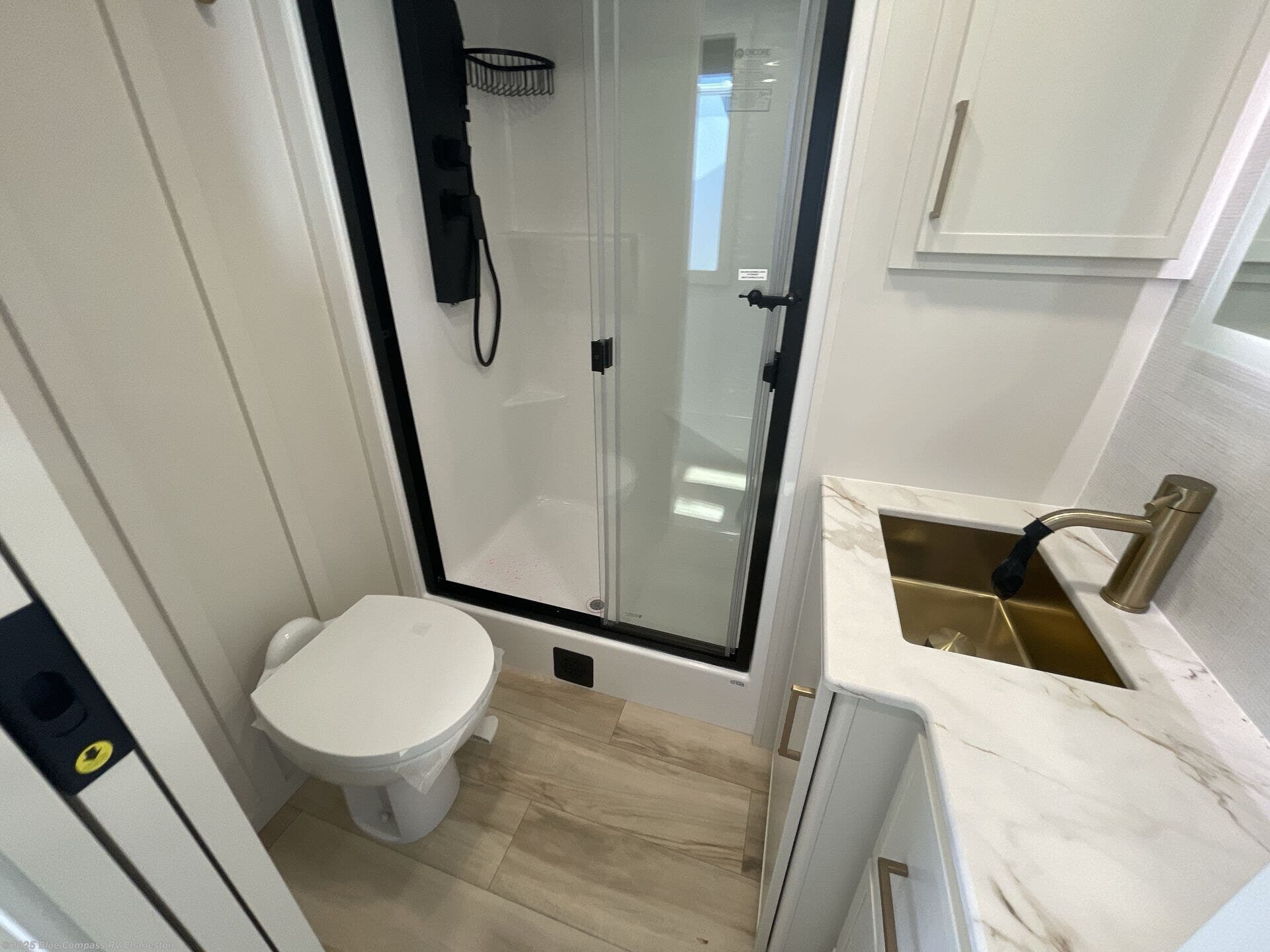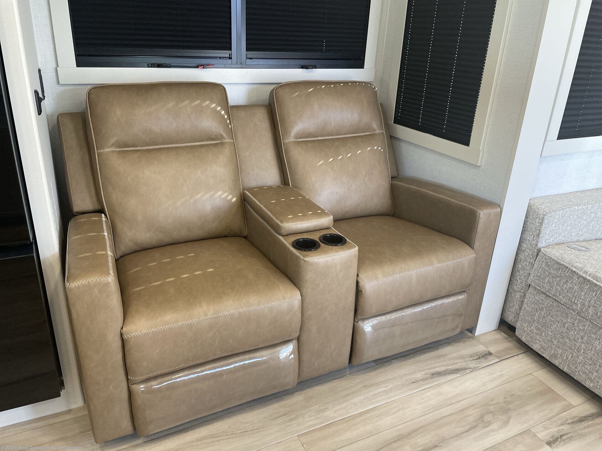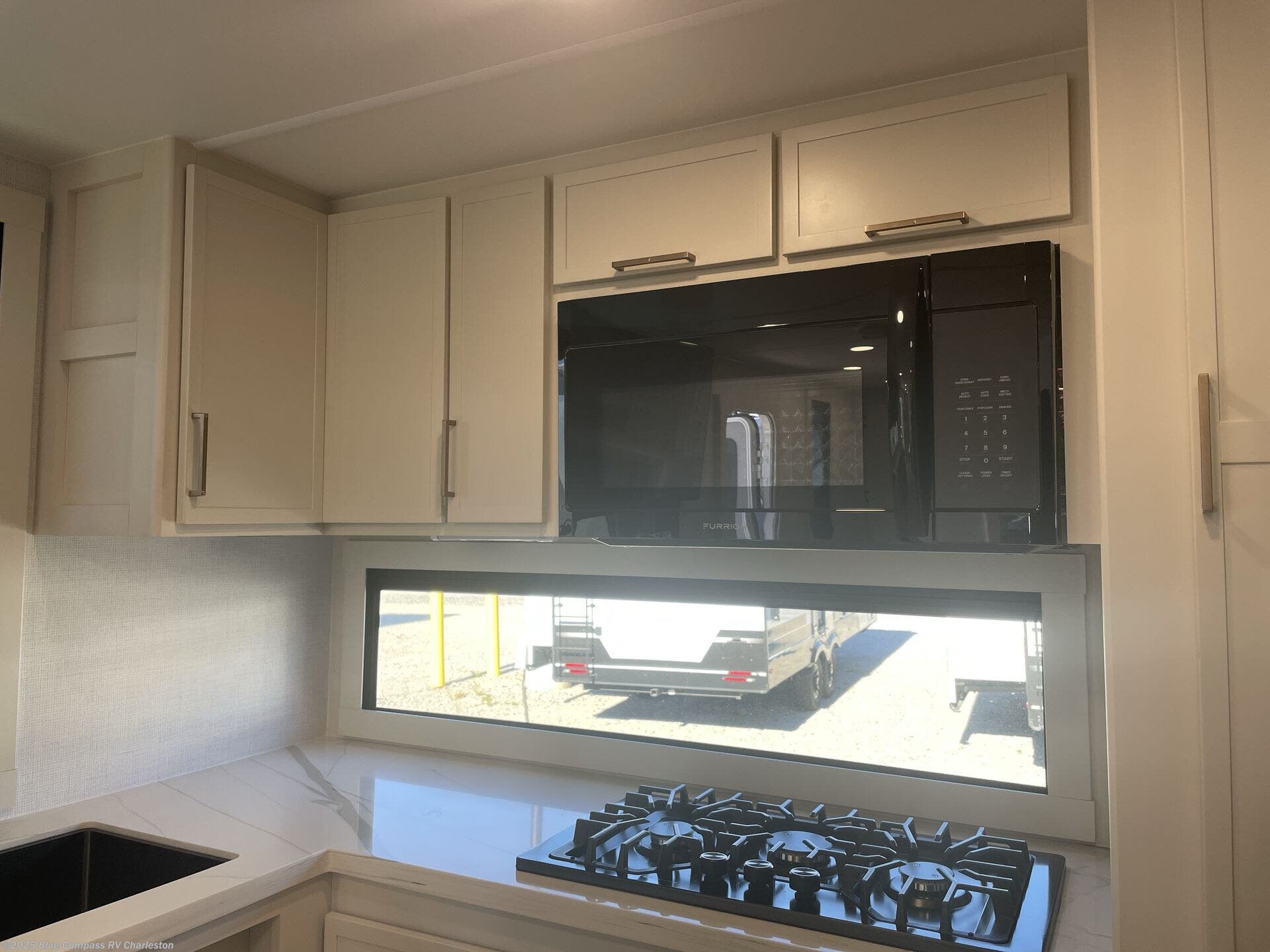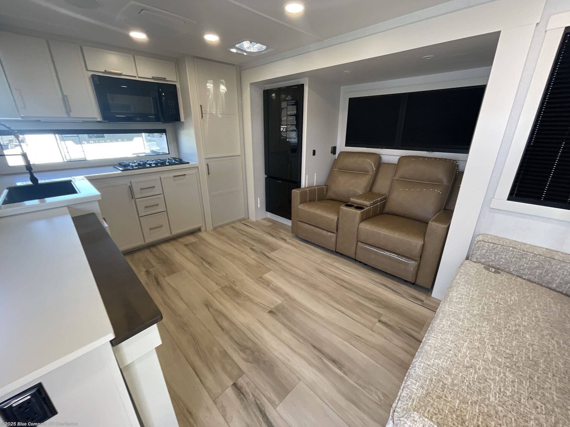 This travel trailer can comfortably sleep four with the king bed in the private bedroom and the tri-fold sofa in the main living area! The full bath features a spacious 42" x 30" shower with a built-in seat and Maxxair fan to name a few comforts. The front private bedroom features a 66" x 80" king bed with a MaxSpace Split-Level Wardrobe underneath to store shoes, clothes, and more! A slide out in the combined living area and rear kitchen makes your space more open, and you'll enjoy relaxing on the theater seating here in the evenings. The full kitchen includes a three burner stovetop, residential 30" convection microwave, 12 cu. ft. 12V refrigerator, plus a trash bin and Stow N' Go paper towel holder for added convenience. You can choose to eat outdoors under the 19' electric awning with LED lights or stay inside to dine at the pull-out dining table with a drawer for added storage!
