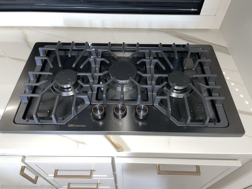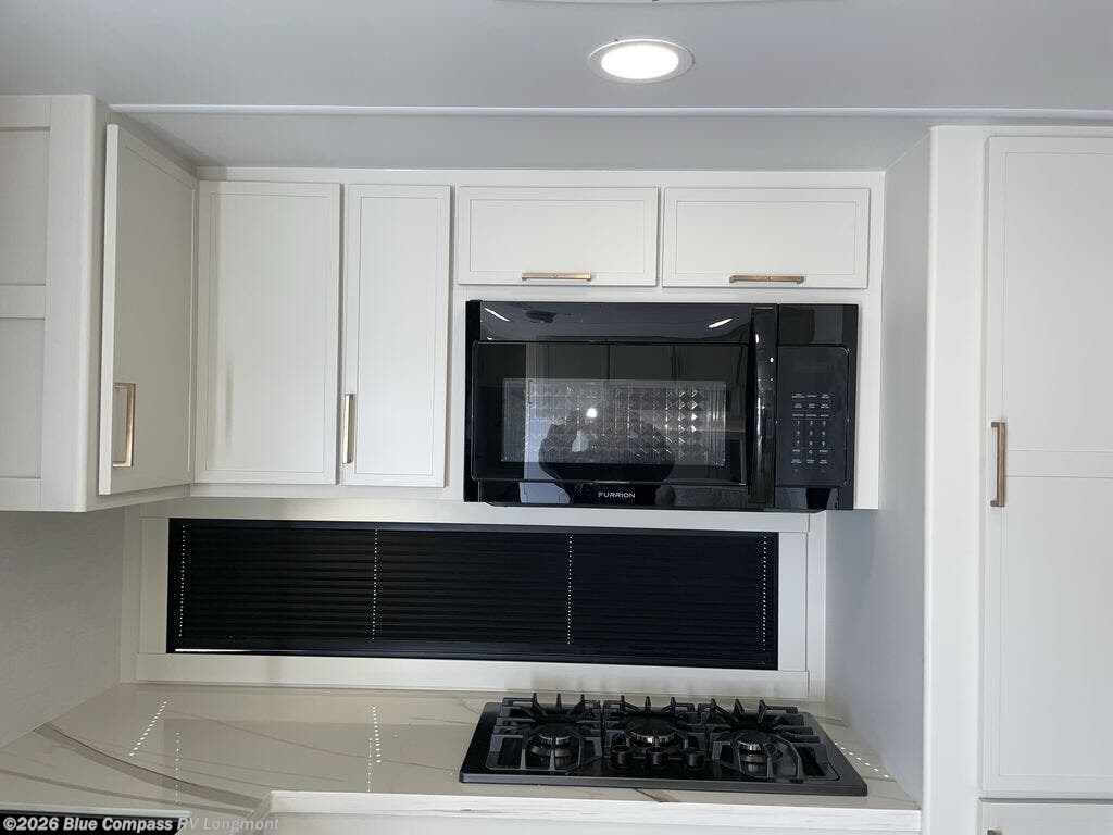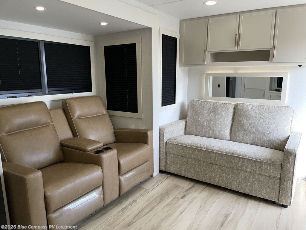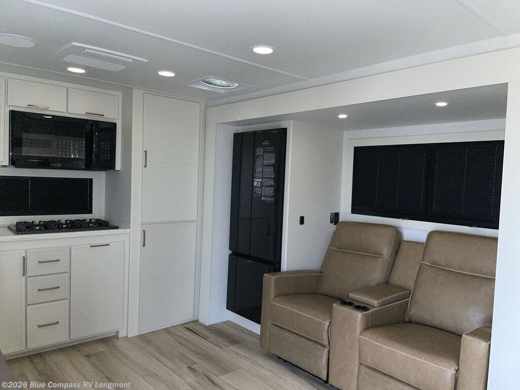 This travel trailer can comfortably sleep four with the king bed in the private bedroom and the tri-fold sofa in the main living area! The full bath features a spacious 42" x 30" shower with a built-in seat and Maxxair fan to name a few comforts. The front private bedroom features a 66" x 80" king bed with a MaxSpace Split-Level Wardrobe underneath to store shoes, clothes, and more! A slide out in the combined living area and rear kitchen makes your space more open, and you'll enjoy relaxing on the theater seating here in the evenings. The full kitchen includes a three burner stovetop, residential 30" convection microwave, 12 cu. ft. 12V refrigerator, plus a trash bin and Stow N' Go paper towel holder for added convenience. You can choose to eat outdoors under the 19' electric awning with LED lights or stay inside to dine at the pull-out dining table with a drawer for added storage!