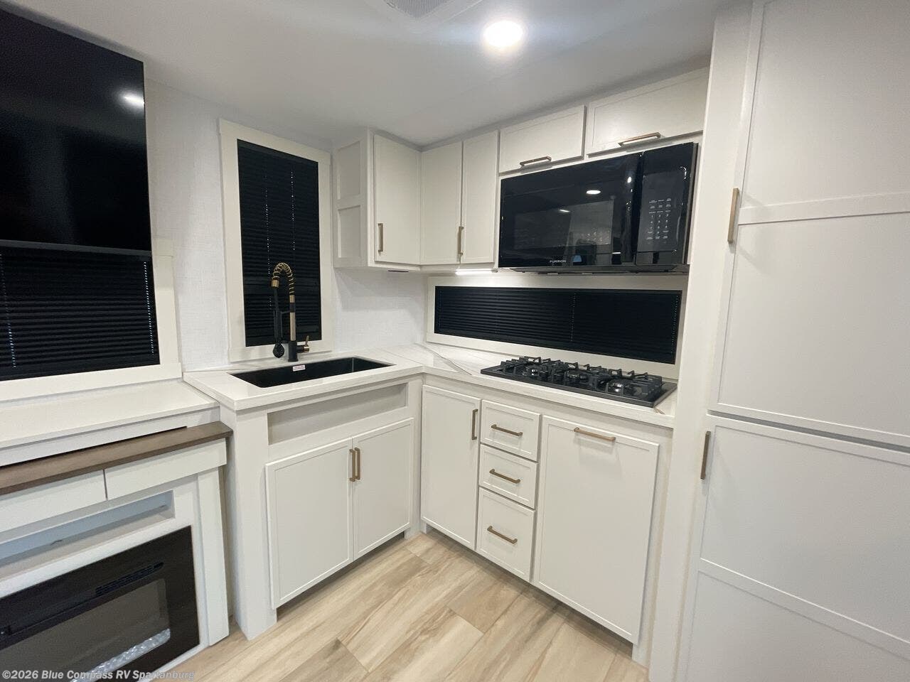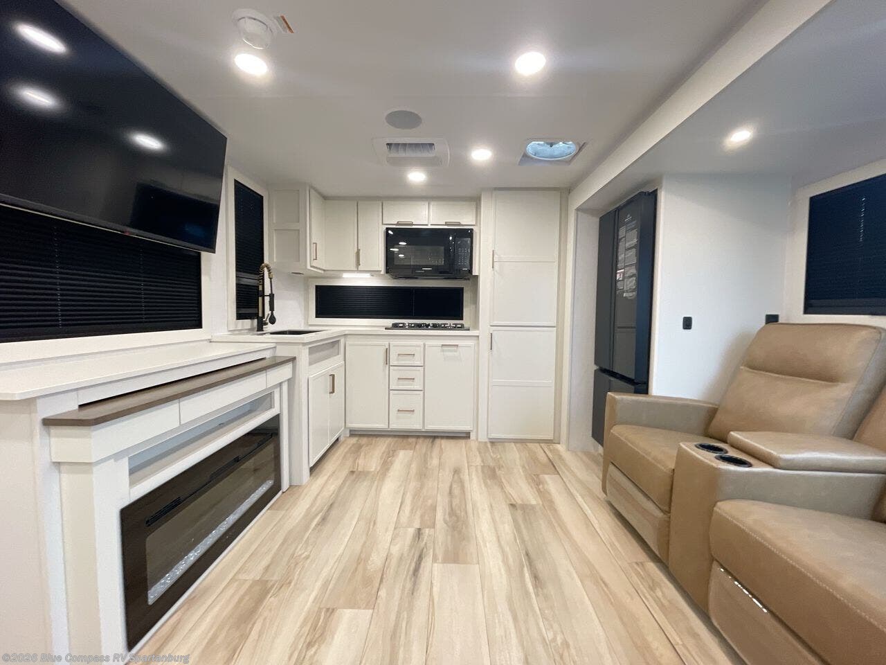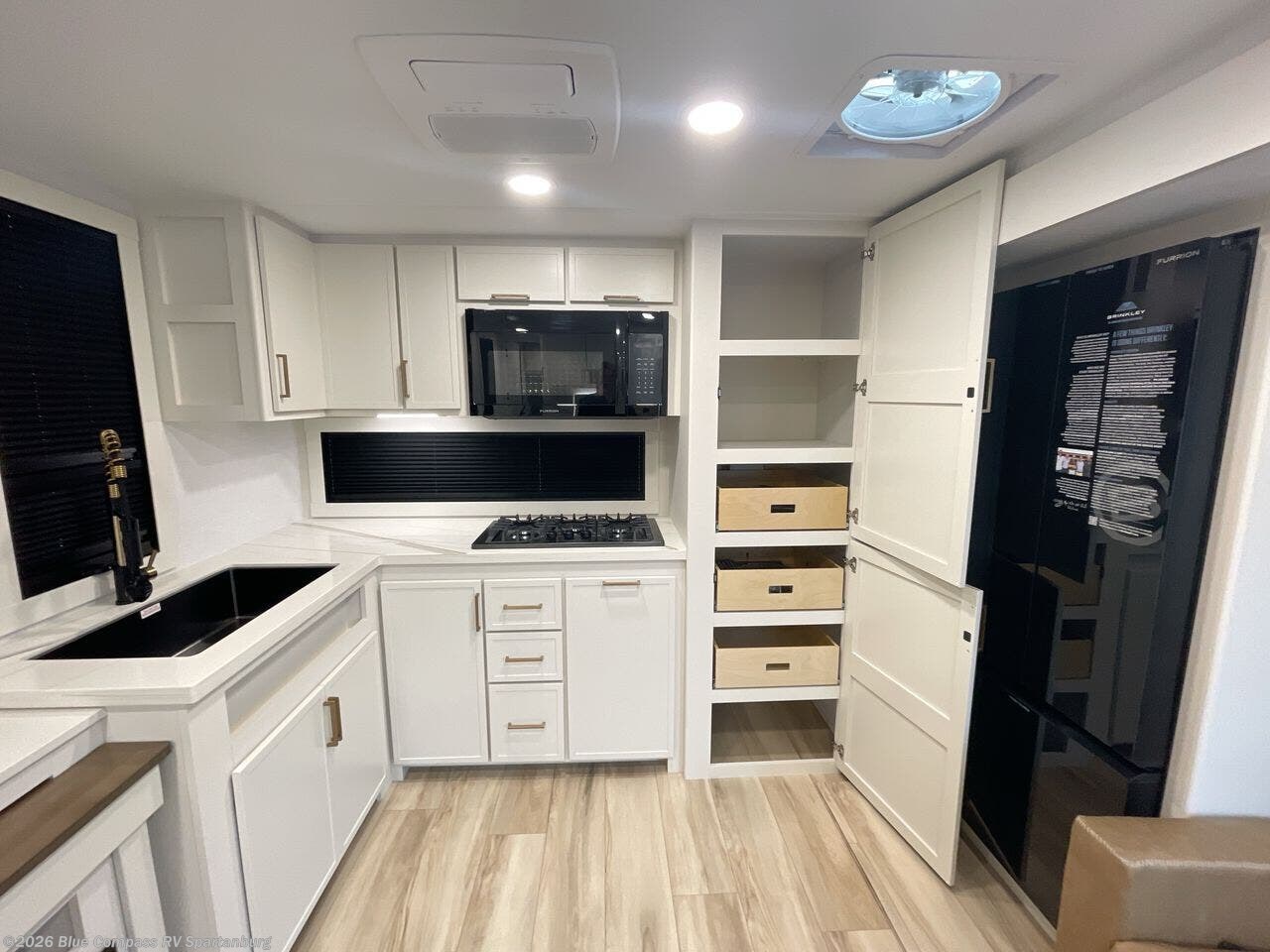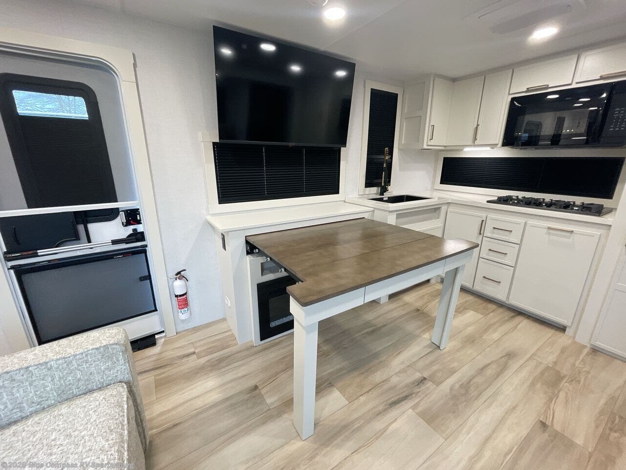 This travel trailer can comfortably sleep four with the king bed in the private bedroom and the tri-fold sofa in the main living area! The full bath features a spacious 42" x 30" shower with a built-in seat and Maxxair fan to name a few comforts. The front private bedroom features a 66" x 80" king bed with a MaxSpace Split-Level Wardrobe underneath to store shoes, clothes, and more! A slide out in the combined living area and rear kitchen makes your space more open, and you'll enjoy relaxing on the theater seating here in the evenings. The full kitchen includes a three burner stovetop, residential 30" convection microwave, 12 cu. ft. 12V refrigerator, plus a trash bin and Stow N' Go paper towel holder for added convenience. You can choose to eat outdoors under the 18' electric awning with LED lights or stay inside to dine at the pull-out dining table with a drawer for added storage!