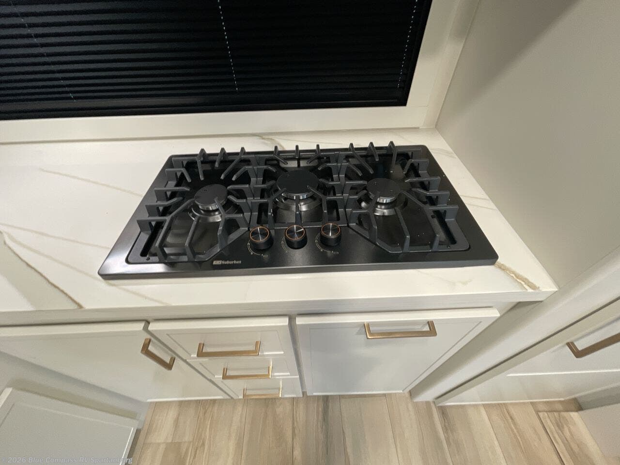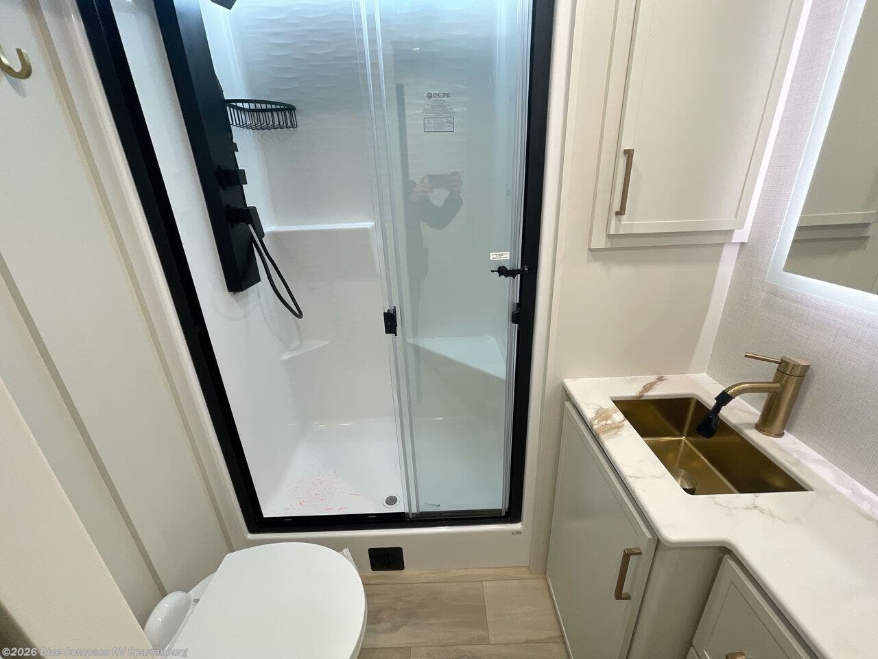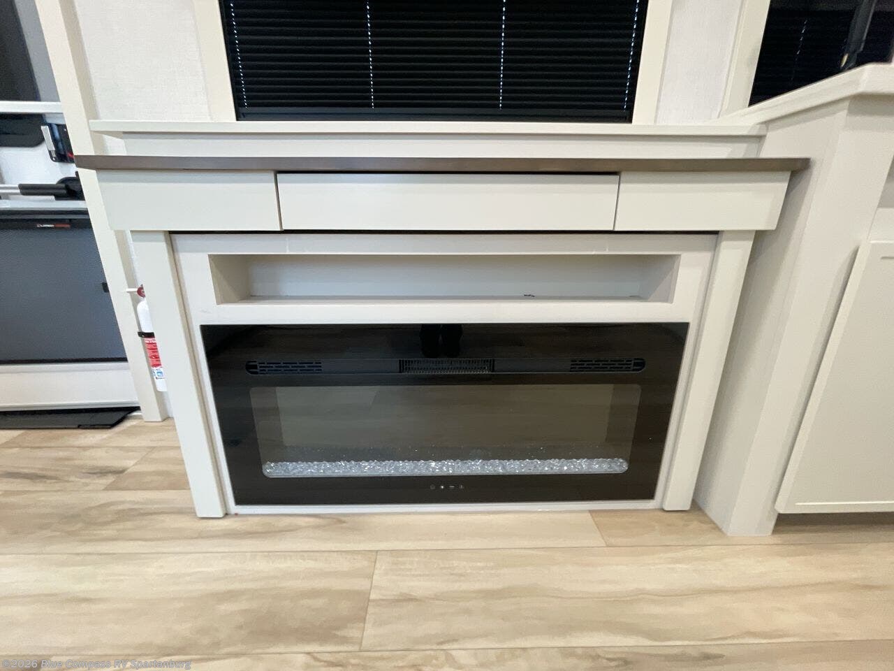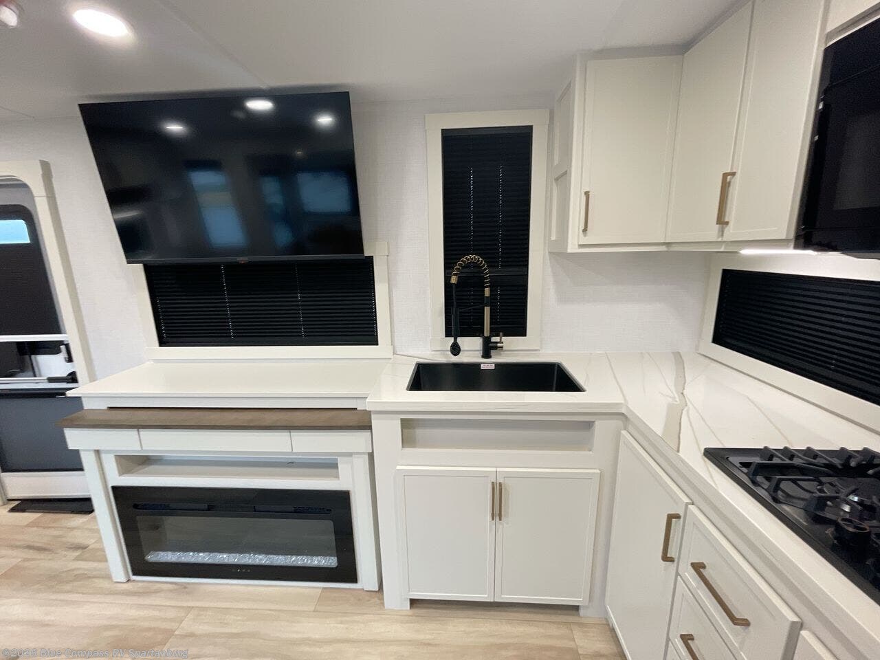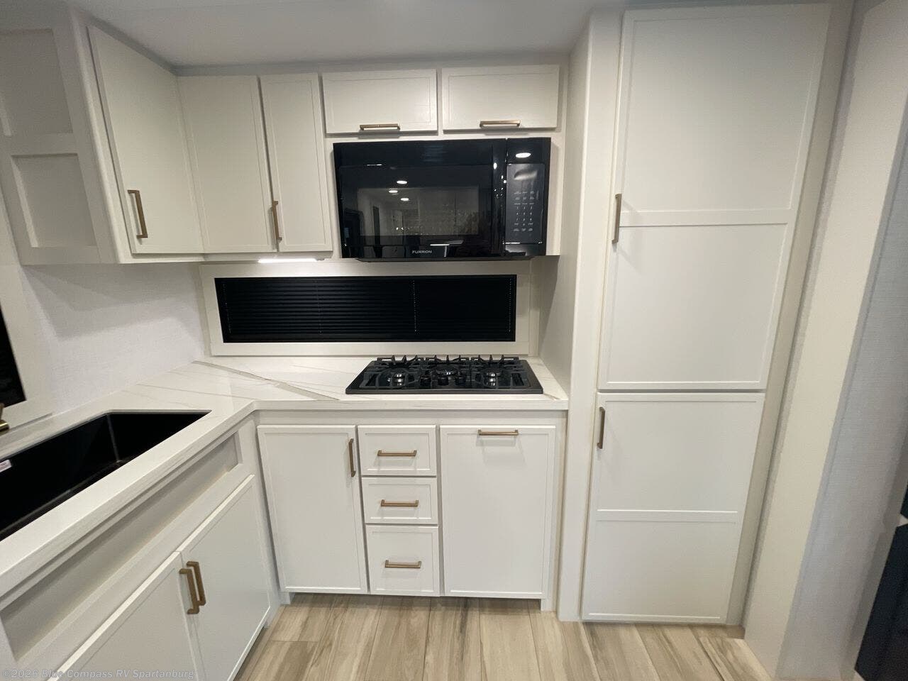 This travel trailer can comfortably sleep four with the king bed in the private bedroom and the tri-fold sofa in the main living area! The full bath features a spacious 42" x 30" shower with a built-in seat and Maxxair fan to name a few comforts. The front private bedroom features a 66" x 80" king bed with a MaxSpace Split-Level Wardrobe underneath to store shoes, clothes, and more! A slide out in the combined living area and rear kitchen makes your space more open, and you'll enjoy relaxing on the theater seating here in the evenings. The full kitchen includes a three burner stovetop, residential 30" convection microwave, 12 cu. ft. 12V refrigerator, plus a trash bin and Stow N' Go paper towel holder for added convenience. You can choose to eat outdoors under the 18' electric awning with LED lights or stay inside to dine at the pull-out dining table with a drawer for added storage!