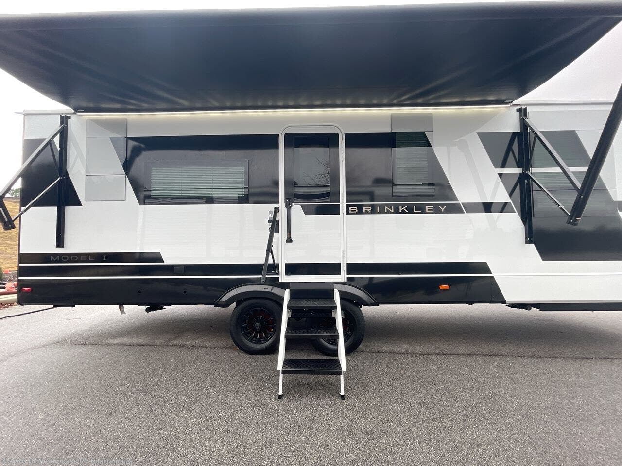 The lightweight Model I travel trailer by Brinkley is the perfect choice for those looking for an easy tow and at-home comforts! There is a drop-frame chassis, high-performance Road Armor suspension equalizer system, and Demco EZ Latch trailer coupler that automatically latches when dropped onto a hitch ball without the need of a safety pin. Additional exterior features include square Euro frameless windows, automotive-grade paint, full-width LED strip lighting in the pass-thru, and a pet & property security campside tie-down to keep your gear and furry friends safe. Inside, you'll be wowed by Brinkley's CraftSense wood trim construction, residential solid surface kitchen countertops, dimmable bedroom lights, and marine-grade neon LED shower lighting to name a few stand-out features!