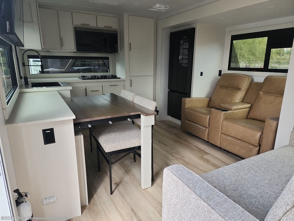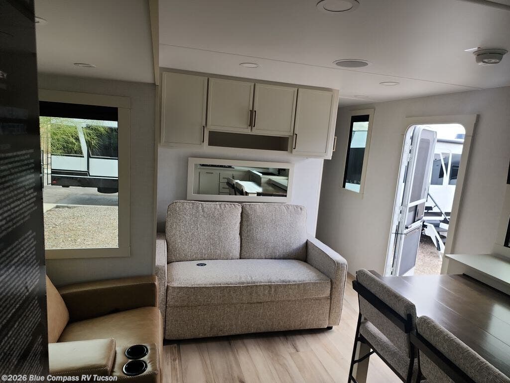 This travel trailer can comfortably sleep four with the king bed in the private bedroom and the tri-fold sofa in the main living area! The full bath features a spacious 42" x 30" shower with a built-in seat and Maxxair fan to name a few comforts. The front private bedroom features a 66" x 80" king bed with a MaxSpace Split-Level Wardrobe underneath to store shoes, clothes, and more! A slide out in the combined living area and rear kitchen makes your space more open, and you'll enjoy relaxing on the theater seating here in the evenings. The full kitchen includes a three burner stovetop, residential 30" convection microwave, 12 cu. ft. 12V refrigerator, plus a trash bin and Stow N' Go paper towel holder for added convenience. You can choose to eat outdoors under the 18' electric awning with LED lights or stay inside to dine at the pull-out dining table with a drawer for added storage!