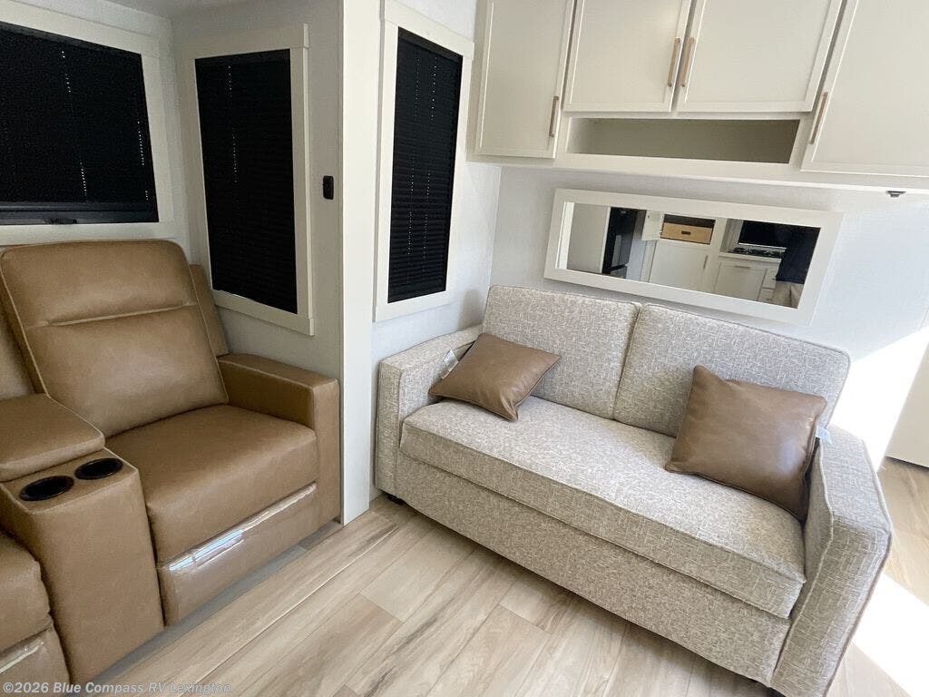 This travel trailer can comfortably sleep four with the king bed in the private bedroom and the tri-fold sofa in the main living area! The full bath features a spacious 42" x 30" shower with a built-in seat and Maxxair fan to name a few comforts. The front private bedroom features a 66" x 80" king bed with a MaxSpace Split-Level Wardrobe underneath to store shoes, clothes, and more! A slide out in the combined living area and rear kitchen makes your space more open, and you'll enjoy relaxing on the theater seating here in the evenings. The full kitchen includes a three burner stovetop, residential 30" convection microwave, 12 cu. ft. 12V refrigerator, plus a trash bin and Stow N' Go paper towel holder for added convenience. You can choose to eat outdoors under the 18' electric awning with LED lights or stay inside to dine at the pull-out dining table with a drawer for added storage!