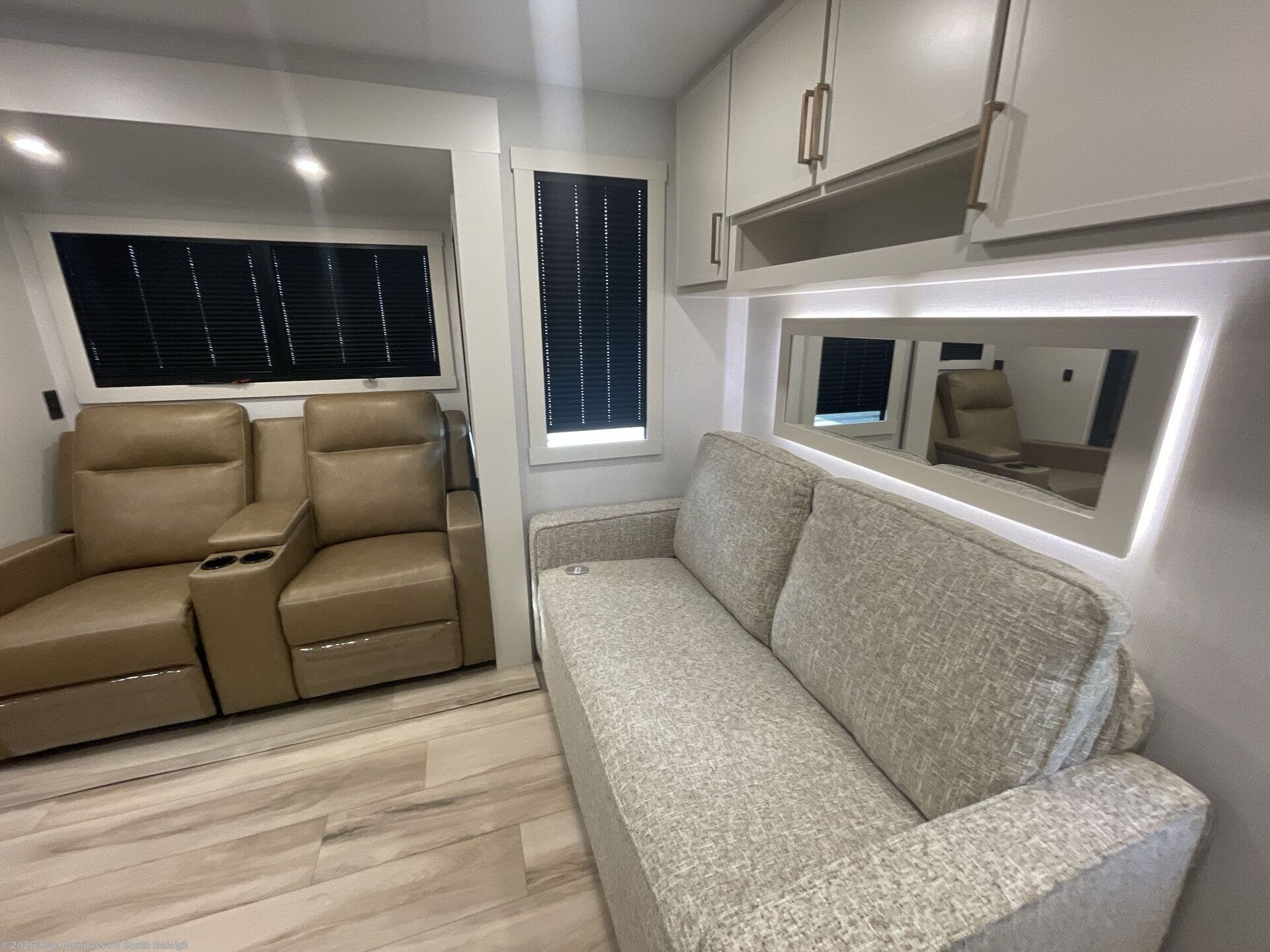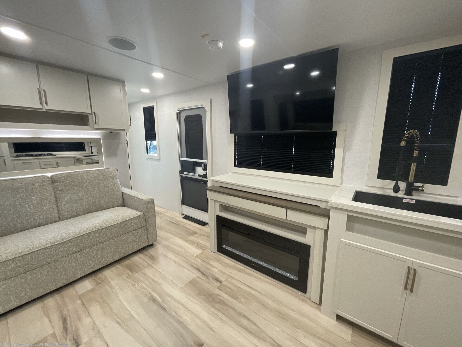This travel trailer can comfortably sleep four with the king bed in the private bedroom and the tri-fold sofa in the main living area! The full bath features a spacious 42" x 30" shower with a built-in seat and Maxxair fan to name a few comforts. The front private bedroom features a 66" x 80" king bed with a MaxSpace Split-Level Wardrobe underneath to store shoes, clothes, and more! A slide out in the combined living area and rear kitchen makes your space more open, and you'll enjoy relaxing on the theater seating here in the evenings. The full kitchen includes a three burner stovetop, residential 30" convection microwave, 12 cu. ft. 12V refrigerator, plus a trash bin and Stow N' Go paper towel holder for added convenience. You can choose to eat outdoors under the 18' electric awning with LED lights or stay inside to dine at the pull-out dining table with a drawer for added storage!