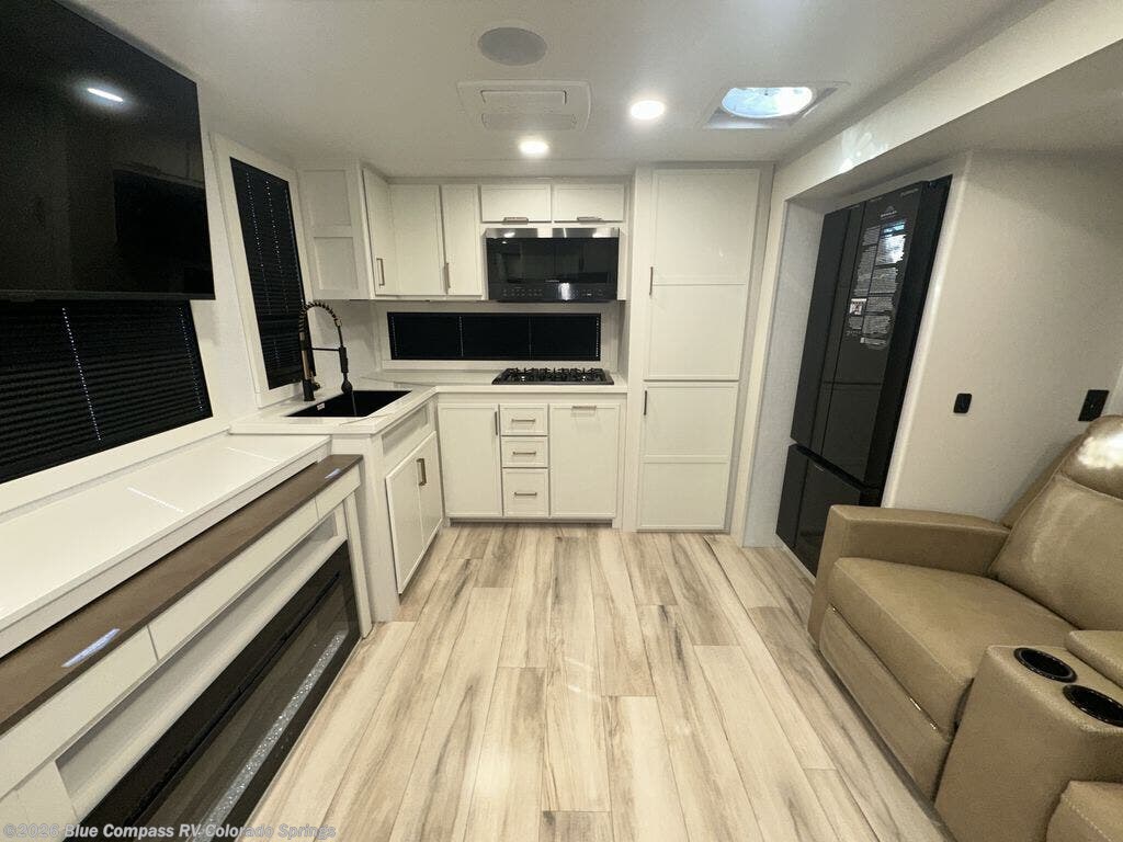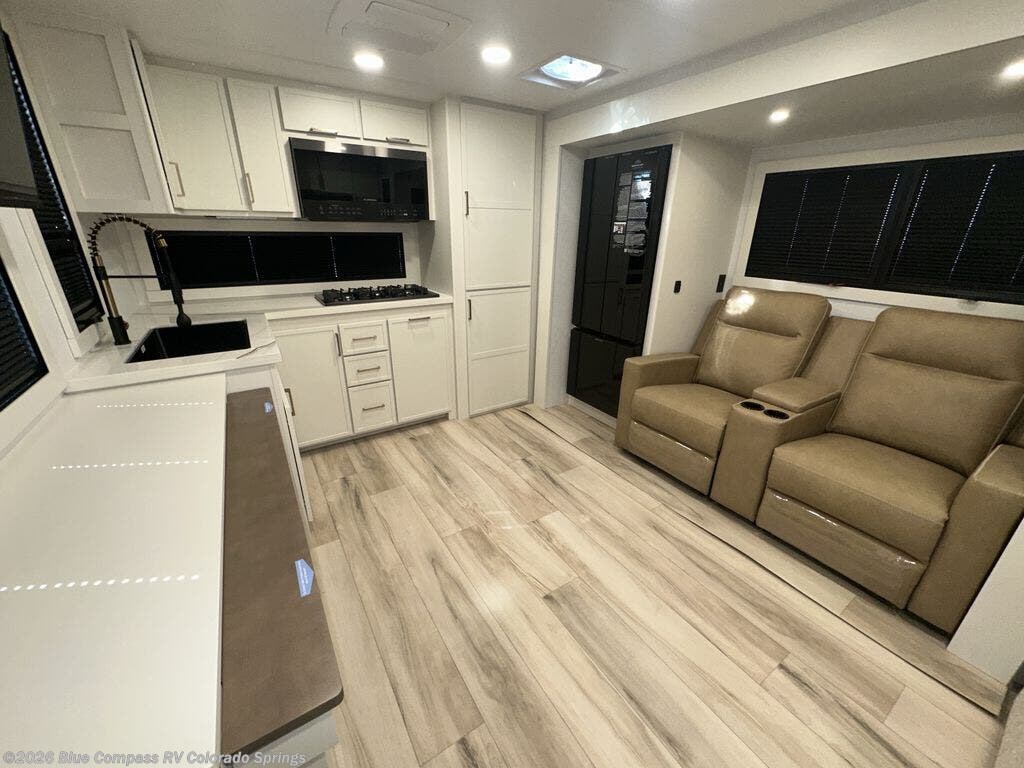 This travel trailer can comfortably sleep four with the king bed in the private bedroom and the tri-fold sofa in the main living area! The full bath features a spacious 42" x 30" shower with a built-in seat and Maxxair fan to name a few comforts. The front private bedroom features a 66" x 80" king bed with a MaxSpace Split-Level Wardrobe underneath to store shoes, clothes, and more! A slide out in the combined living area and rear kitchen makes your space more open, and you'll enjoy relaxing on the theater seating here in the evenings. The full kitchen includes a three burner stovetop, residential 30" convection microwave, 12 cu. ft. 12V refrigerator, plus a trash bin and Stow N' Go paper towel holder for added convenience. You can choose to eat outdoors under the 18' electric awning with LED lights or stay inside to dine at the pull-out dining table with a drawer for added storage!