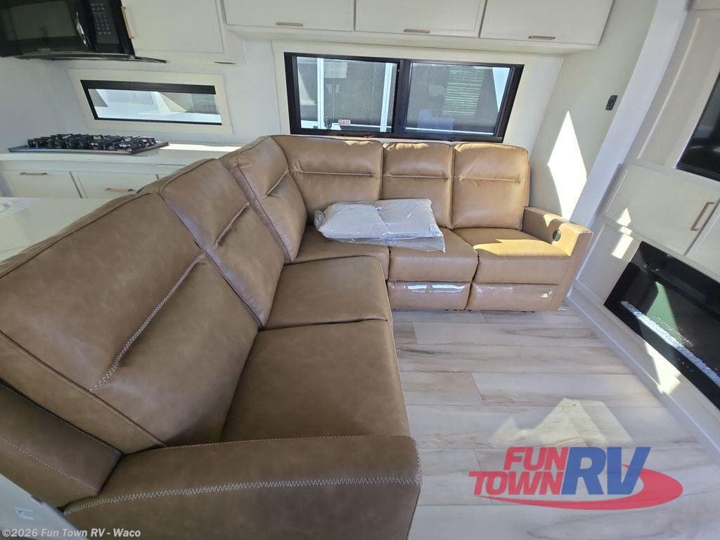 Savor the joy of cooking and sharing meals with loved ones in this beautifully appointed kitchen! This rear kitchen features a spacious pantry with drawers and outlets, a 30" convection microwave, a flip-up counter, and a 12V refrigerator. The convertible dining table and L-desk create a refined space for meals, work, and relaxation. The adjacent L-sofa forms a cozy sanctuary for reading, socializing, or enjoying the entertainment center and fireplace. There is a full bathroom with everything you need to keep your personal hygiene on the road. Plus, the front bedroom’s peaceful haven features a plush king bed, nightstands with storage, and a MaxSpace split-level wardrobe. Additionally, the two exterior awnings create a spacious outdoor living area, ideal for relaxing, entertaining, or enjoying the great outdoors.