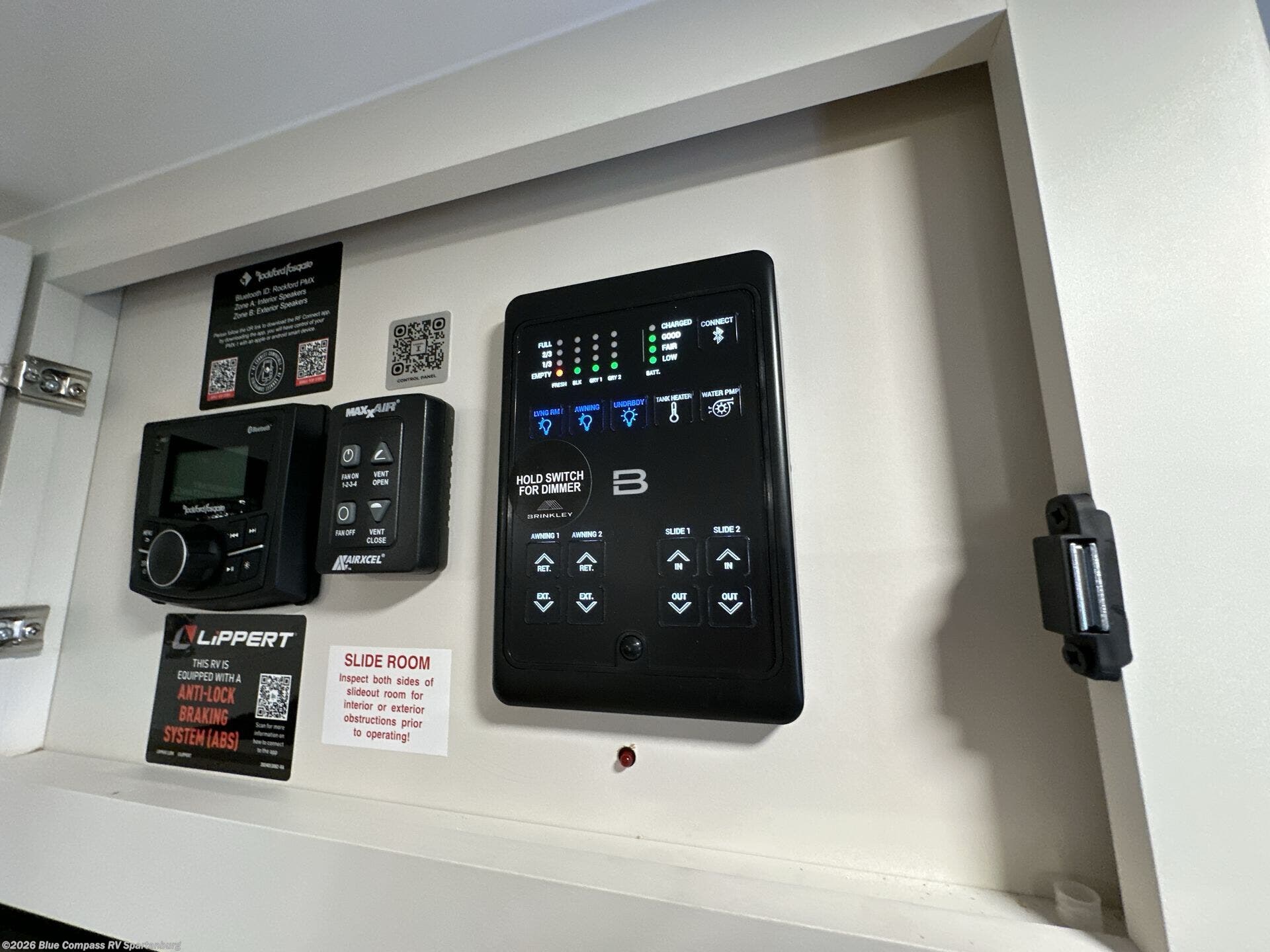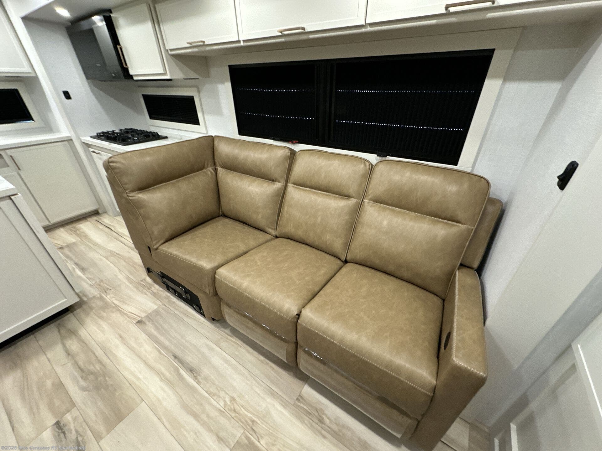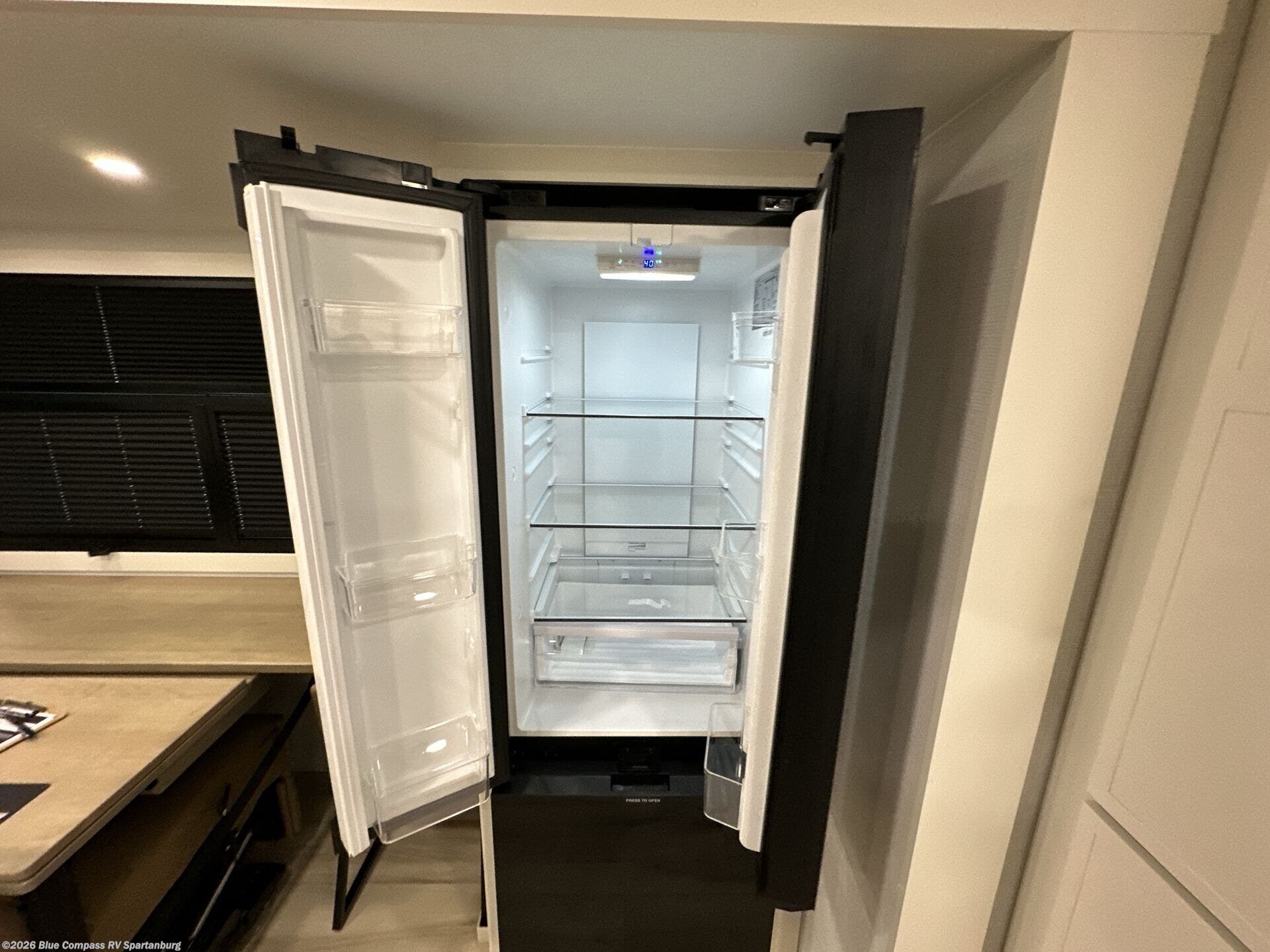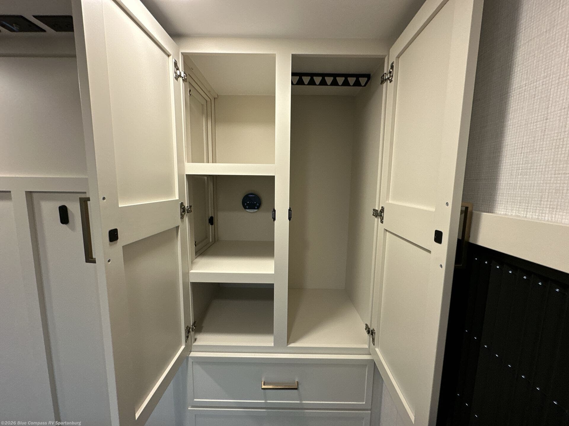 Savor the joy of cooking and sharing meals with loved ones in this beautifully appointed kitchen! This rear kitchen features a spacious pantry with drawers and outlets, a 30" convection microwave, a flip-up counter, and a 12V refrigerator. The convertible dining table and L-desk create a refined space for meals, work, and relaxation. The adjacent L-sofa forms a cozy sanctuary for reading, socializing, or enjoying the entertainment center and fireplace. There is a full bathroom with everything you need to keep your personal hygiene on the road. Plus, the front bedroom’s peaceful haven features a plush king bed, nightstands with storage, and a MaxSpace split-level wardrobe. Additionally, the two exterior awnings create a spacious outdoor living area, ideal for relaxing, entertaining, or enjoying the great outdoors.
