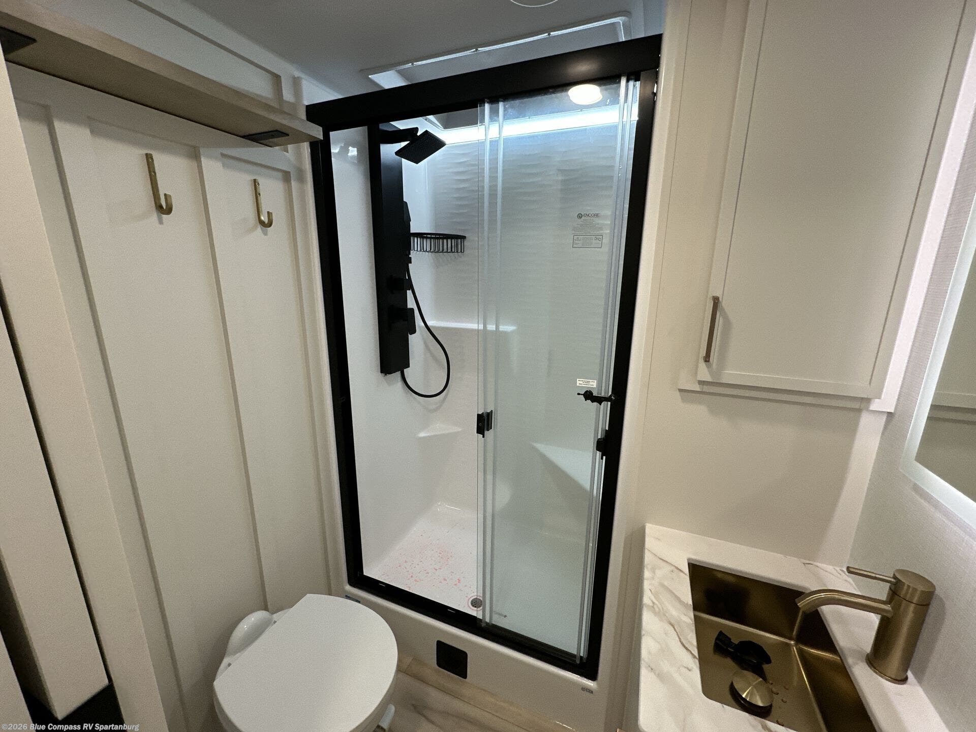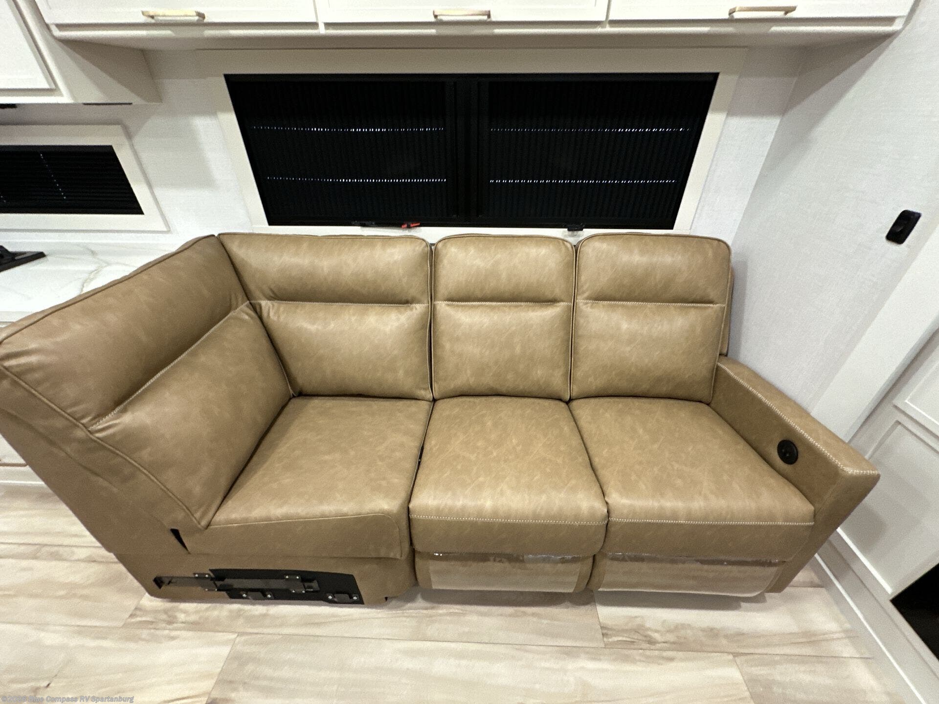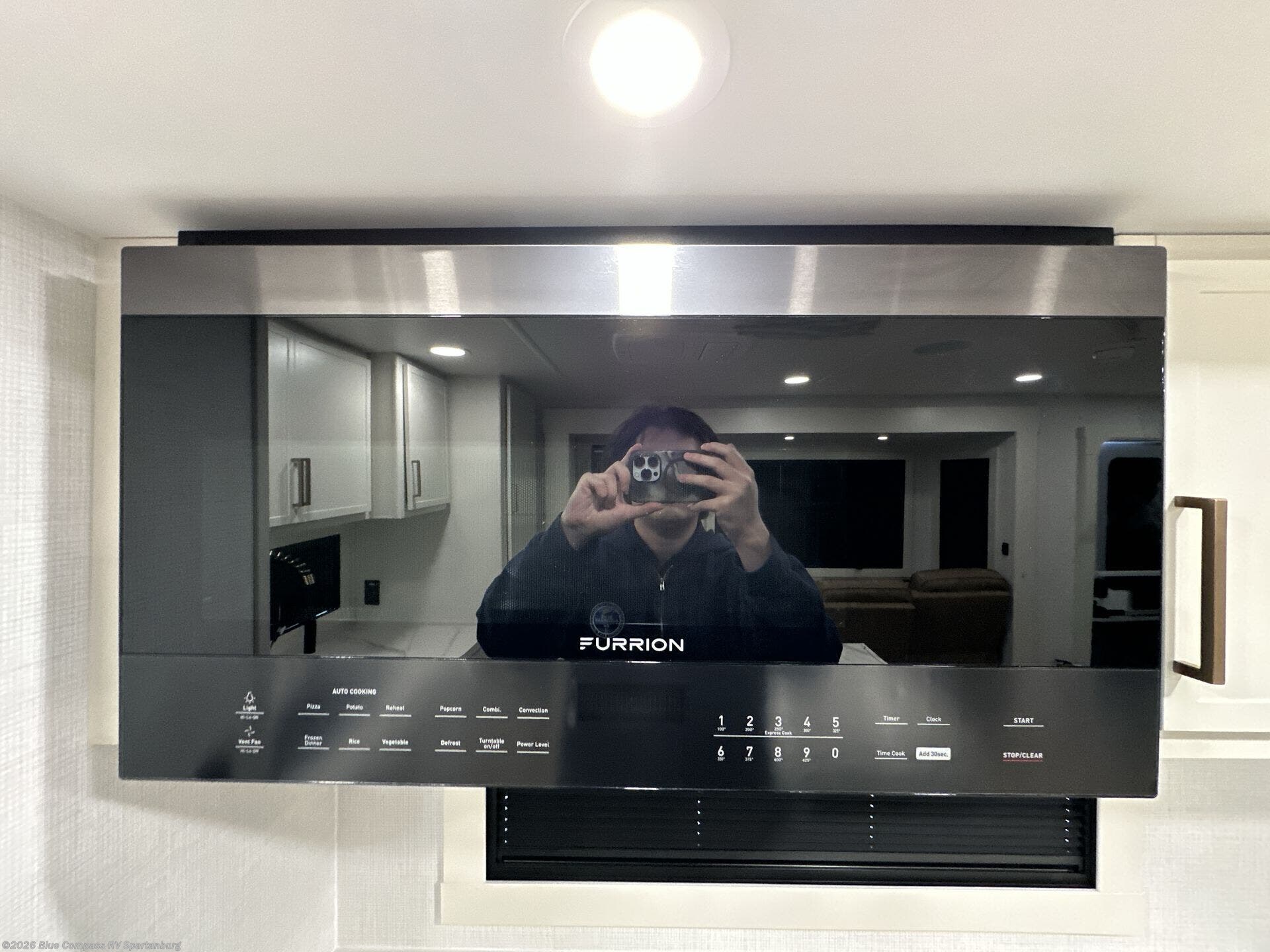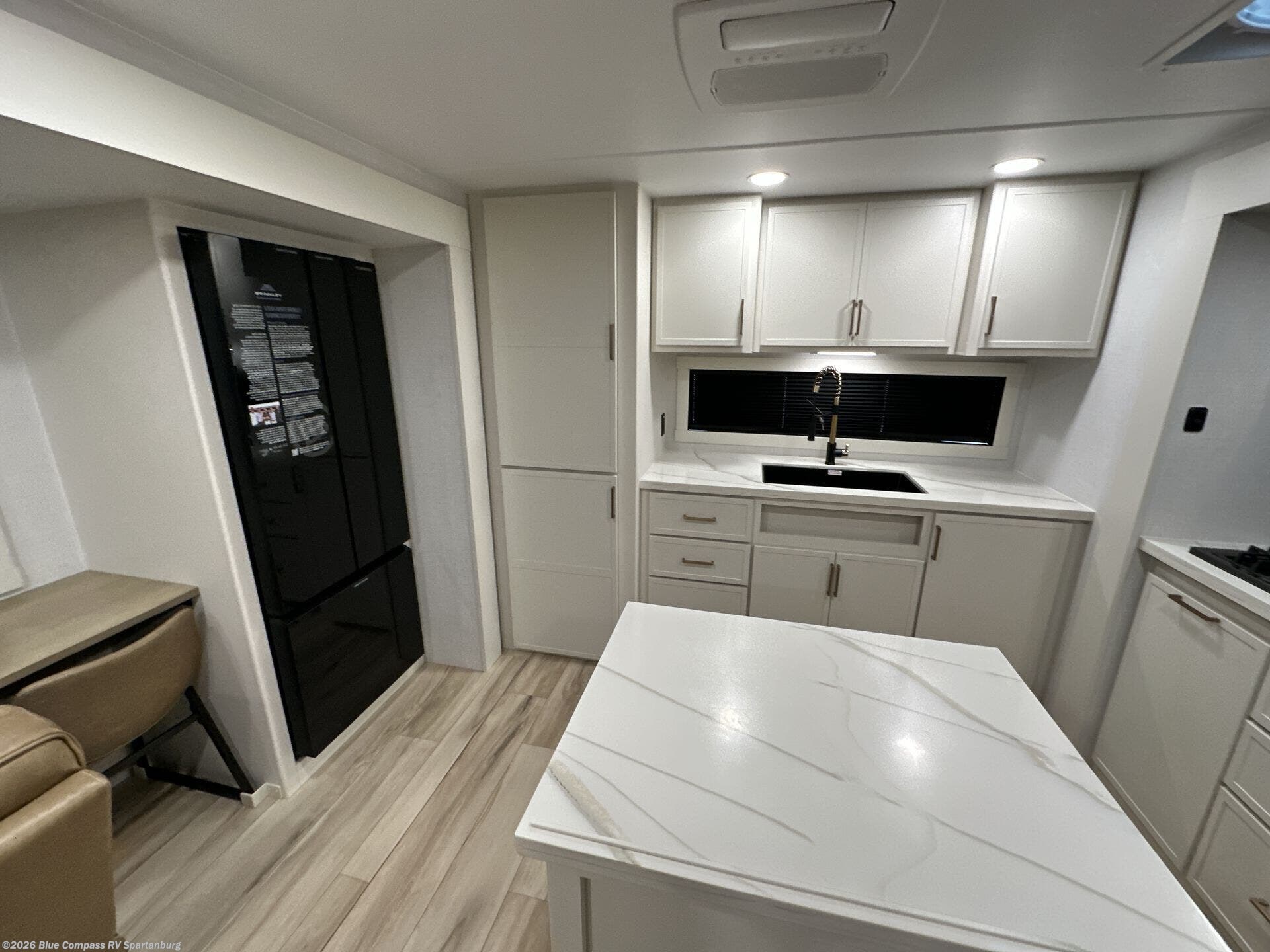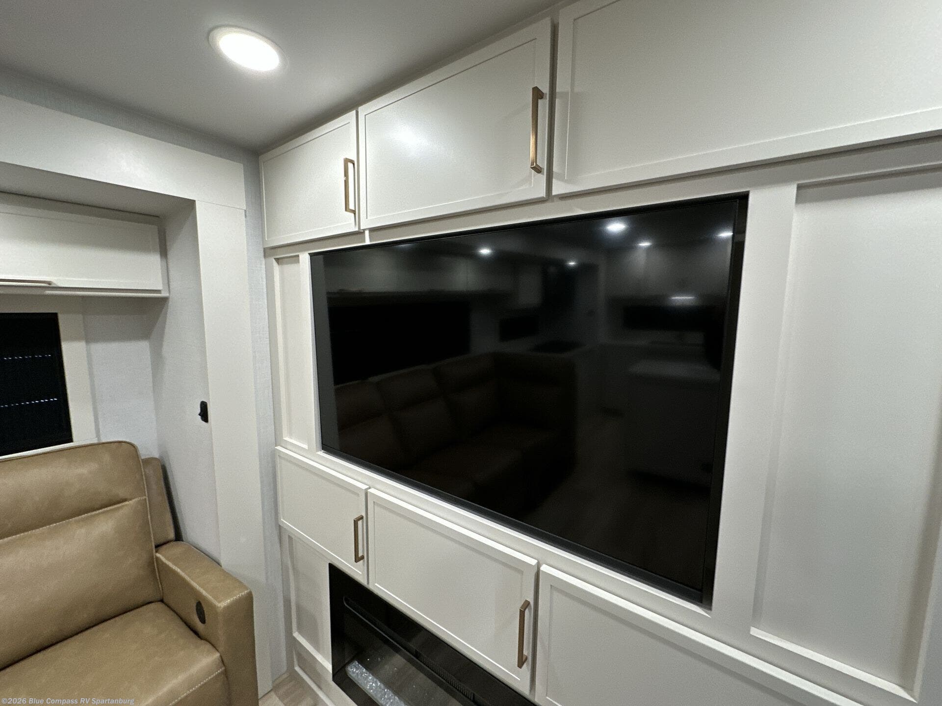 Savor the joy of cooking and sharing meals with loved ones in this beautifully appointed kitchen! This rear kitchen features a spacious pantry with drawers and outlets, a 30" convection microwave, a flip-up counter, and a 12V refrigerator. The convertible dining table and L-desk create a refined space for meals, work, and relaxation. The adjacent L-sofa forms a cozy sanctuary for reading, socializing, or enjoying the entertainment center and fireplace. There is a full bathroom with everything you need to keep your personal hygiene on the road. Plus, the front bedroom’s peaceful haven features a plush king bed, nightstands with storage, and a MaxSpace split-level wardrobe. Additionally, the two exterior awnings create a spacious outdoor living area, ideal for relaxing, entertaining, or enjoying the great outdoors.