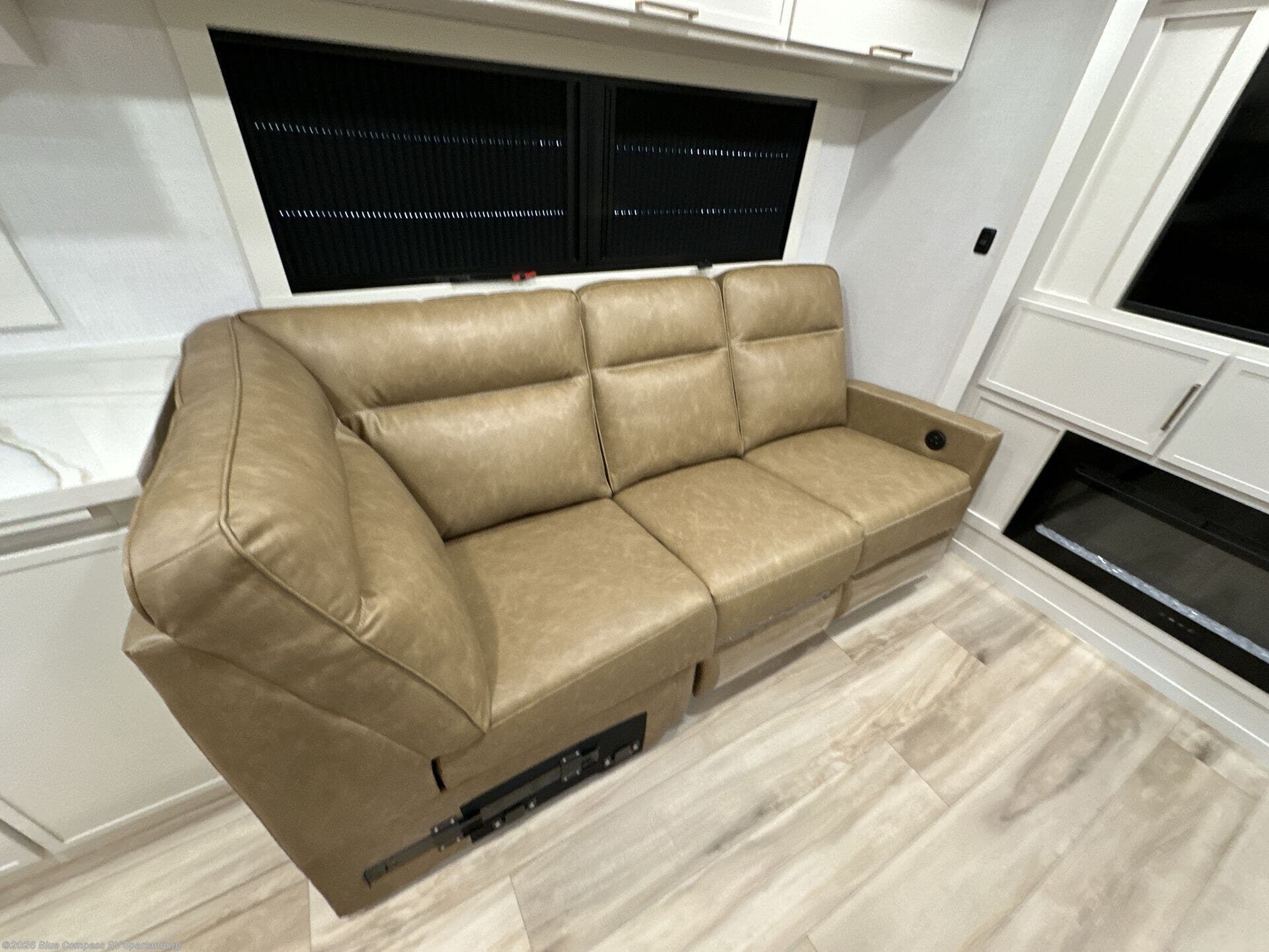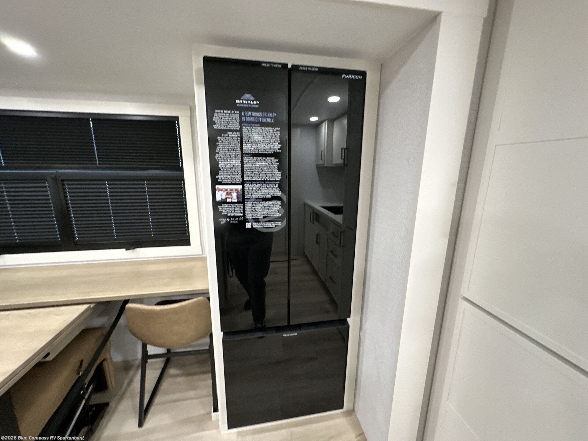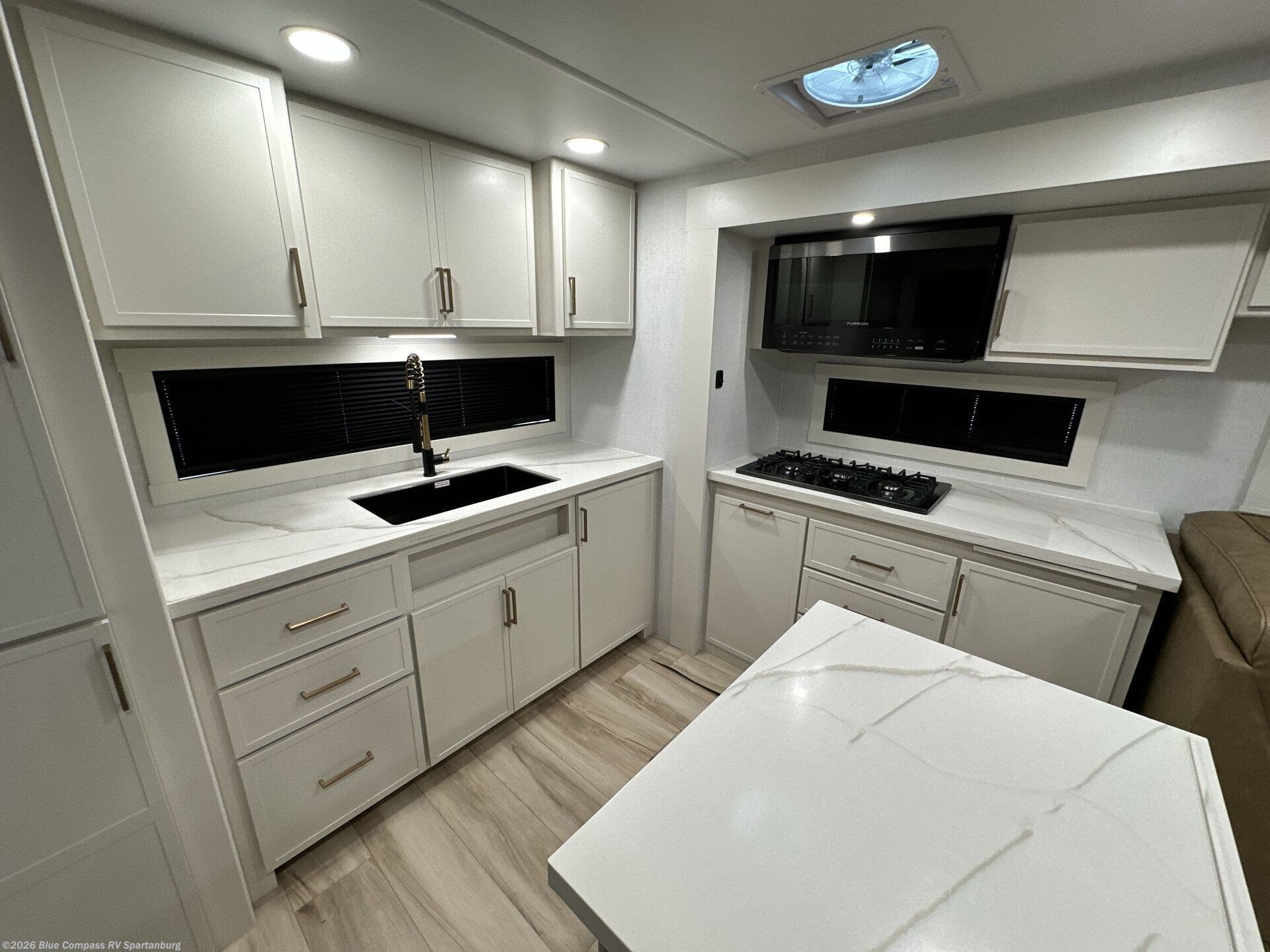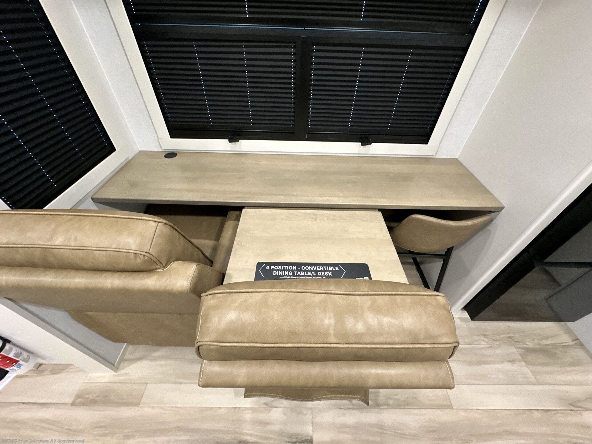 Savor the joy of cooking and sharing meals with loved ones in this beautifully appointed kitchen! This rear kitchen features a spacious pantry with drawers and outlets, a 30" convection microwave, a flip-up counter, and a 12V refrigerator. The convertible dining table and L-desk create a refined space for meals, work, and relaxation. The adjacent L-sofa forms a cozy sanctuary for reading, socializing, or enjoying the entertainment center and fireplace. There is a full bathroom with everything you need to keep your personal hygiene on the road. Plus, the front bedroom’s peaceful haven features a plush king bed, nightstands with storage, and a MaxSpace split-level wardrobe. Additionally, the two exterior awnings create a spacious outdoor living area, ideal for relaxing, entertaining, or enjoying the great outdoors.