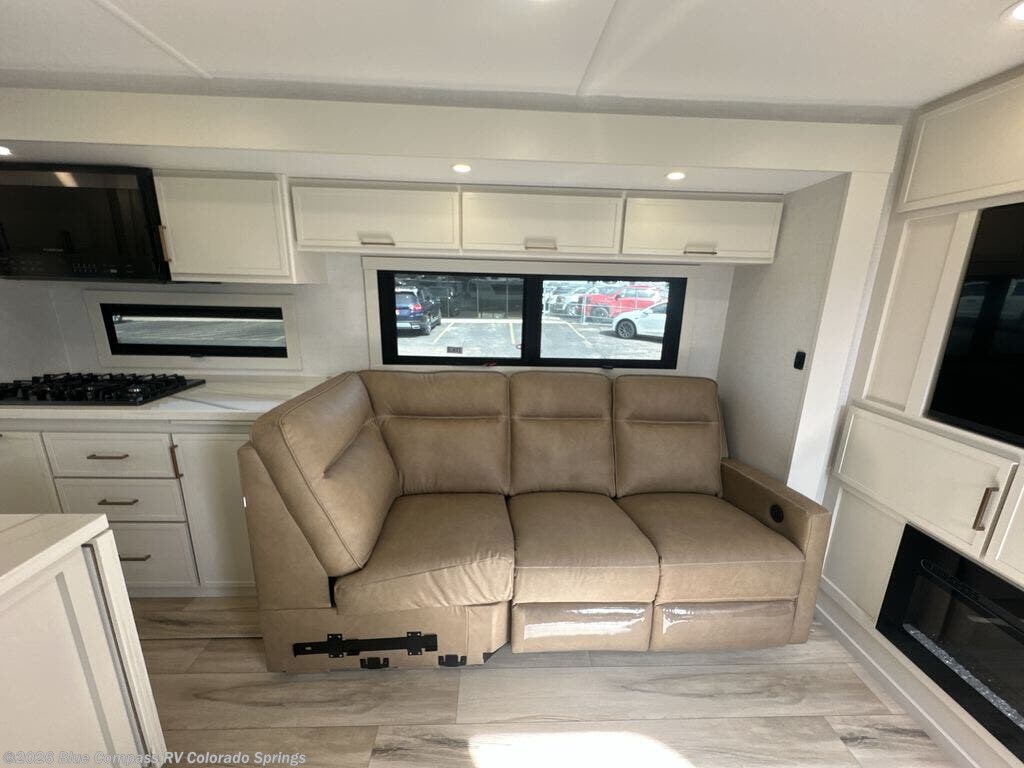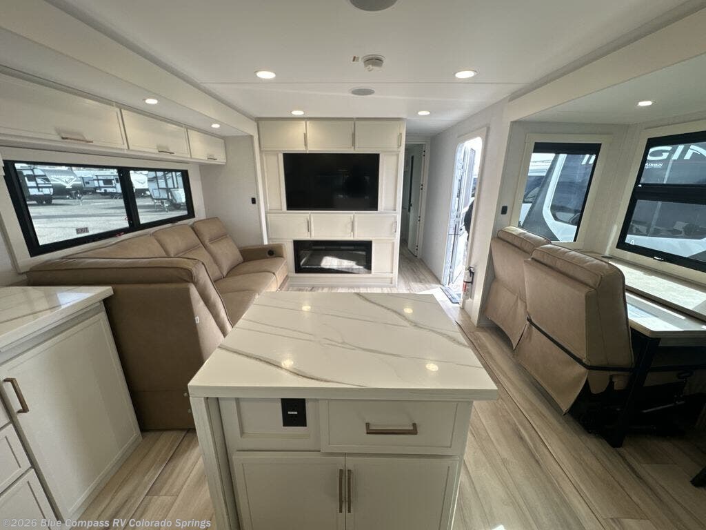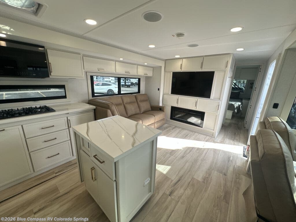 Savor the joy of cooking and sharing meals with loved ones in this beautifully appointed kitchen! This rear kitchen features a spacious pantry with drawers and outlets, a 30" convection microwave, a flip-up counter, and a 12V refrigerator. The convertible dining table and L-desk create a refined space for meals, work, and relaxation. The adjacent L-sofa forms a cozy sanctuary for reading, socializing, or enjoying the entertainment center and fireplace. There is a full bathroom with everything you need to keep your personal hygiene on the road. Plus, the front bedroom’s peaceful haven features a plush king bed, nightstands with storage, and a MaxSpace split-level wardrobe. Additionally, the two exterior awnings create a spacious outdoor living area, ideal for relaxing, entertaining, or enjoying the great outdoors.