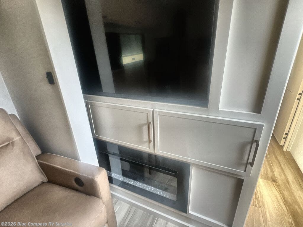 Savor the joy of cooking and sharing meals with loved ones in this beautifully appointed kitchen! This rear kitchen features a spacious pantry with drawers and outlets, a 30" convection microwave, a flip-up counter, and a 12V refrigerator. The convertible dining table and L-desk create a refined space for meals, work, and relaxation. The adjacent L-sofa forms a cozy sanctuary for reading, socializing, or enjoying the entertainment center and fireplace. There is a full bathroom with everything you need to keep your personal hygiene on the road. Plus, the front bedroom’s peaceful haven features a plush king bed, nightstands with storage, and a MaxSpace split-level wardrobe. Additionally, the two exterior awnings create a spacious outdoor living area, ideal for relaxing, entertaining, or enjoying the great outdoors.