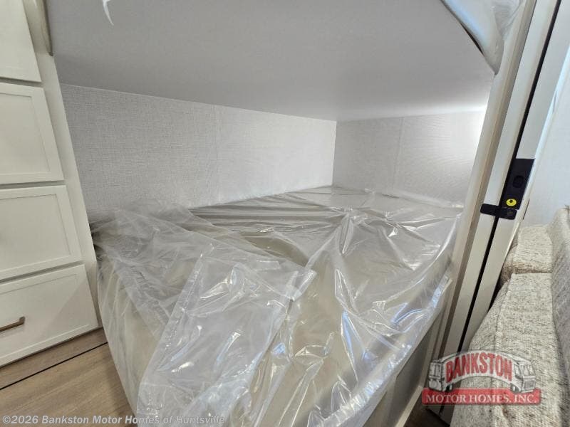 Grab the whole gang and head to the campground in this bunkhouse travel trailer! The 48" x 74" bunks can sleep two to four, and there is a floor to ceiling storage cabinet with drawers, a top bunk window, outlets and USB ports, plus double space-saving pocket doors. Up front you'll find the master bedroom with a 66" x 80" king bed and a MaxSpace Split-Level Wardrobe, TV prep, your own exterior entry door, plus quick access to the walk-thru bath. Everyone can meet in the combined kitchen and living room to relax on the theater seating or tri-fold sofa, and there is pull-out dining table with a drawer and a window above for great outdoor views. The outside is just as accommodating as the inside with its exterior speakers, LED chassis lighting, rear storage compartment with dual access doors, and exterior 12V refrigerator for cold drinks!