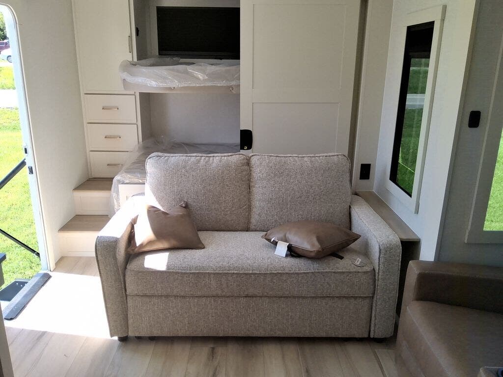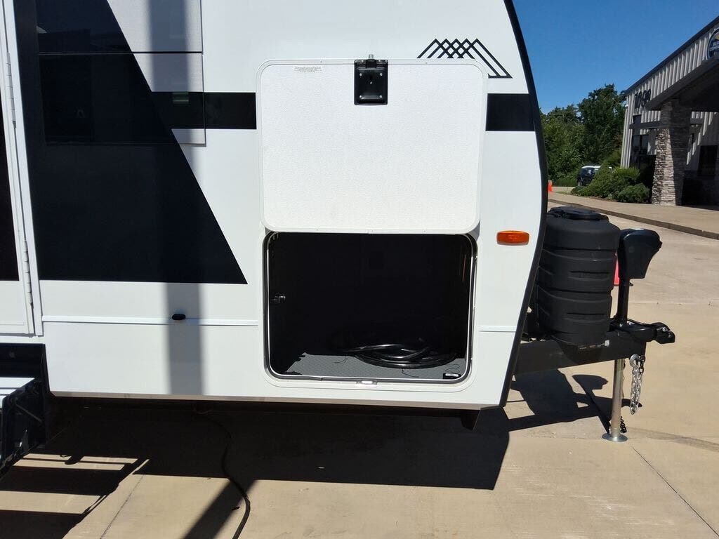 Grab the whole gang and head to the campground in this bunkhouse travel trailer! The 48" x 74" bunks can sleep two to four, and there is a floor to ceiling storage cabinet with drawers, a top bunk window, outlets and USB ports, plus double space-saving pocket doors. Up front you'll find the master bedroom with a 66" x 80" king bed and a MaxSpace Split-Level Wardrobe, TV prep, your own exterior entry door, plus quick access to the walk-thru bath. Everyone can meet in the combined kitchen and living room to relax on the theater seating or tri-fold sofa, and there is pull-out dining table with a drawer and a window above for great outdoor views. The outside is just as accommodating as the inside with its exterior speakers, LED chassis lighting, rear storage compartment with dual access doors, and exterior 12V refrigerator for cold drinks!