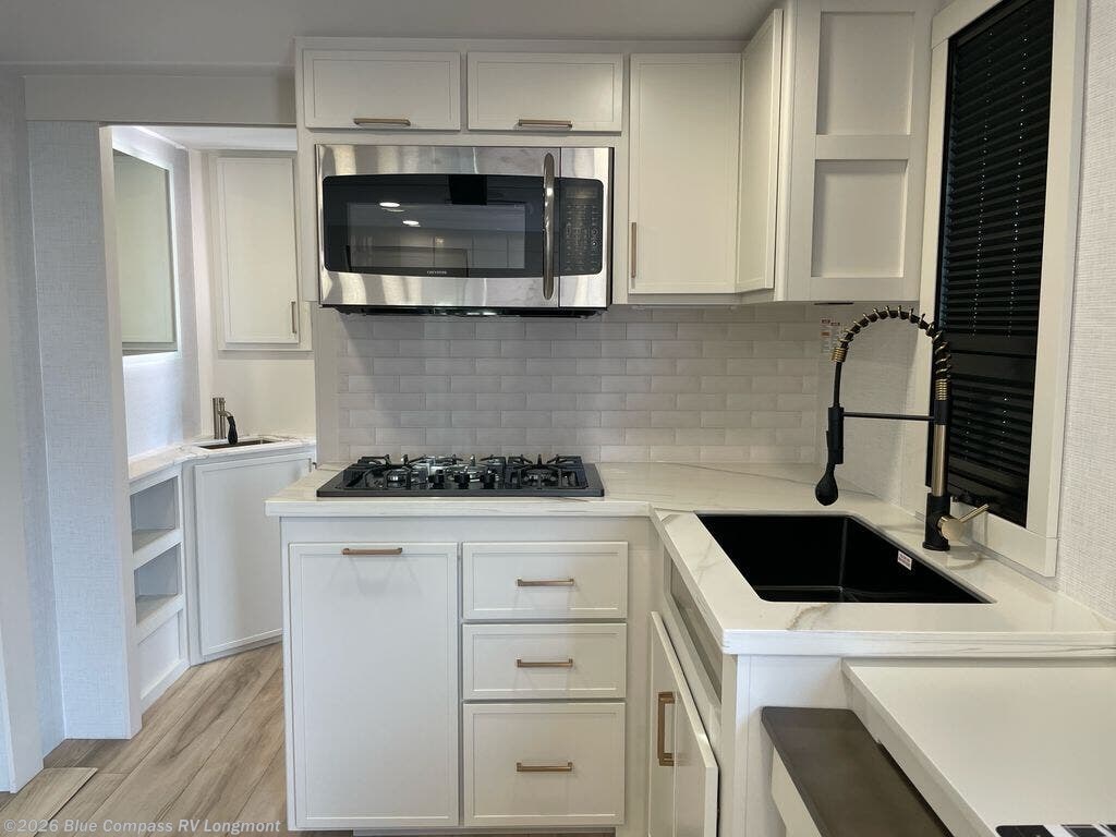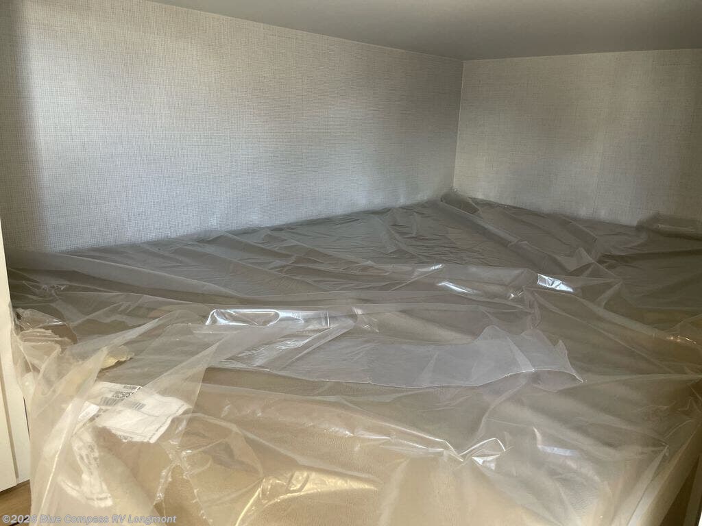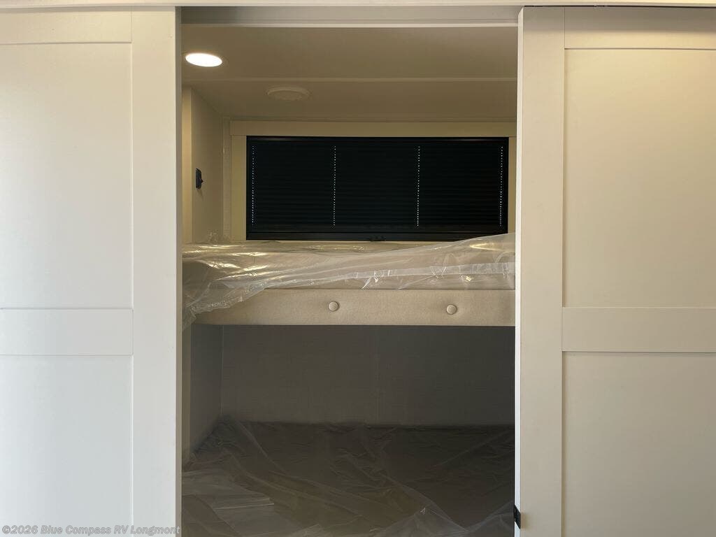 Grab the whole gang and head to the campground in this bunkhouse travel trailer! The 48" x 74" bunks can sleep two to four, and there is a floor to ceiling storage cabinet with drawers, a top bunk window, outlets and USB ports, plus double space-saving pocket doors. Up front you'll find the master bedroom with a 66" x 80" king bed and a MaxSpace Split-Level Wardrobe, TV prep, your own exterior entry door, plus quick access to the walk-thru bath. Everyone can meet in the combined kitchen and living room to relax on the theater seating or tri-fold sofa, and there is pull-out dining table with a drawer and a window above for great outdoor views. The outside is just as accommodating as the inside with its exterior speakers, LED chassis lighting, rear storage compartment with dual access doors, and exterior 12V refrigerator for cold drinks!