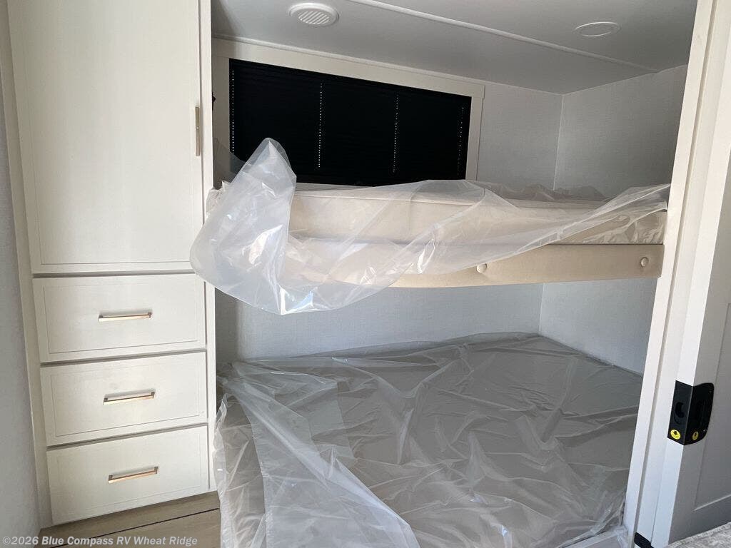 Grab the whole gang and head to the campground in this bunkhouse travel trailer! The 48" x 74" bunks can sleep two to four, and there is a floor to ceiling storage cabinet with drawers, a top bunk window, outlets and USB ports, plus double space-saving pocket doors. Up front you'll find the master bedroom with a 66" x 80" king bed and a MaxSpace Split-Level Wardrobe, TV prep, your own exterior entry door, plus quick access to the walk-thru bath. Everyone can meet in the combined kitchen and living room to relax on the theater seating or tri-fold sofa, and there is pull-out dining table with a drawer and a window above for great outdoor views. The outside is just as accommodating as the inside with its exterior speakers, LED chassis lighting, rear storage compartment with dual access doors, and exterior 12V refrigerator for cold drinks!