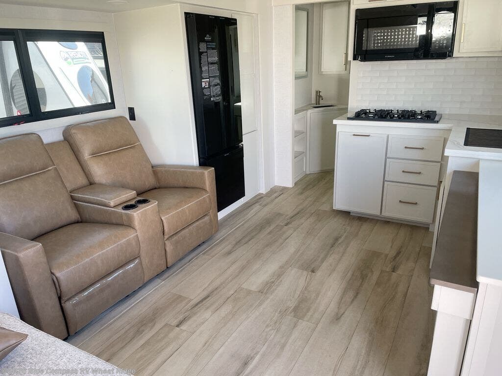 Measuring just under 35 feet, the Brinkley Model I 294 is an innovative floorplan designed for family comfort and flexibility. It features the convenience of a second entry, a spacious residential Bamboo memory foam king bed, and a family-friendly conversational seating area perfect for gathering. The highlight is the versatile rear bunkhouse, which features double sliding doors that can be closed for privacy or opened to seamlessly extend the main living space. Abundant and intelligent storage solutions are thoughtfully integrated throughout.