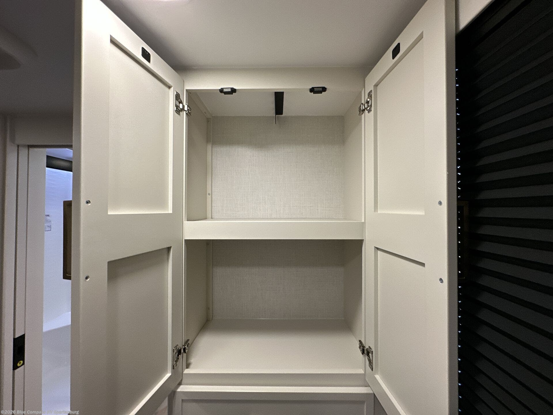 Grab the whole gang and head to the campground in this bunkhouse travel trailer! The 48" x 74" bunks can sleep two to four, and there is a floor to ceiling storage cabinet with drawers, a top bunk window, outlets and USB ports, plus double space-saving pocket doors. Up front you'll find the master bedroom with a 66" x 80" king bed and a MaxSpace Split-Level Wardrobe, TV prep, your own exterior entry door, plus quick access to the walk-thru bath. Everyone can meet in the combined kitchen and living room to relax on the theater seating or tri-fold sofa, and there is pull-out dining table with a drawer and a window above for great outdoor views. The outside is just as accommodating as the inside with its exterior speakers, LED chassis lighting, rear storage compartment with dual access doors, and exterior 12V refrigerator for cold drinks!