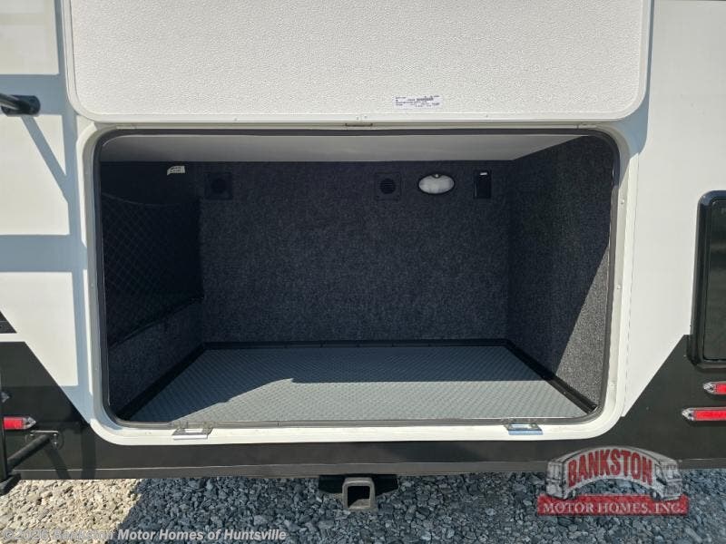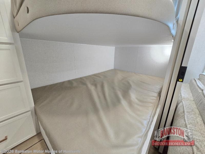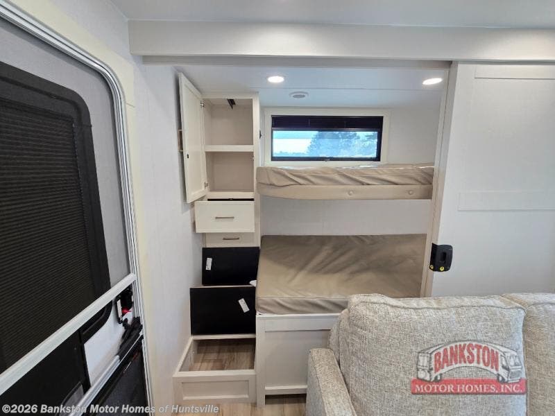 Grab the whole gang and head to the campground in this bunkhouse travel trailer! The 48" x 74" bunks can sleep two to four, and there is a floor to ceiling storage cabinet with drawers, a top bunk window, outlets and USB ports, plus double space-saving pocket doors. Up front you'll find the master bedroom with a 66" x 80" king bed and a MaxSpace Split-Level Wardrobe, TV prep, your own exterior entry door, plus quick access to the walk-thru bath. Everyone can meet in the combined kitchen and living room to relax on the theater seating or tri-fold sofa, and there is pull-out dining table with a drawer and a window above for great outdoor views. The outside is just as accommodating as the inside with its exterior speakers, LED chassis lighting, rear storage compartment with dual access doors, and exterior 12V refrigerator for cold drinks!