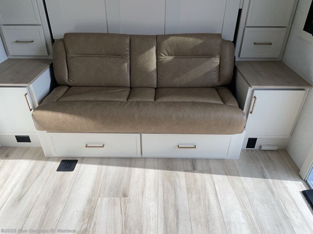 This is the perfect travel trailer for the couple looking for comfort at the campground! Once you've unloaded the pass-thru storage, you can put out the 16' patio awning and relax in your camp chairs. Head inside to make lunch in the fully equipped kitchen that includes a three-burner range, 30" convection microwave, and dishwasher prep. There is a pantry with outlets within the large slide out, along with a 10-cu. ft. refrigerator, plus theater seating across from the TV. And if you need sleeping space for guests, just choose the optional tri-fold sofa in place of the theater seating! You'll appreciate the front sofa plus a Feather-Lift bed system, providing seating space during the day and sleeping space at night! A pull-out table with a drawer provides a place to dine together, and a full bath on board will let you freshen up each day.