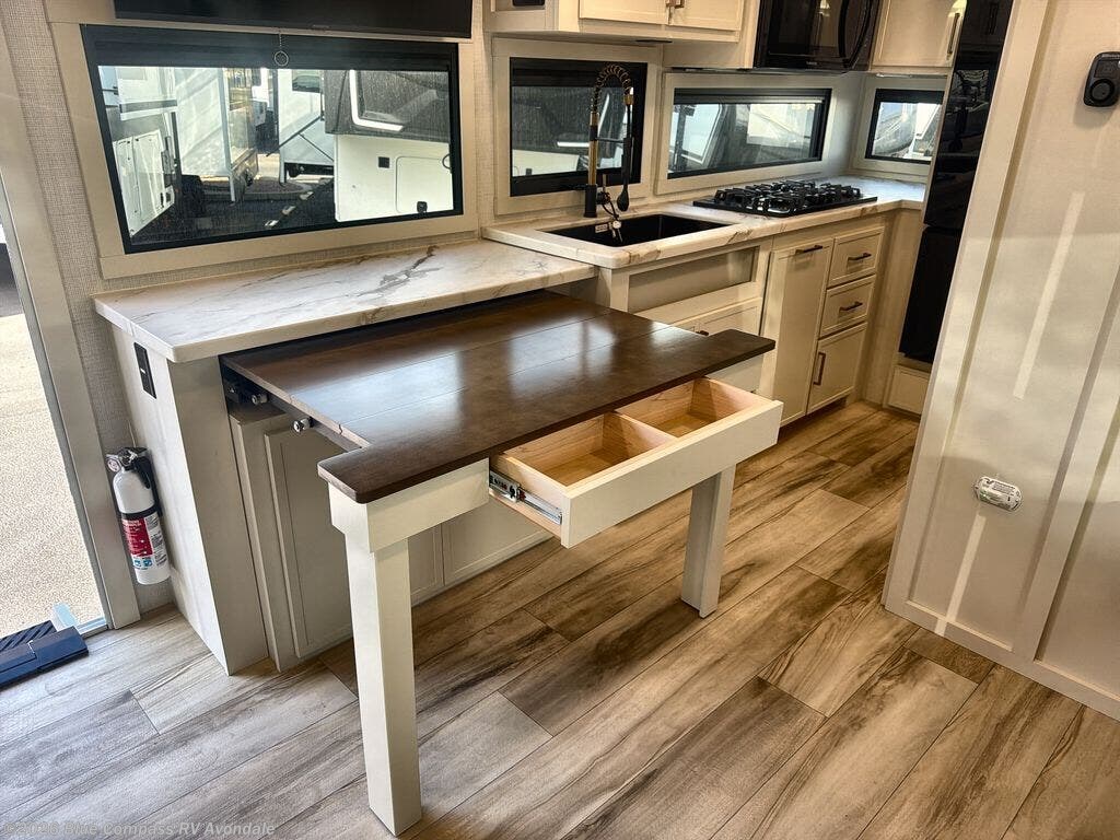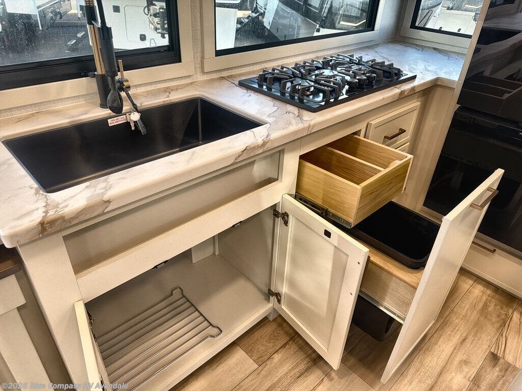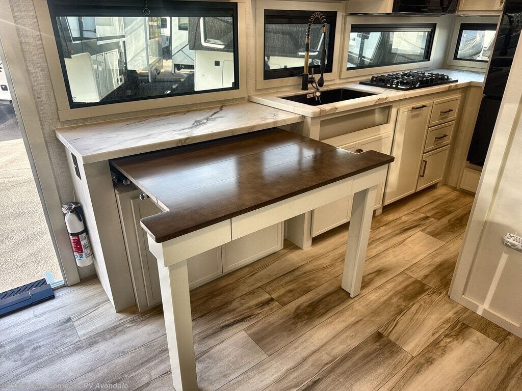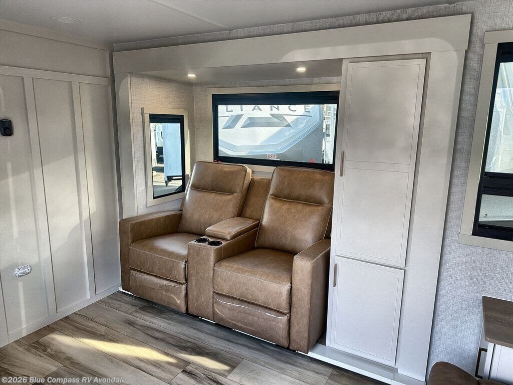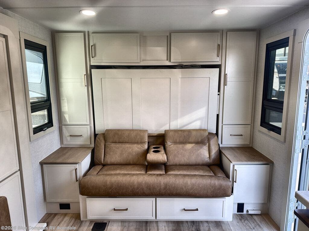 This is the perfect travel trailer for the couple looking for comfort at the campground! Once you've unloaded the pass-thru storage, you can put out the 16' patio awning and relax in your camp chairs. Head inside to make lunch in the fully equipped kitchen that includes a three-burner range, 30" convection microwave, and dishwasher prep. There is a pantry with outlets within the large slide out, along with a 10-cu. ft. refrigerator, plus theater seating across from the TV. And if you need sleeping space for guests, just choose the optional tri-fold sofa in place of the theater seating! You'll appreciate the front sofa plus a Feather-Lift bed system, providing seating space during the day and sleeping space at night! A pull-out table with a drawer provides a place to dine together, and a full bath on board will let you freshen up each day.